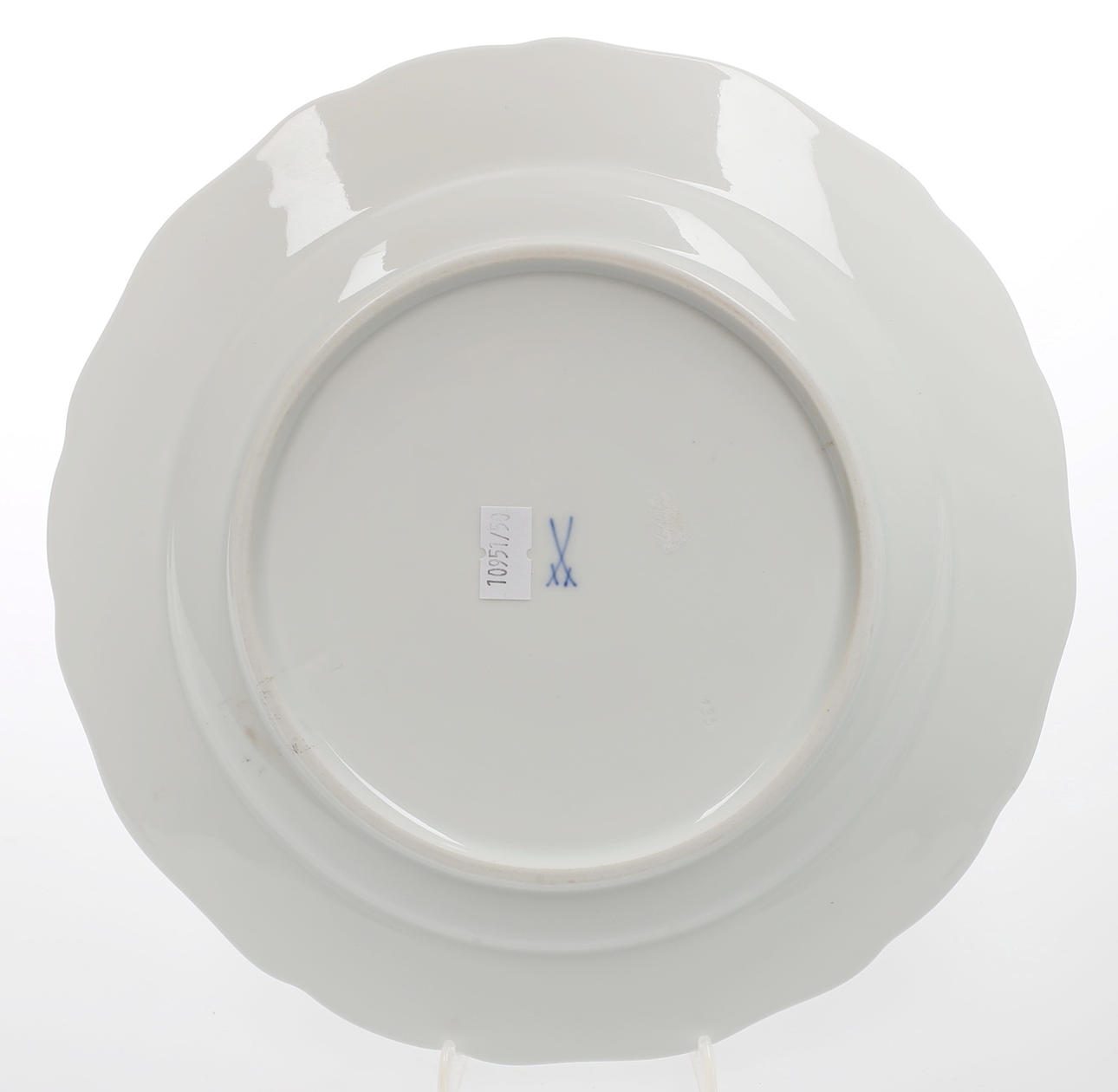 ”Neuer Ausschnitt.” Flagga med blommig målning av ljung, björnbär och förgätmigej, grön kant. Ljust målade, ovanlig skildring av en bäver på en flod. Meissen svärdmärke, efter 1934. 1. val. Diameter 25 cm.