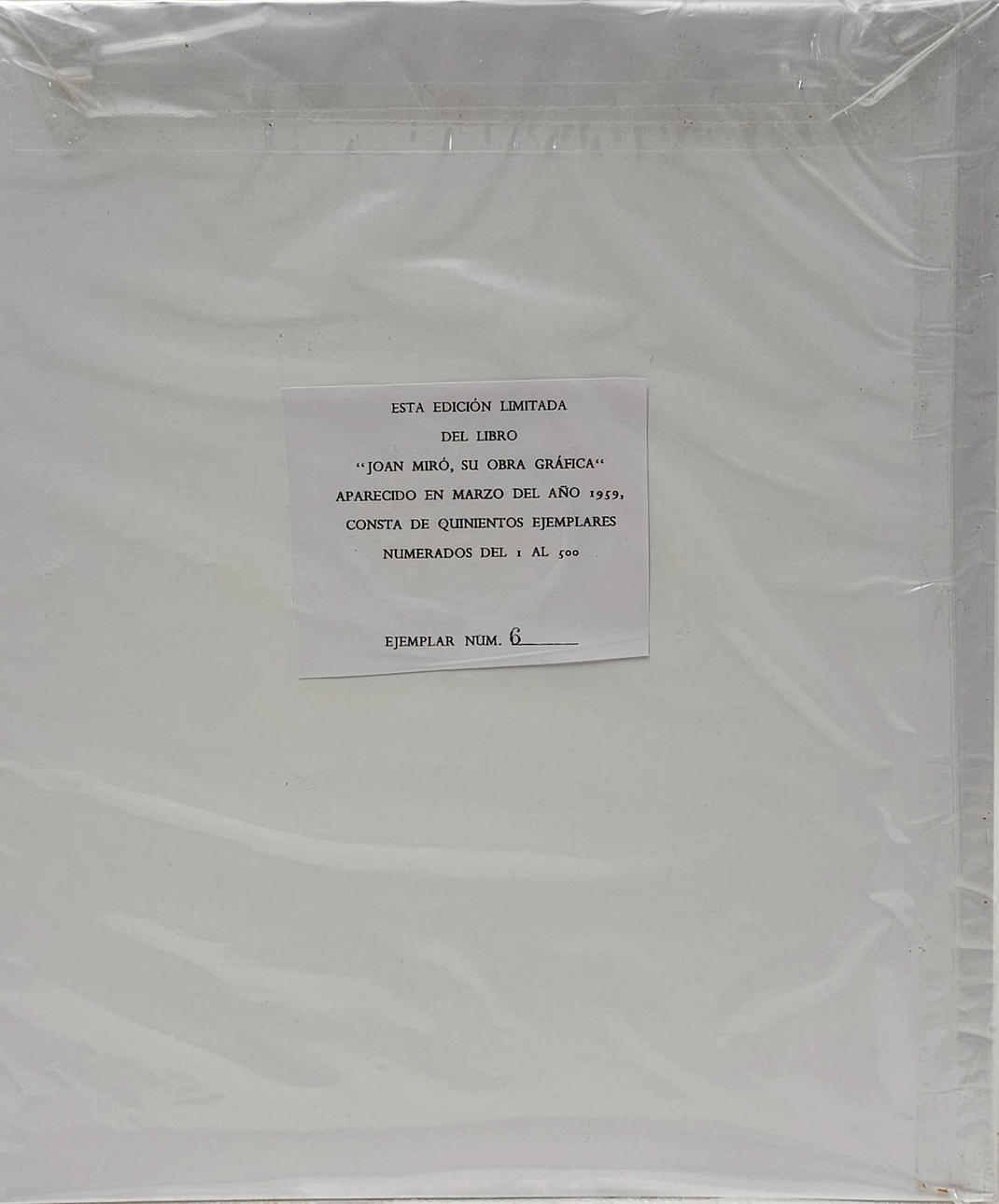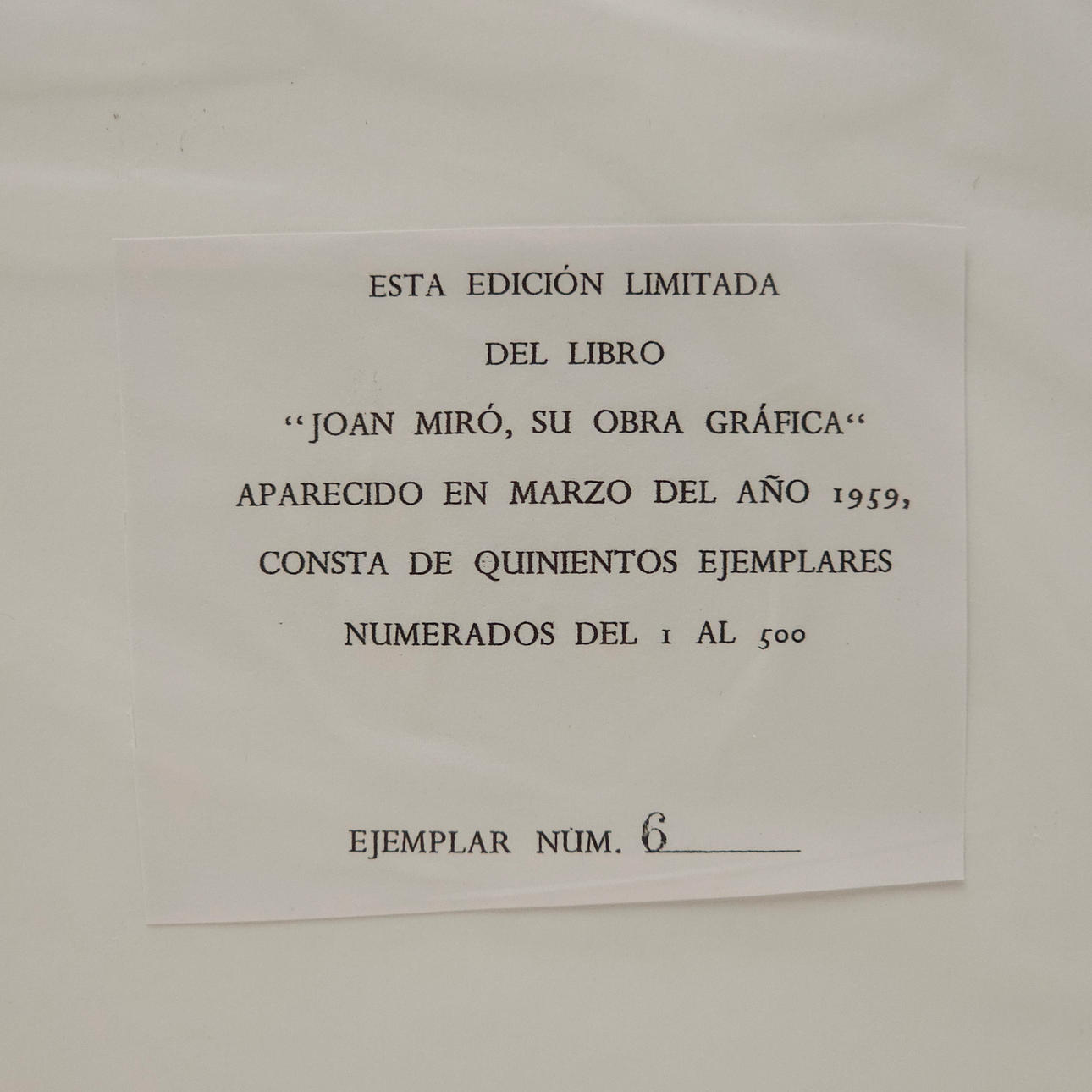 Från boken ”Joan Miró, hans grafiska arbete” nummer 6/500 exemplar. Denna offsetlitografi är en del av bok nummer 6/500.