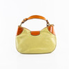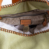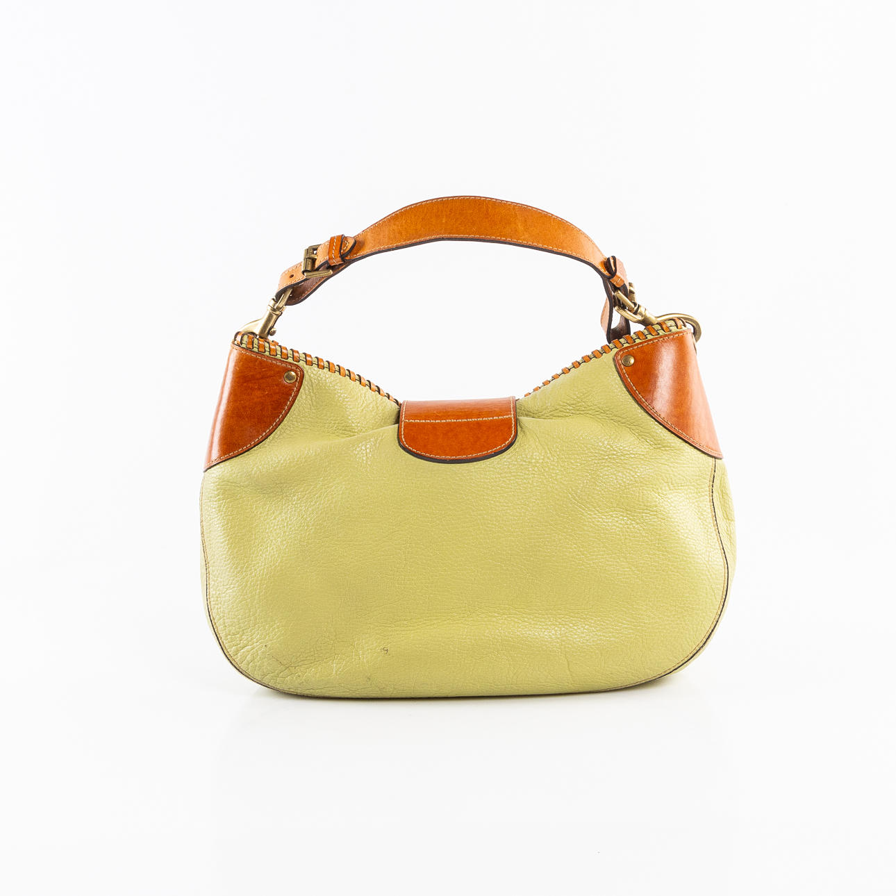 i lindblomsgrönt skinn och brunt läder. Vrislås samt axelrem med karbin i mässingsfärgad metall. Märkt MULBERRY samt plakettmärkt. Invändligt beiget fodertyg med mullbärsträd. En blixtlåsförsedd sidoficka. Ca 36x28x11. Axelrem drop ca 18 cm.