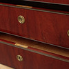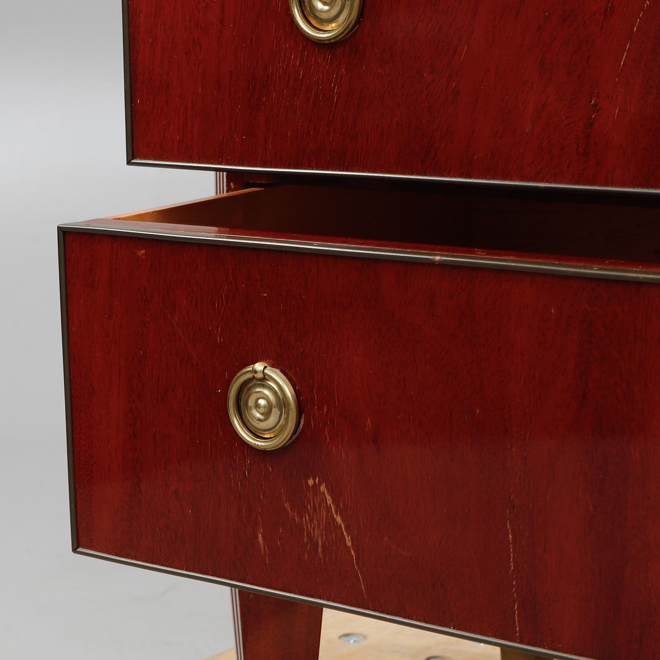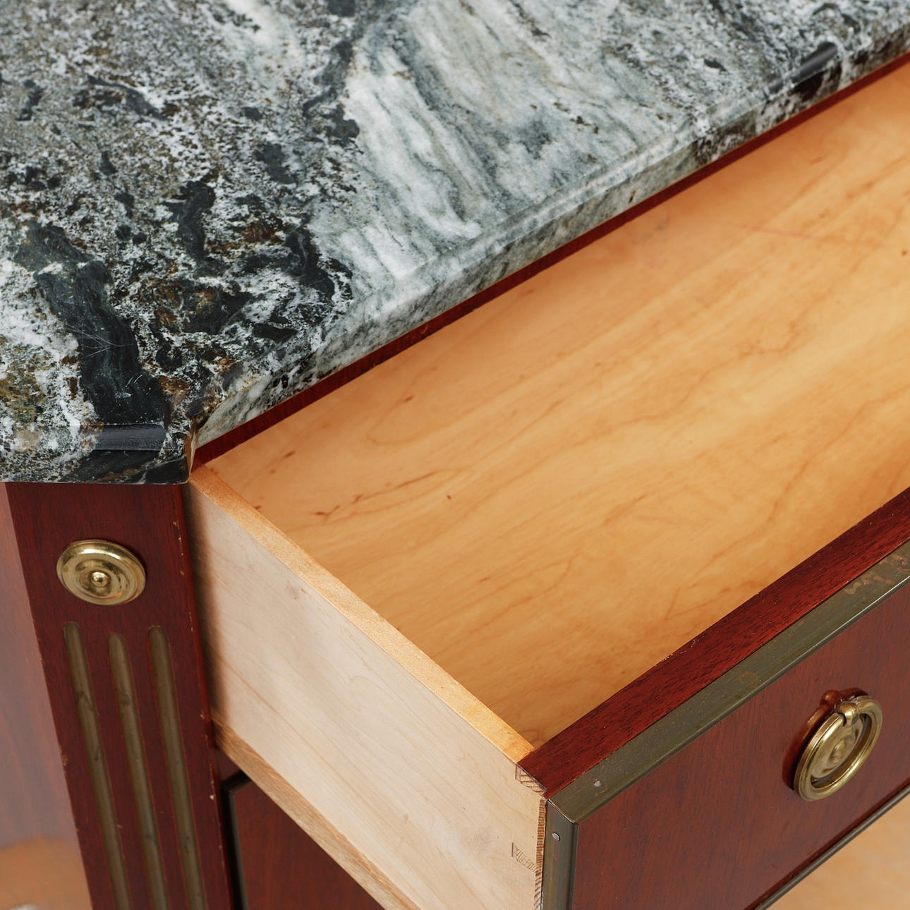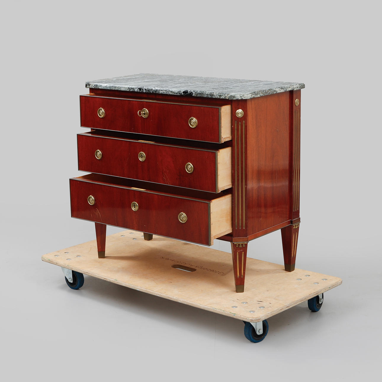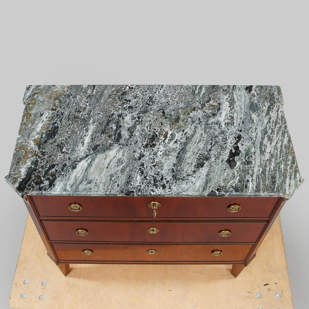 Mahognyfanér, beslag i gulmetall, lös stenskiva. Längd ca 86, djup ca 42, höjd ca 78 cm.