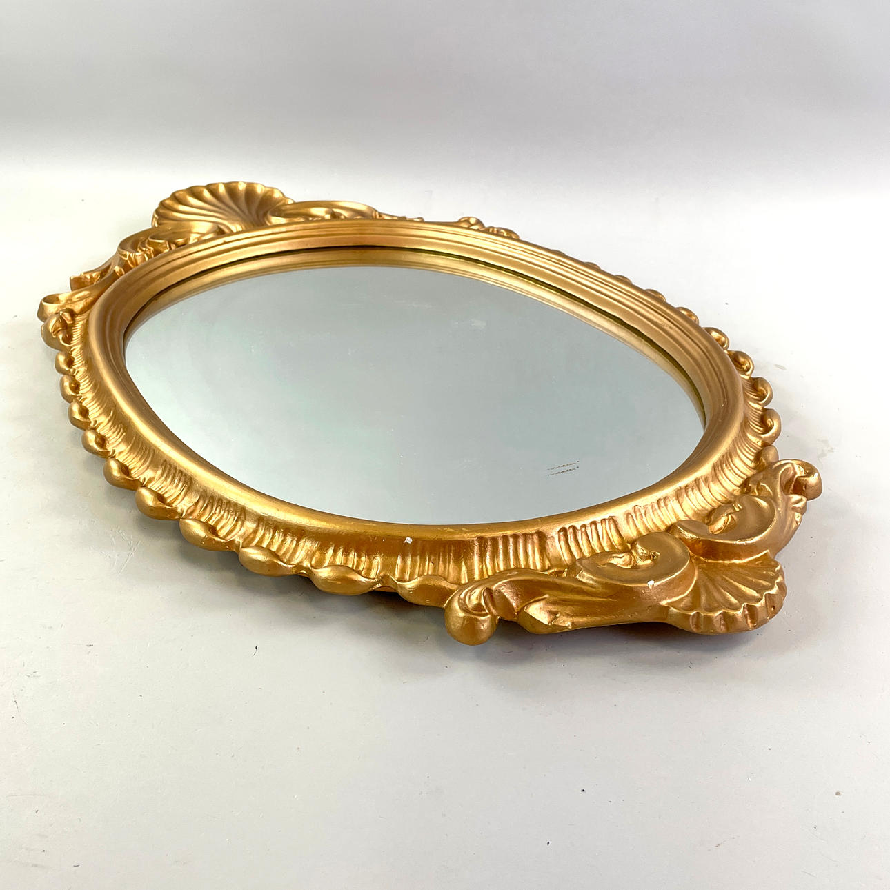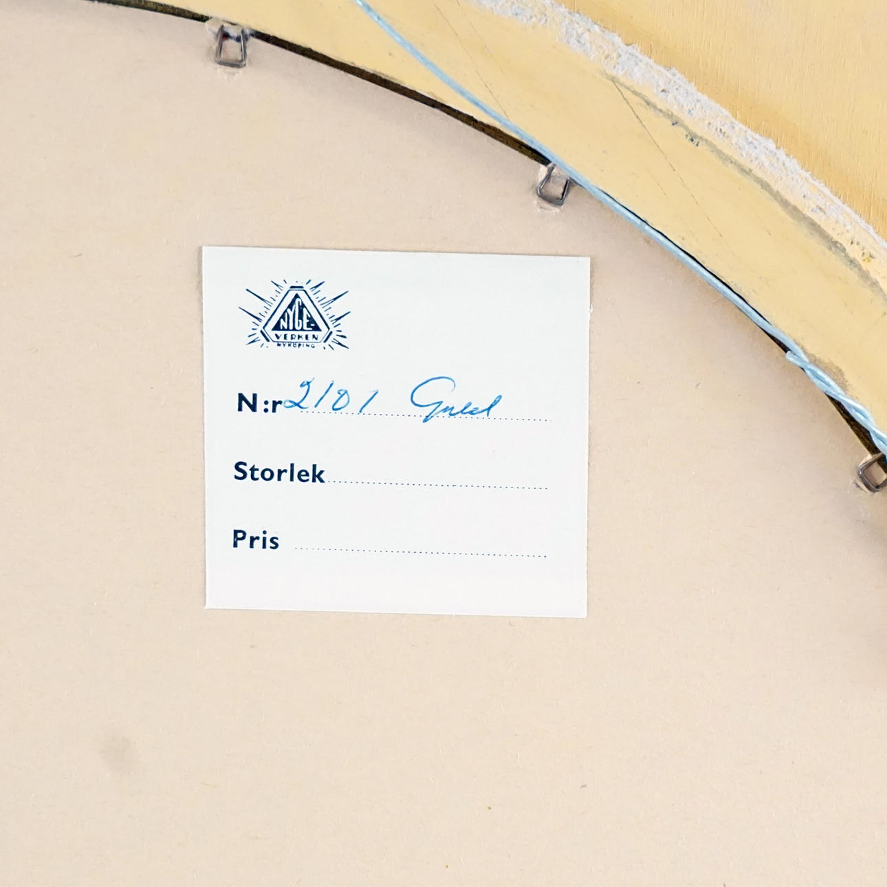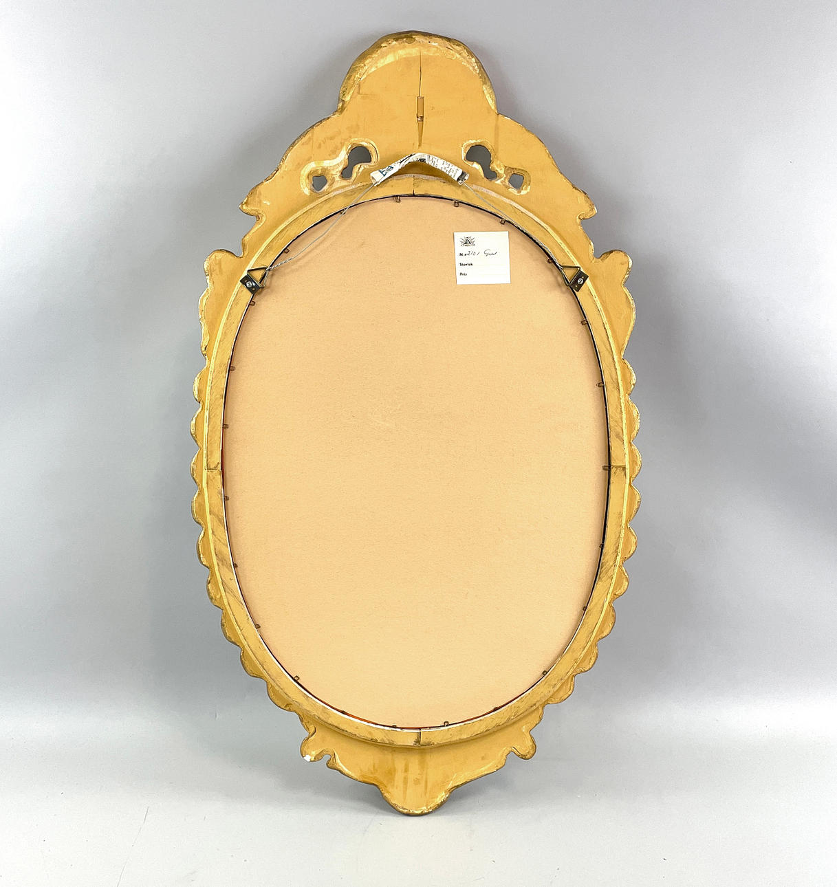 Spegel Nygeverken Nyköping, 1900-tal Höjd 81 cm, bredd 46,5 cm . Etikettmärkt baksidan "Nyge-verken Nyköping, Nr 2101 Guld".