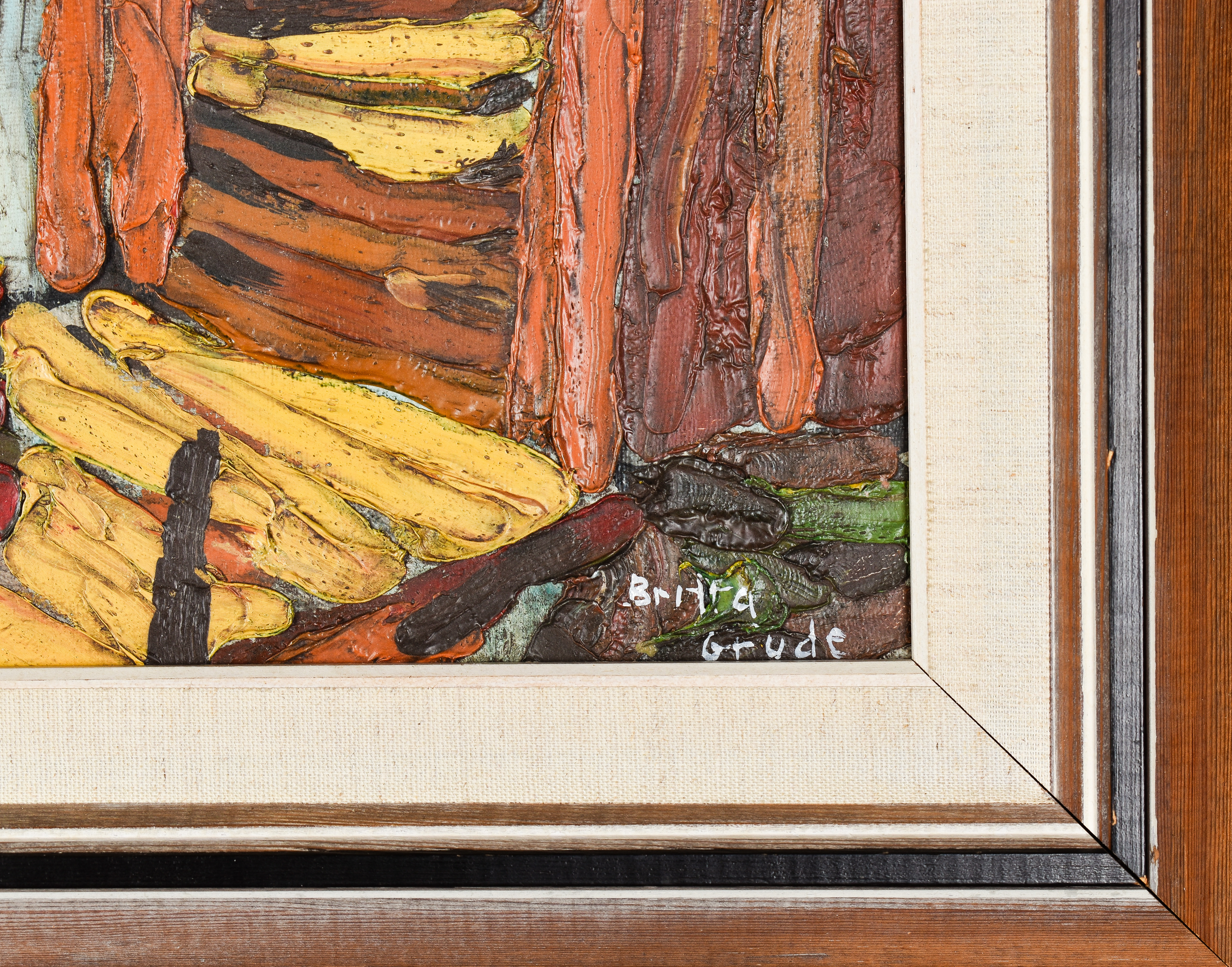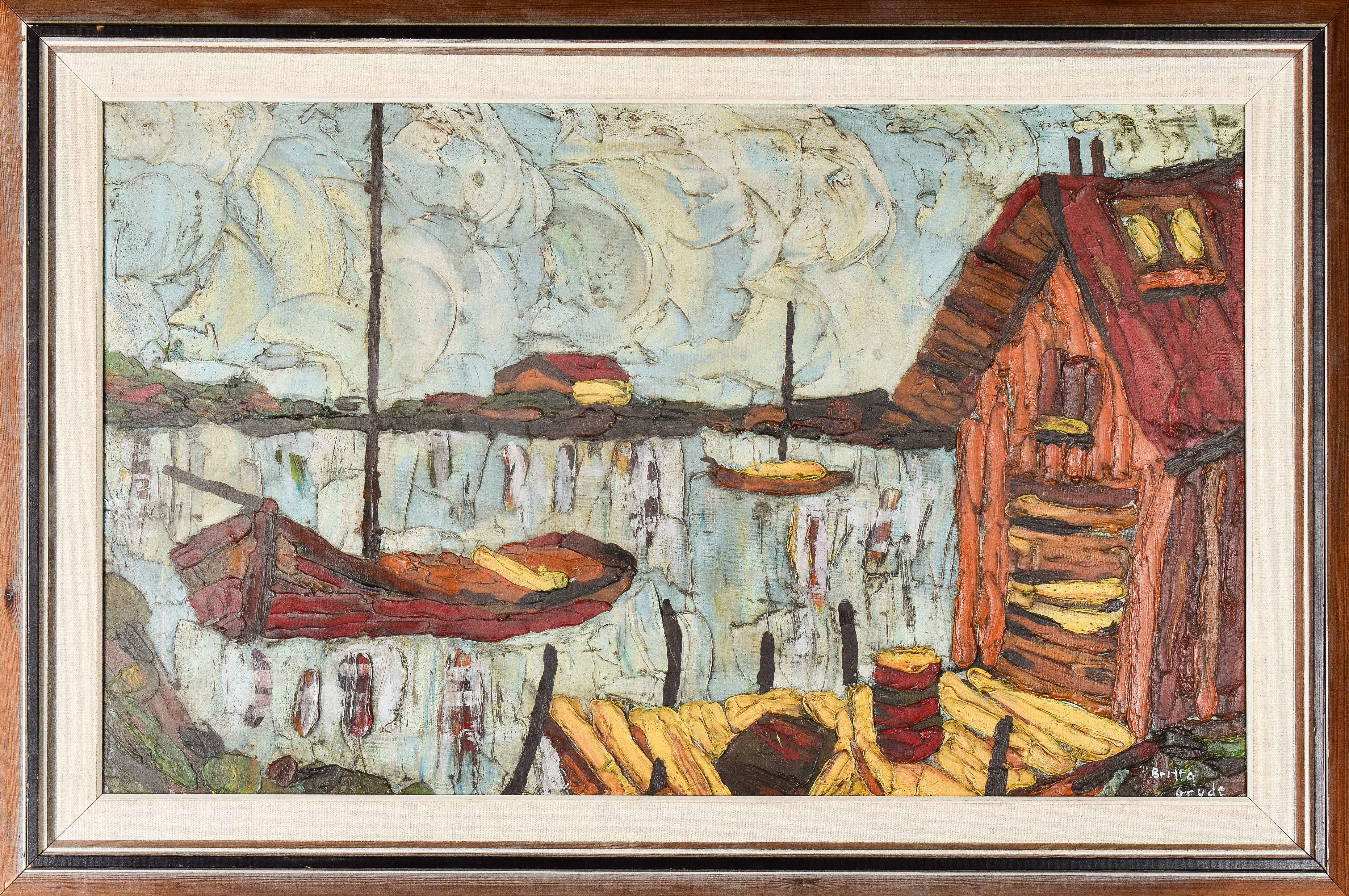 3764821. SKÄNKES BRITTA GRUDE. OLJA PÅ DUK, SIGNERAD, BÅTAR I HAMN.