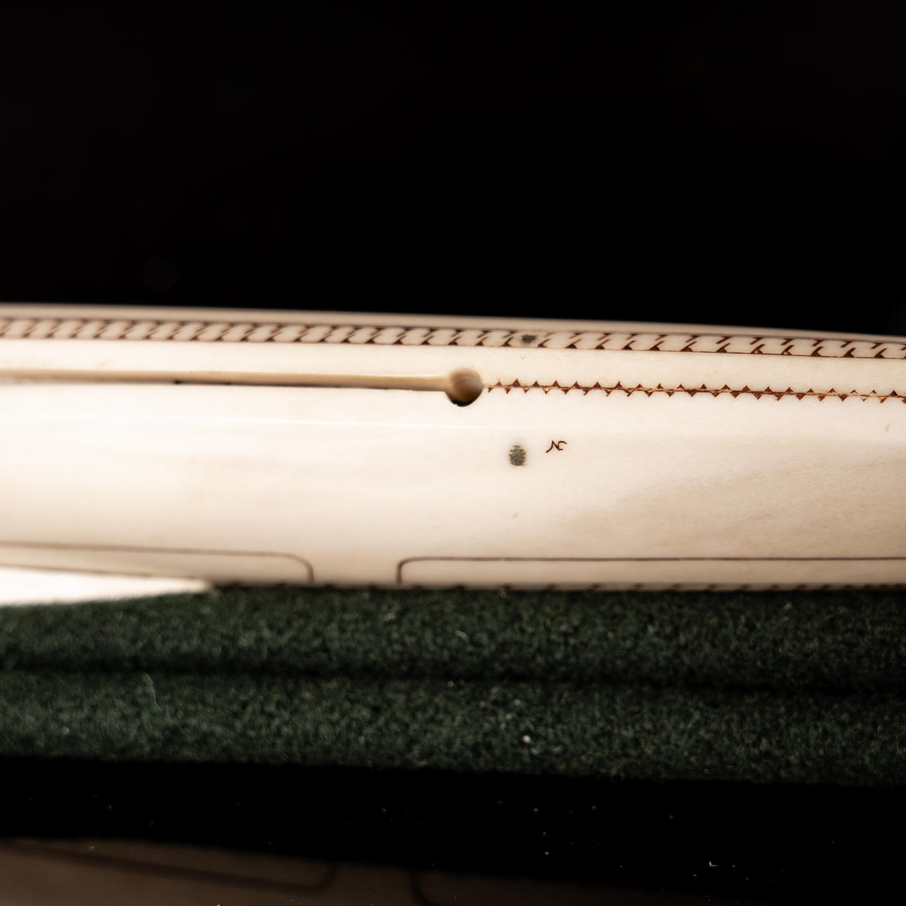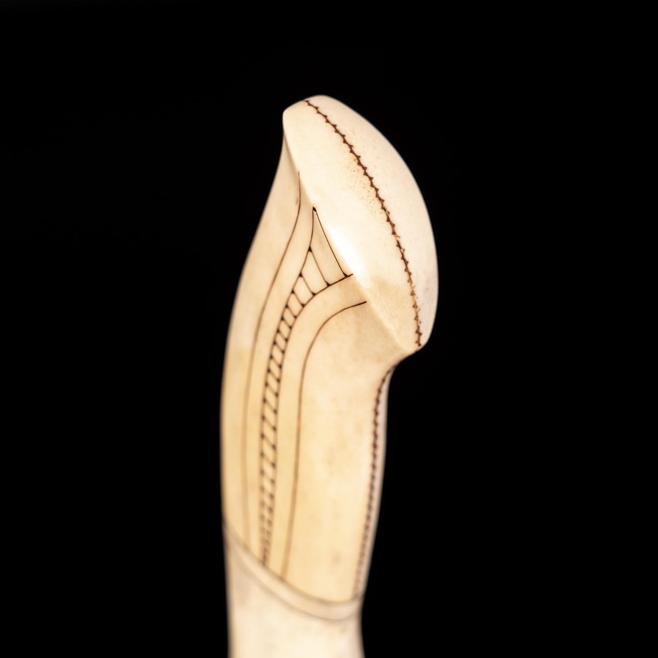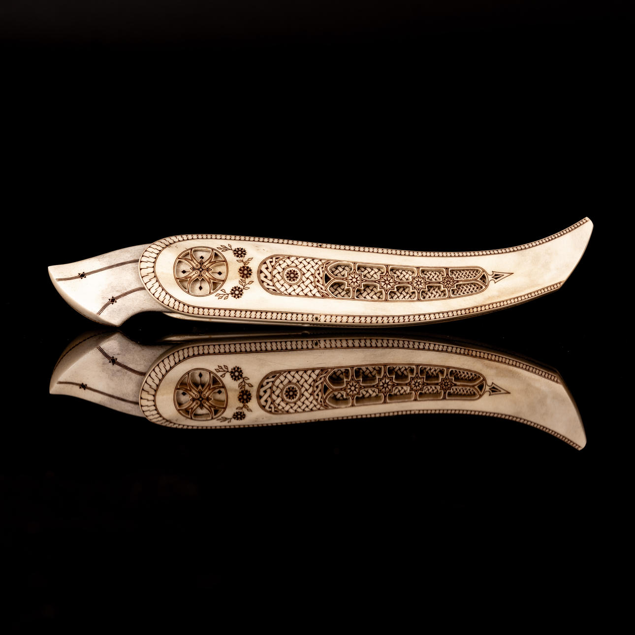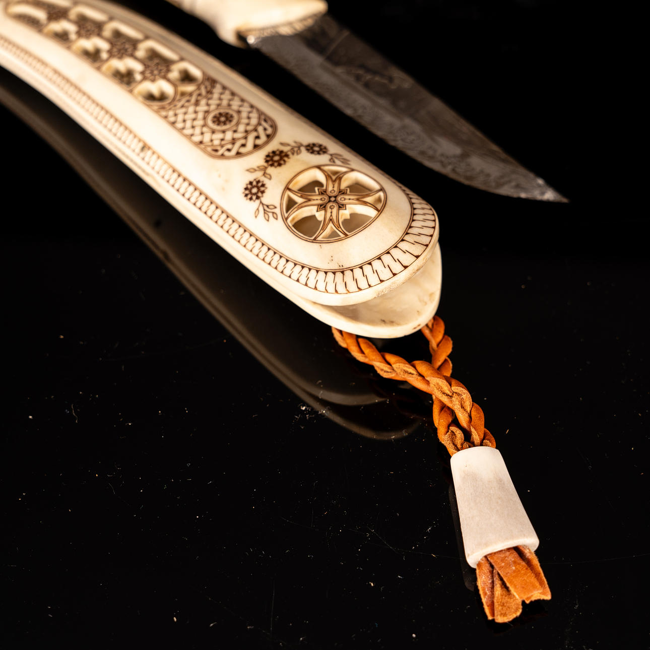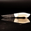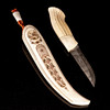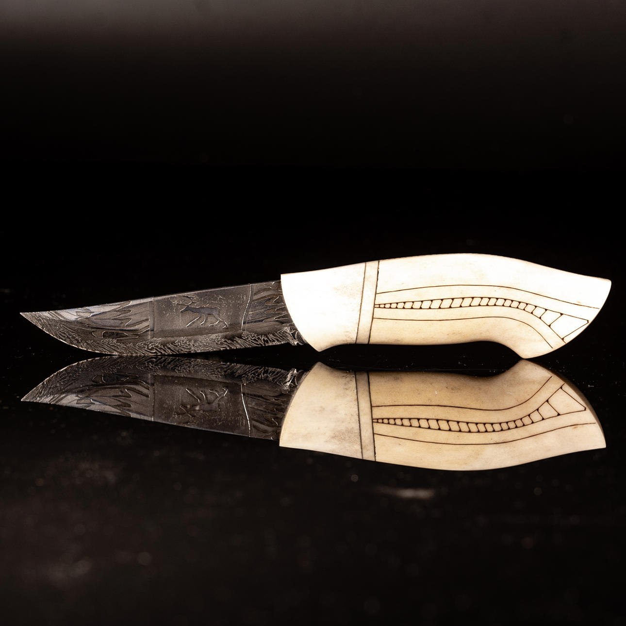 Kniv tillverkad av rikligt graverat renhorn, mosaikdamaskblad tillverkat av Mattias Styrefors. Monogramsignerad: JN