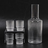 16 st glas, ca 6 cm höga med en diameter på ca 5 cm. 1 st karaff, ca 24 cm hög.