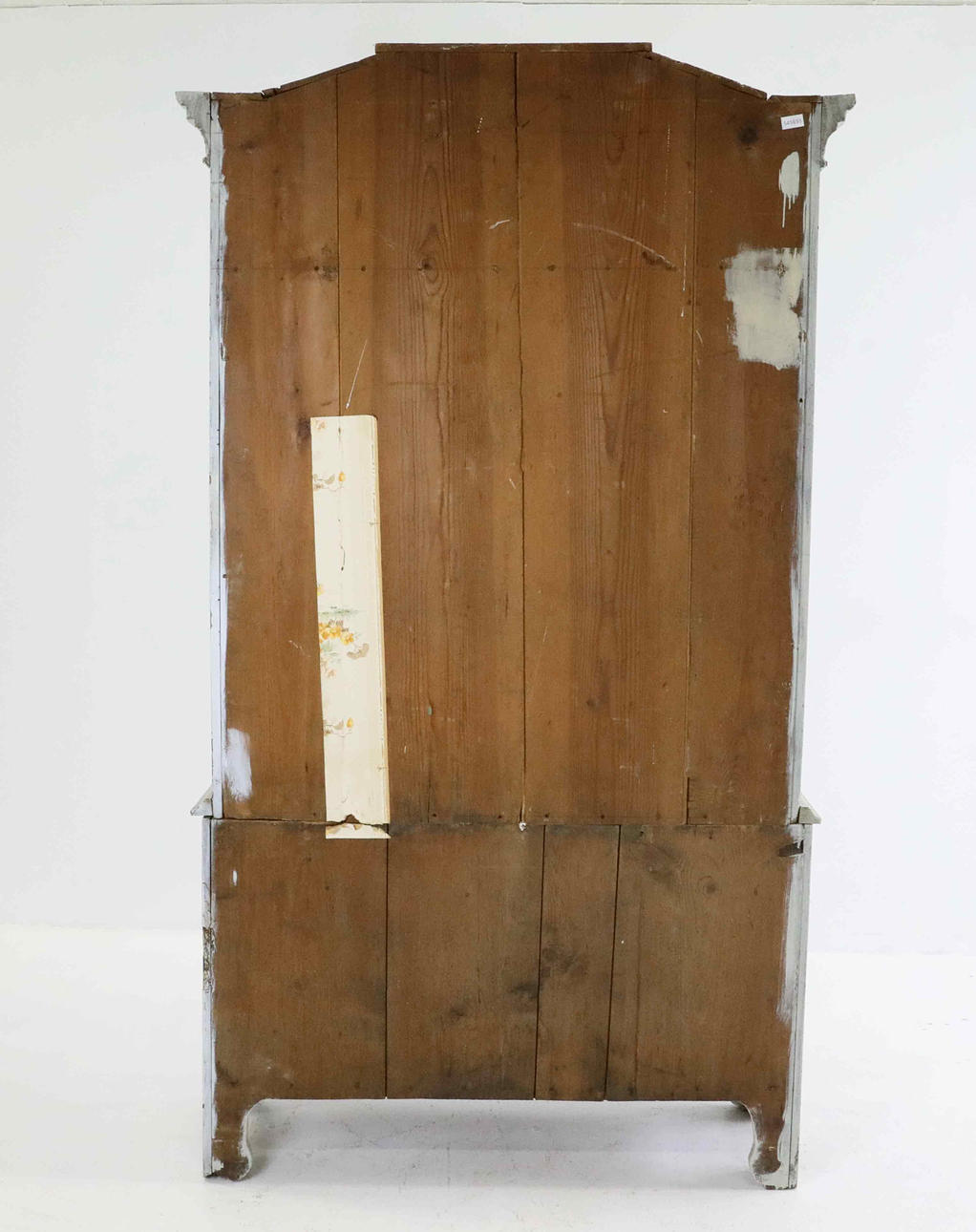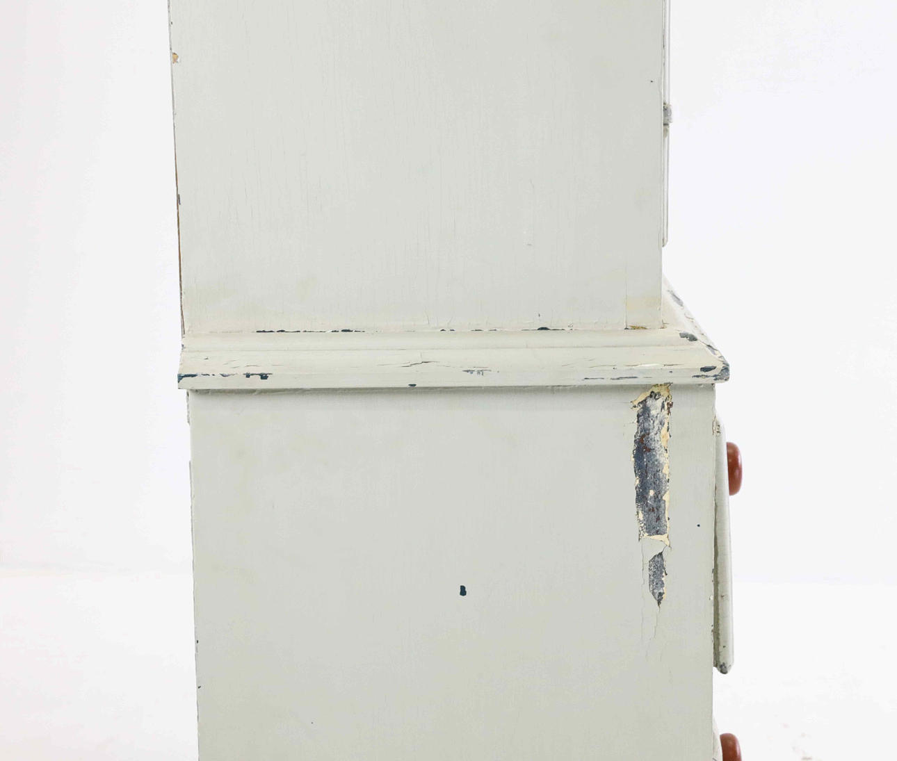 Ålders och bruksslitage, färgflagor/krackeleringar, märken, flisor ur, sprickor, fläckar, repor, skav. Senare målat. Ytsmuts.