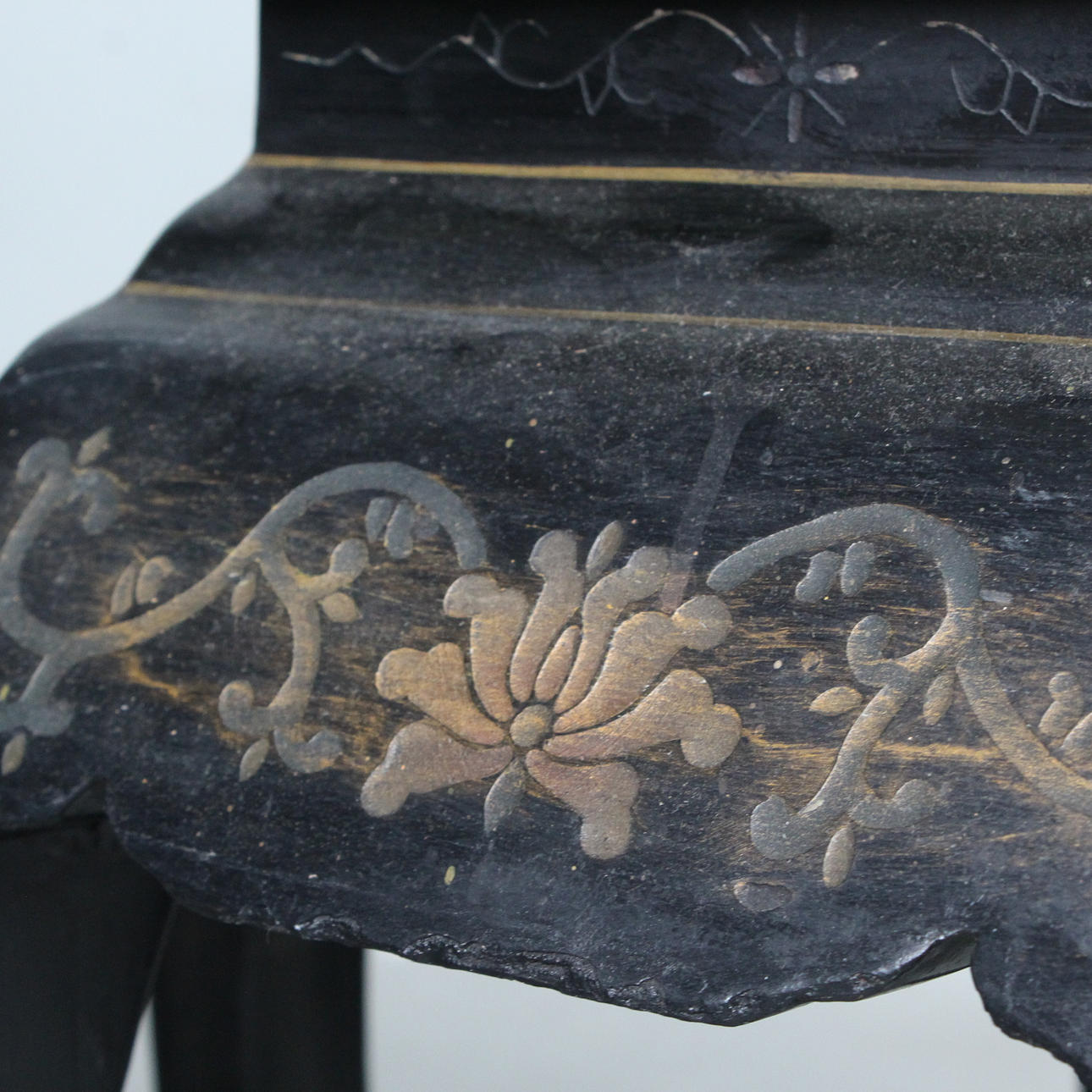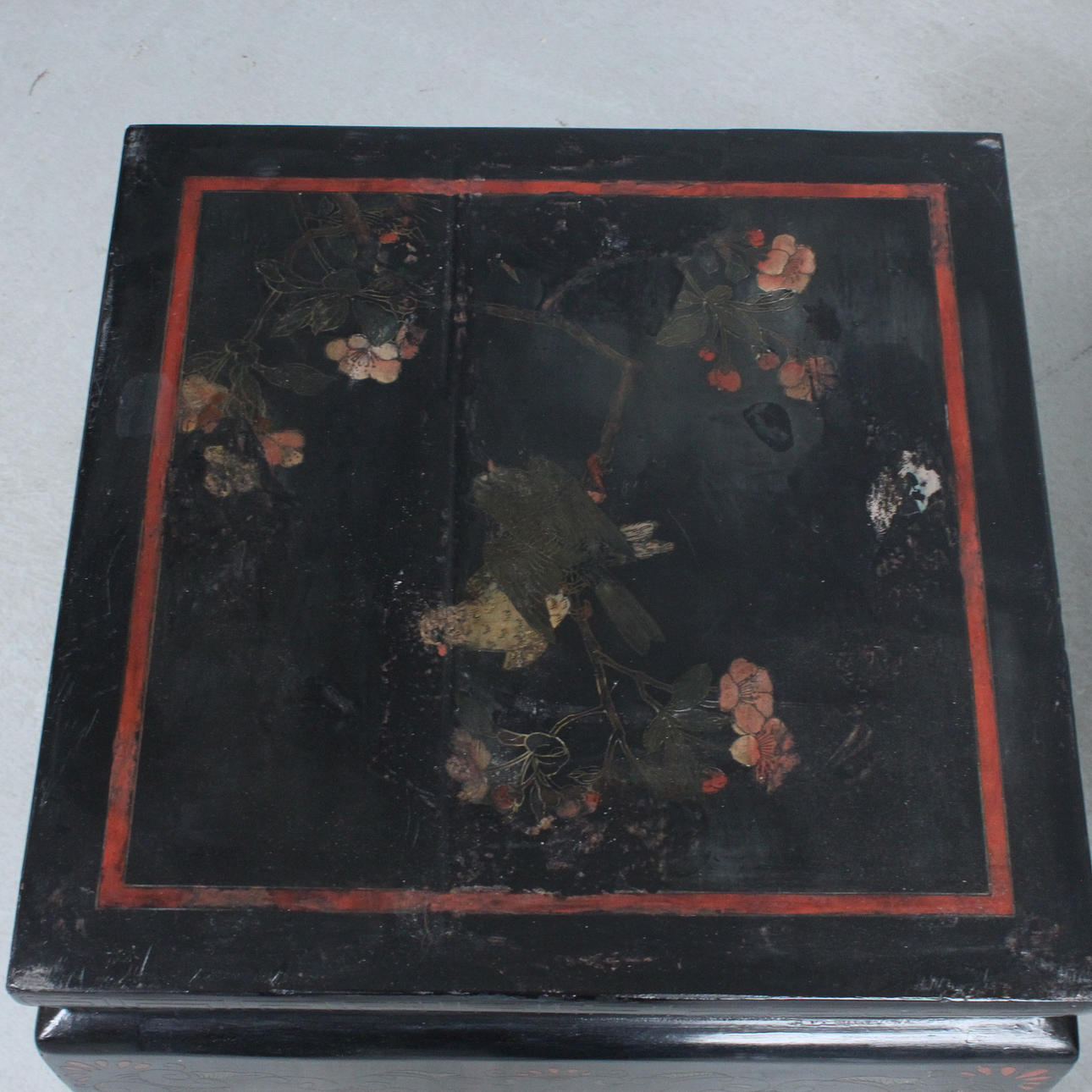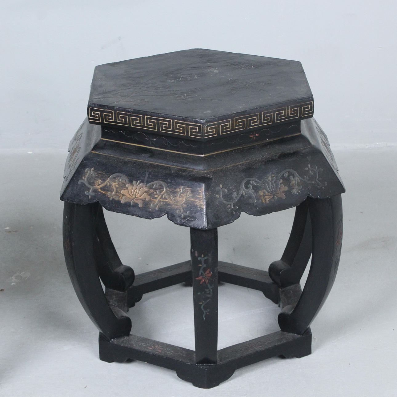 Två kinesiska lackbord, Mått ca.: Höjd 45 cm, B 36,5 cm, djup 36,5 cm, Höjd 46,5 cm, diameter 46,5 cm.