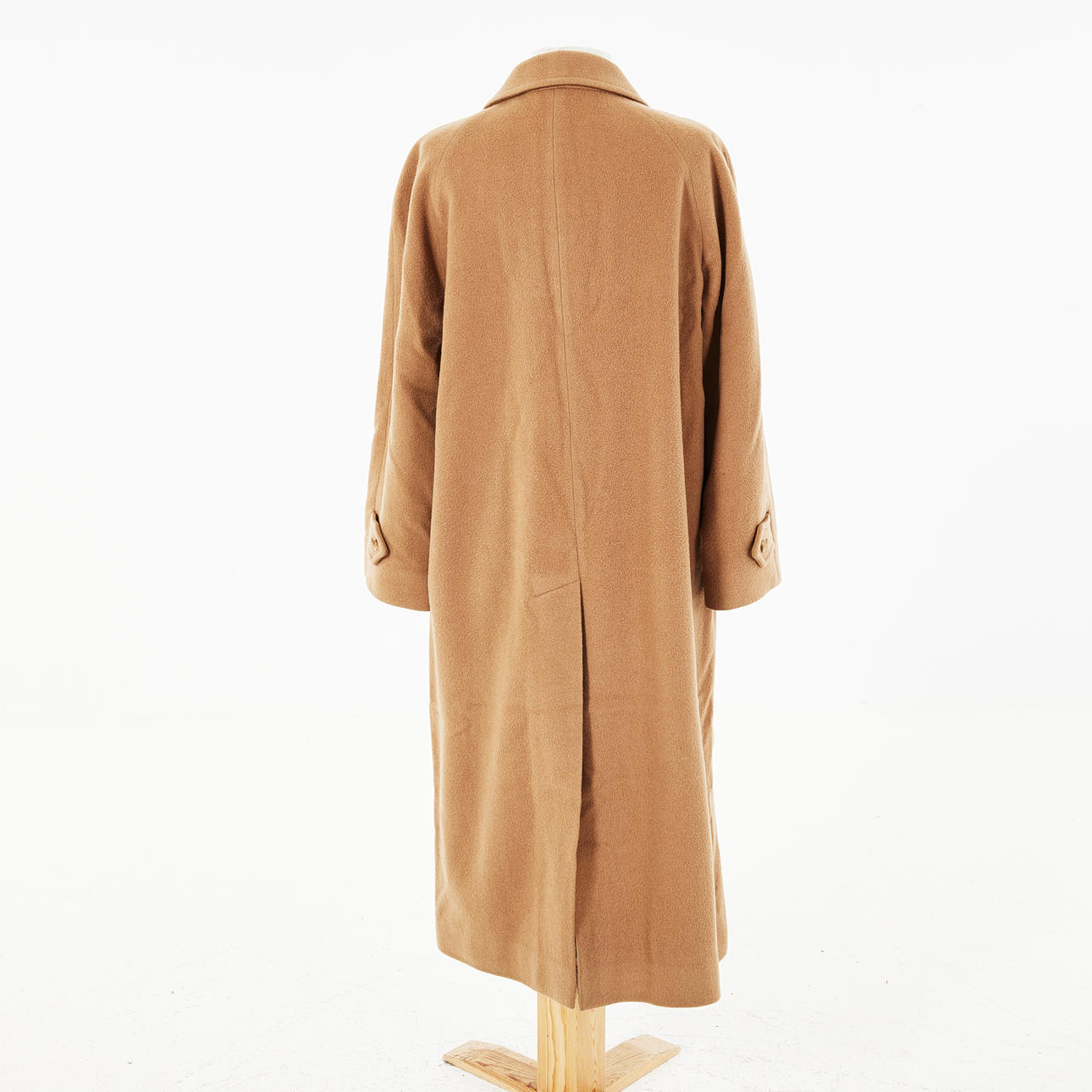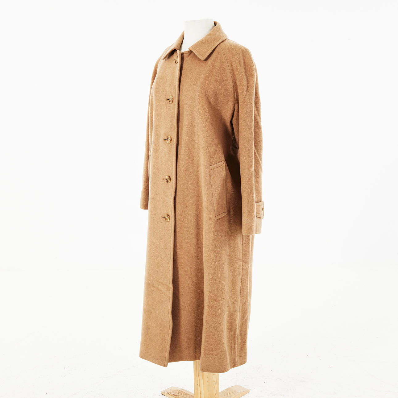 Beige kappa i kamel och ull, knappar mitt fram och vid ärmslut, fodrad med rutmönstret i ull, etikettmärkt "Burberrys made in England", rygglängd ca 116, bystvidd 112cm.