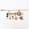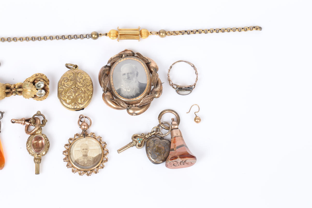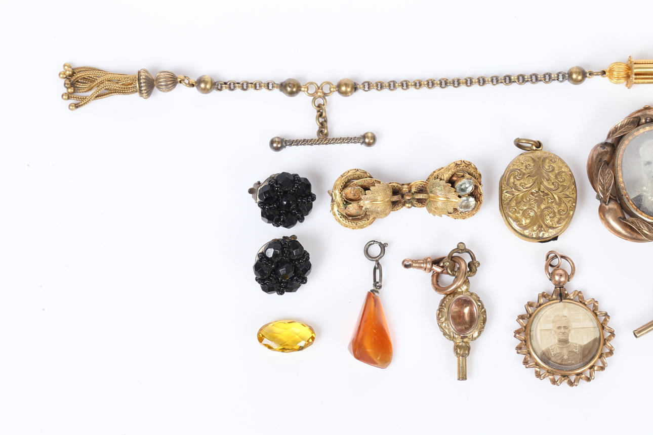 Innehåller även ett agathängsmycke, en gul fasetterad sten, ett par vintageklämma på örhängen och en gul metallörhänge.