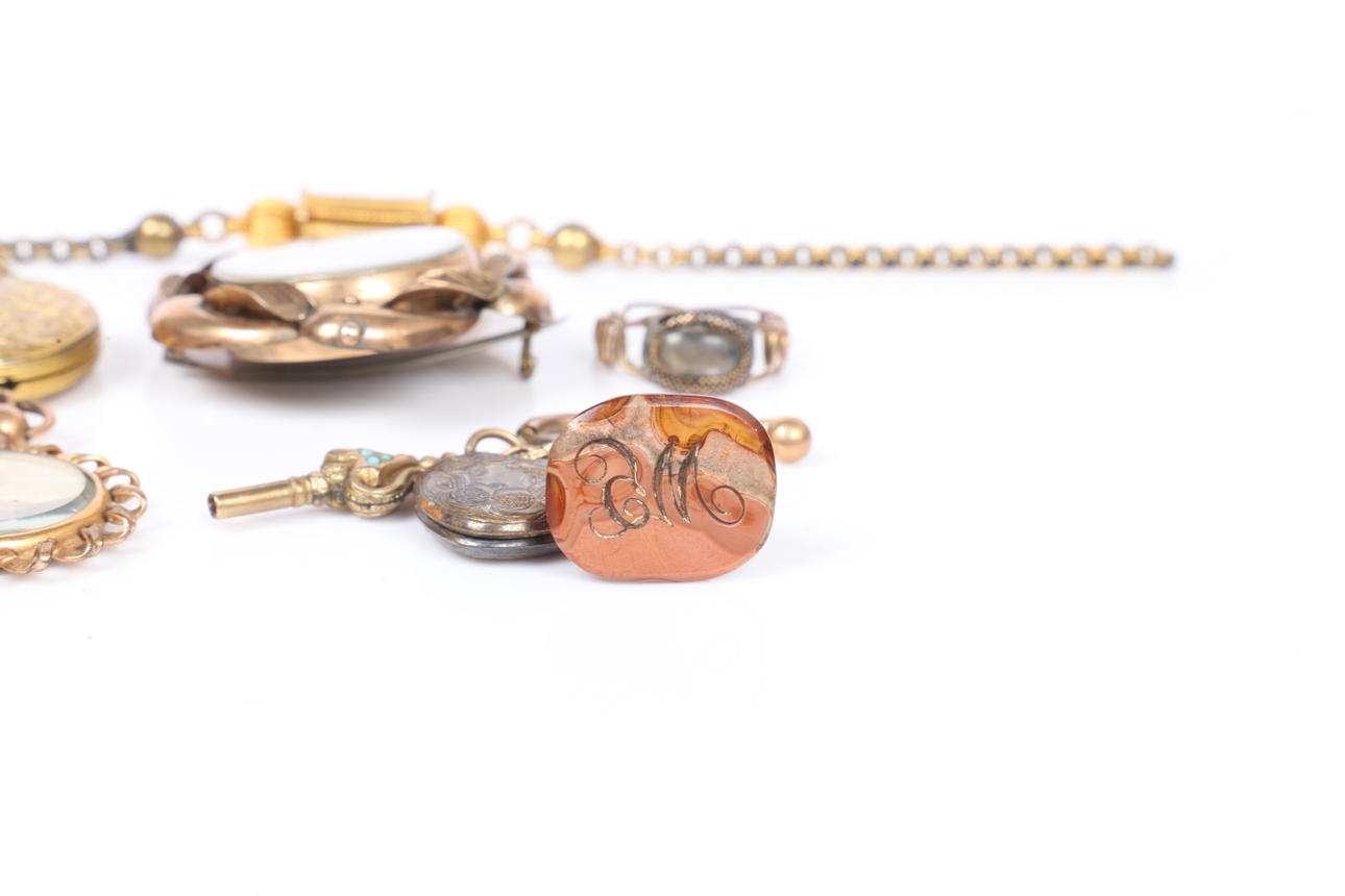 Ett sigillhängsmycke snidat av jaspis, graverat med GW. Med en gul metallborgen. Upphängd i en gul metallhoppring, även med en hjärtmedaljong och en gul metallturkos klocknyckel.