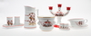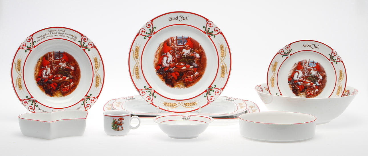 Porslin med juldekor. 12 mattallrikar, 16 djupa tallrikar, 12 assietter, 2 mindre djupa skålar, 6 st glöggmuggar, 2 uppläggningsfat, skål, såssnipa, 4 ytterfoder, kandelaber, 2 par kryddkar med fat, mjölkkanna samt snurrbricka med 7 fat.