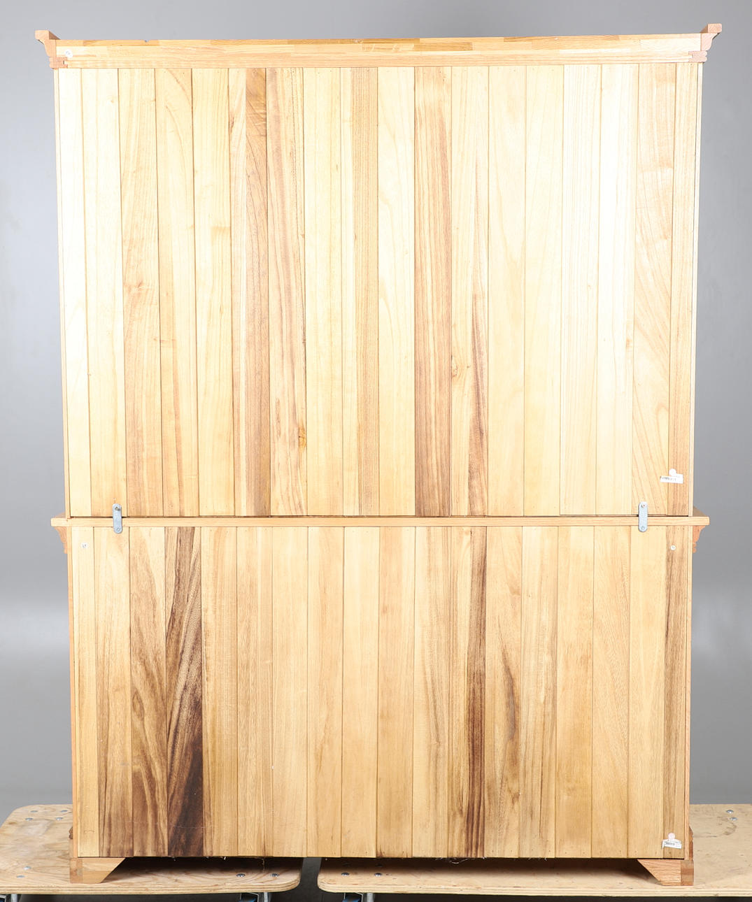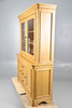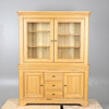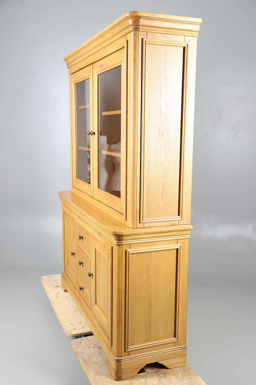 Den glaserade övre delen omsluter justerbara hyllor, basen monterade två skåpdörrar som flankerar tre korta lådor.
