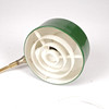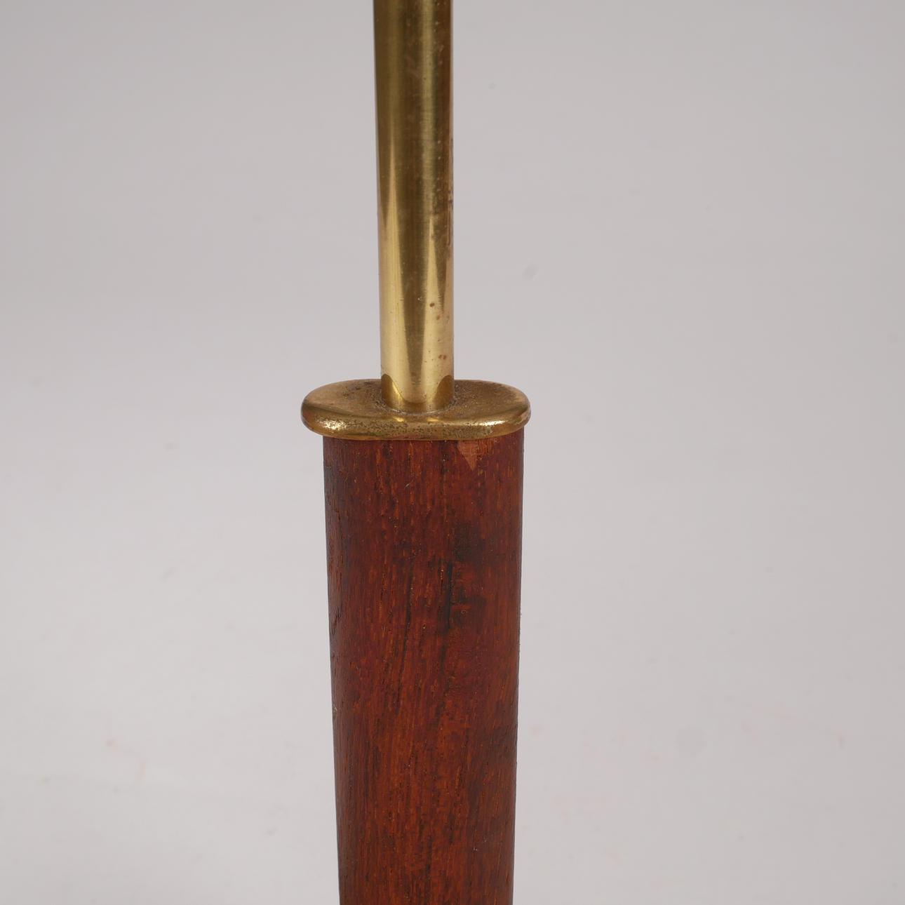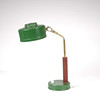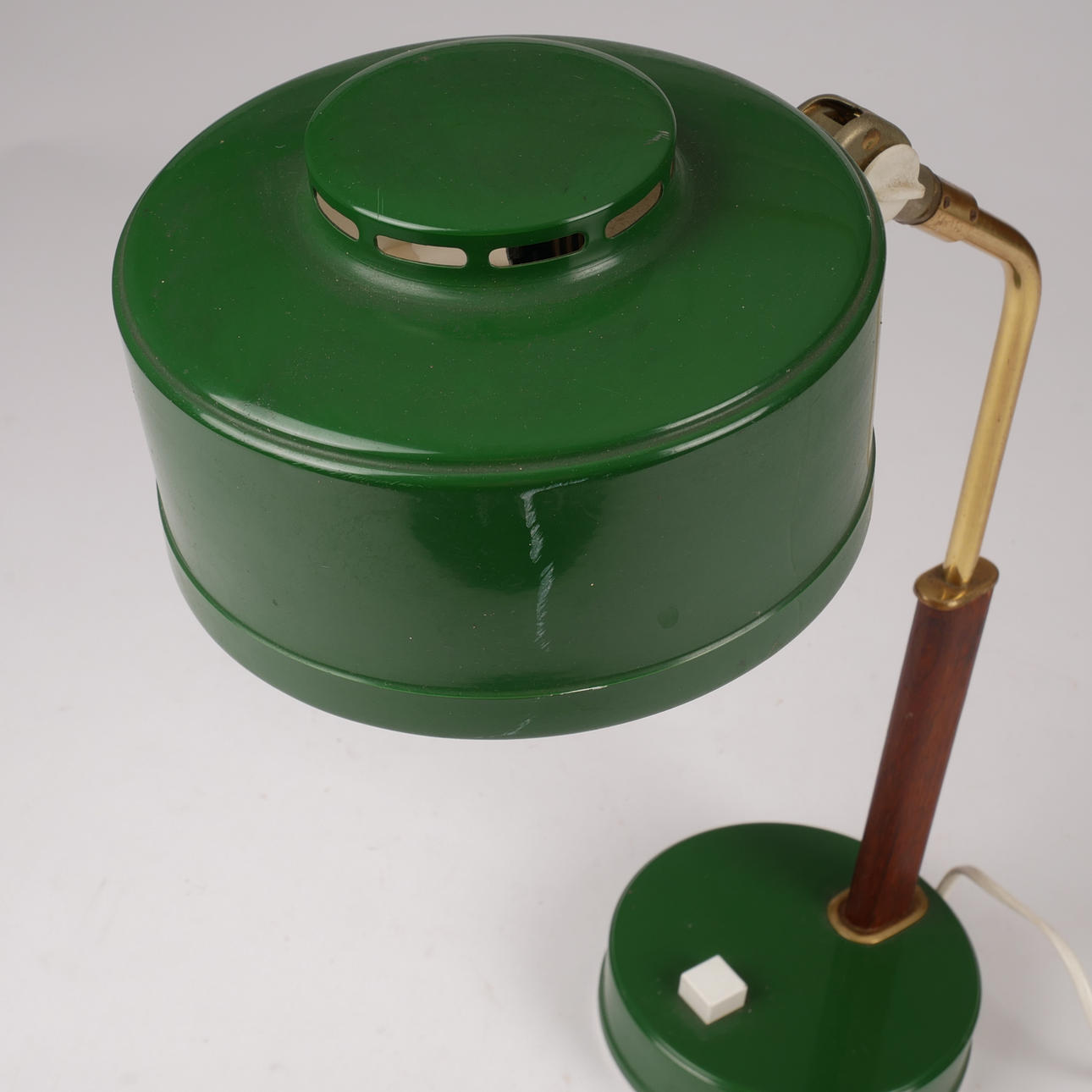 Skärm och fot i grönlackerad plåt. Stativ i mässing och teak. Höjd ca 40 cm.