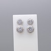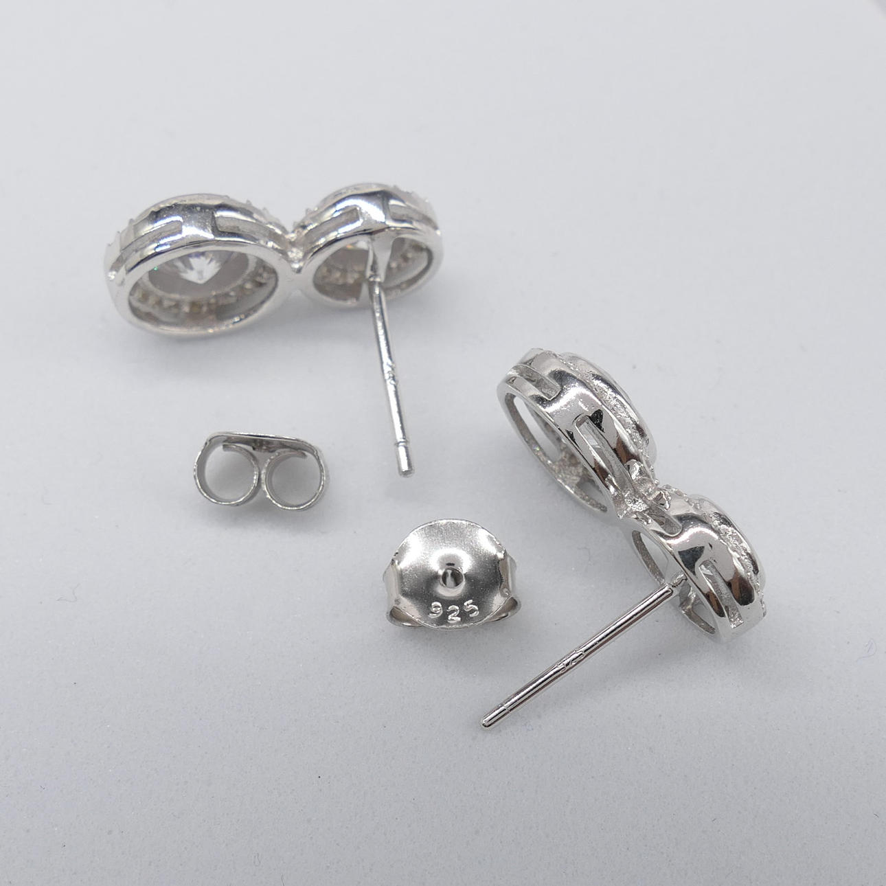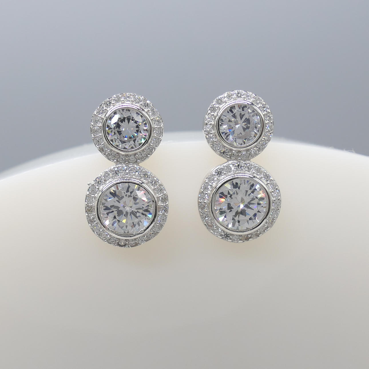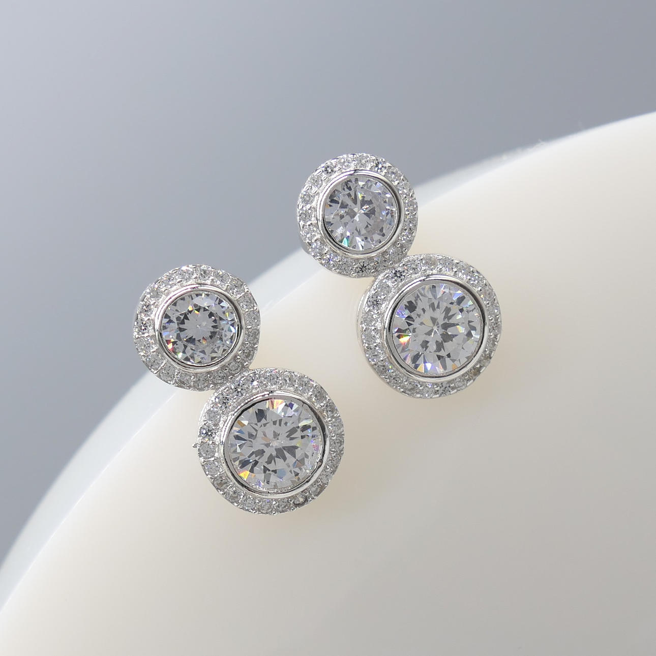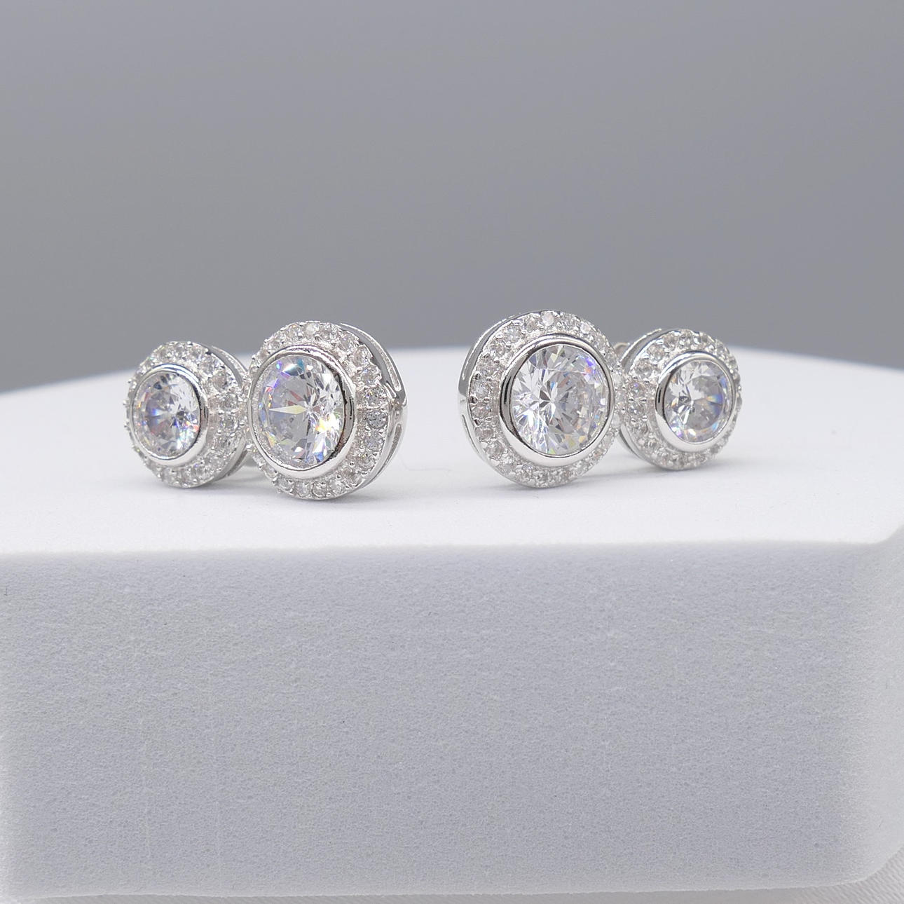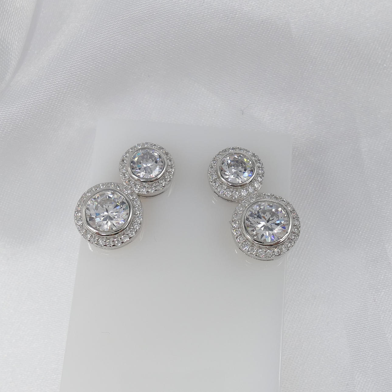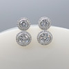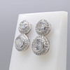 Ett par pärlinfattade dubbla halo-droppörhängen i sterlingsilver.