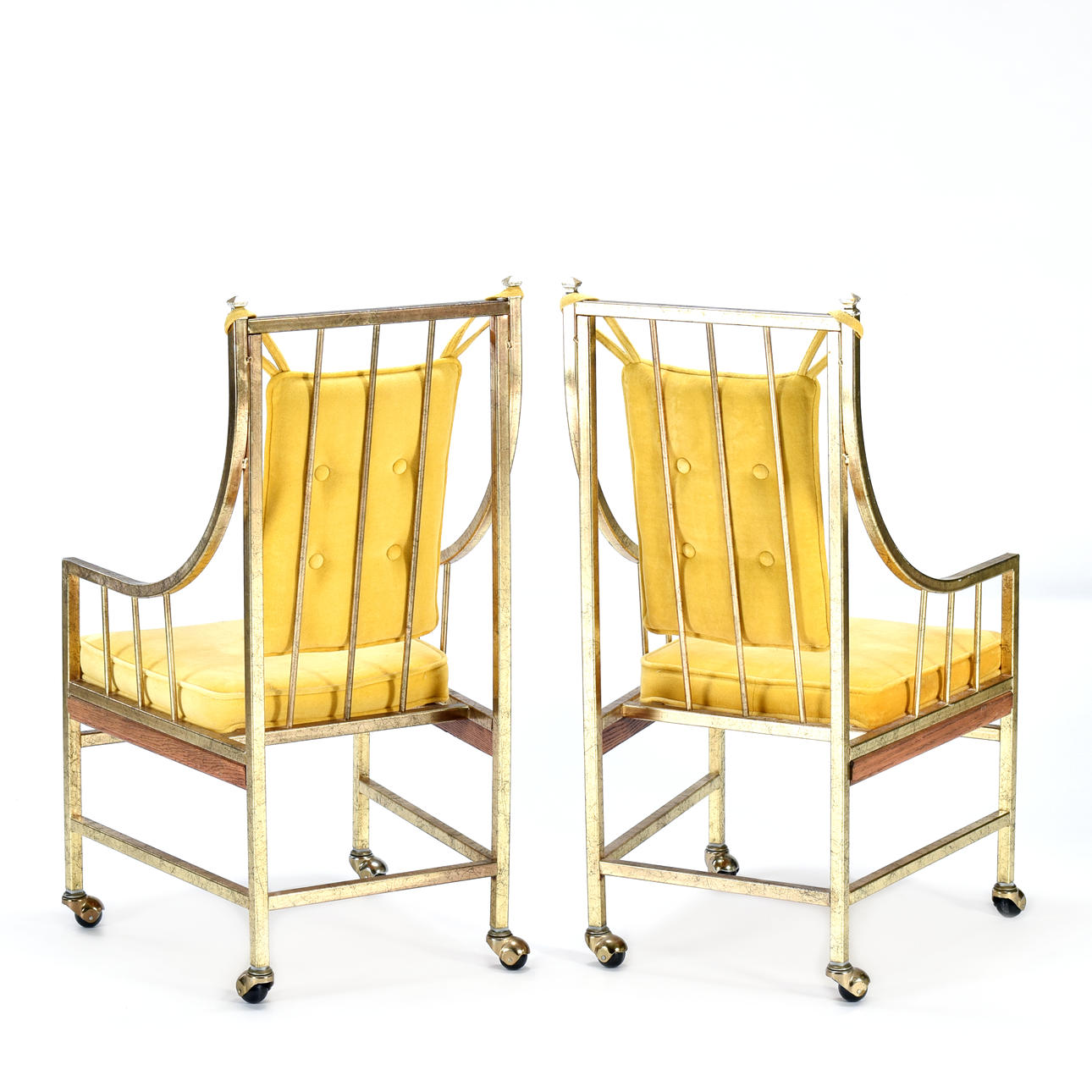 Karmstolar på trissor med stomme i marmorerad gulmetall och mörkbetsad lövträ