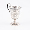 Med uppsvängt handtag, välvd fot, svisselerad bladdekor, höjd 8,5 cm. Vikt ca 24 gram.