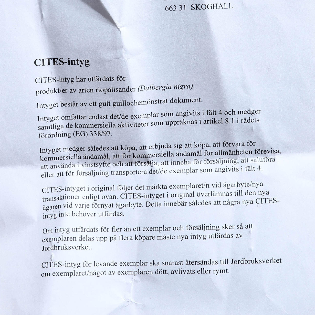 CITES-intyg medföljer. Exporttillstånd krävs för export utanför EU.