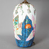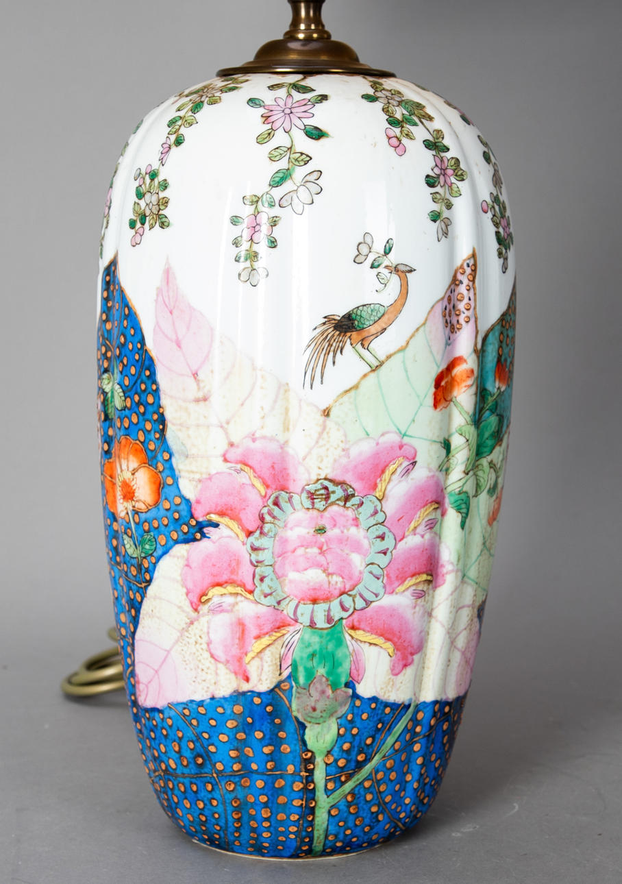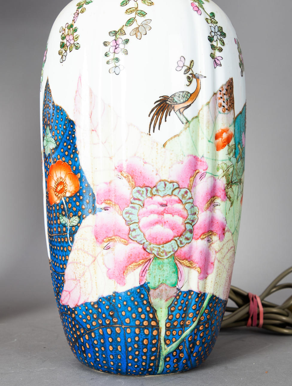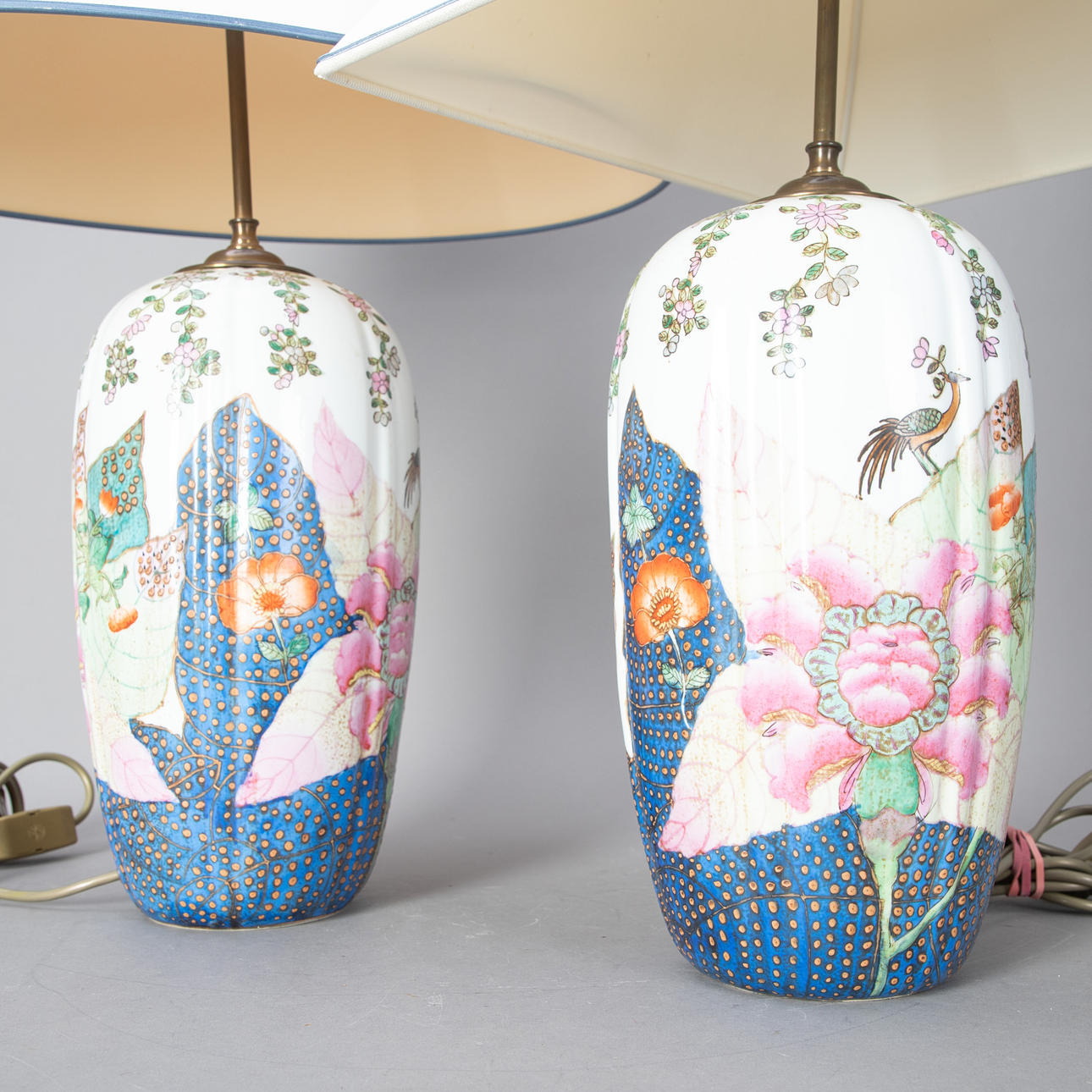 Stengods, emaljerat i färg. Äggformad lampbas, räfflad. Omkretsmässiga lotusblommor Elektrifierad med 2 lågor. H. någonsin. ca 35 cm (vas) /68 cm (med skugga).