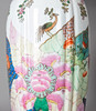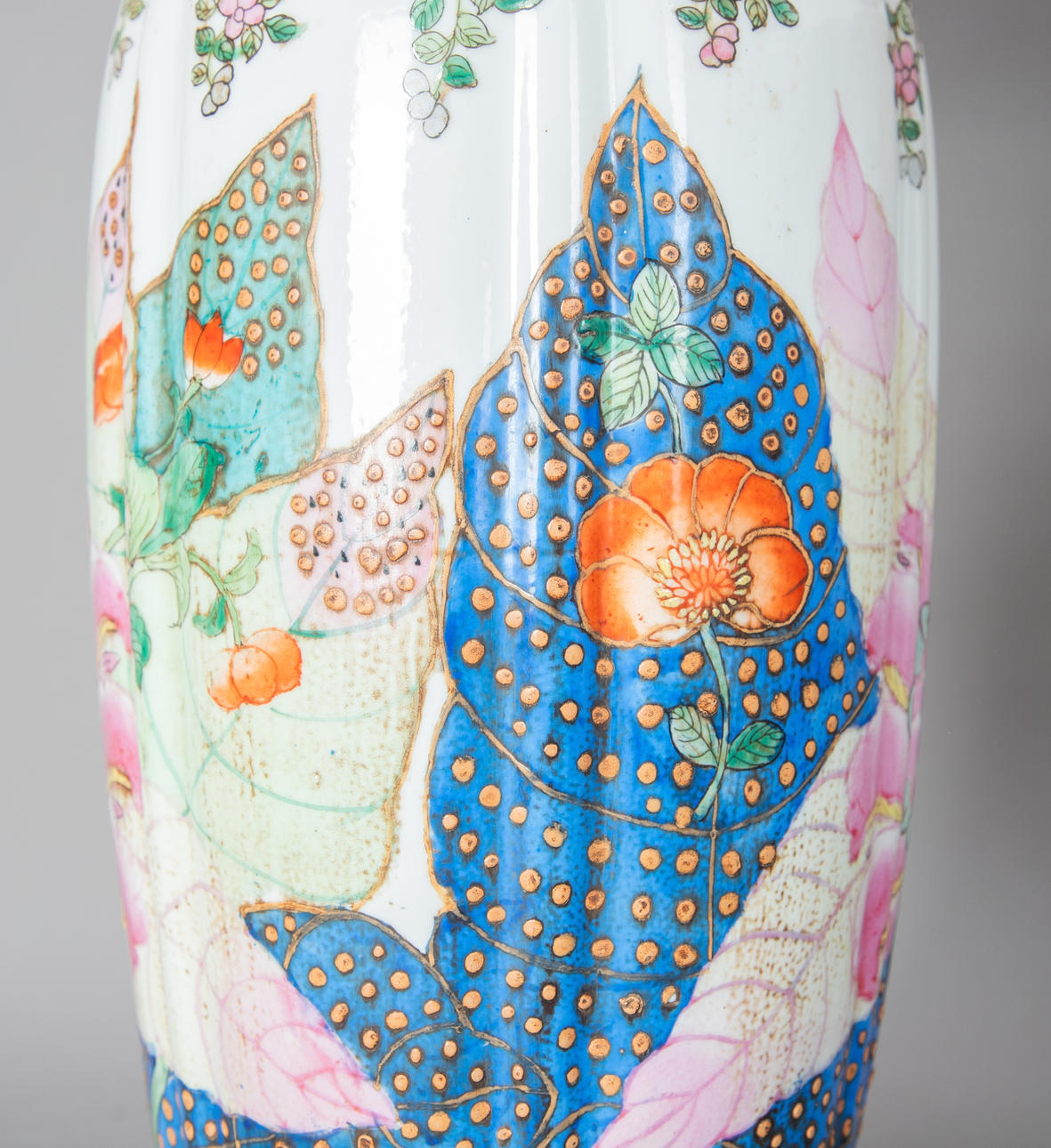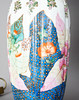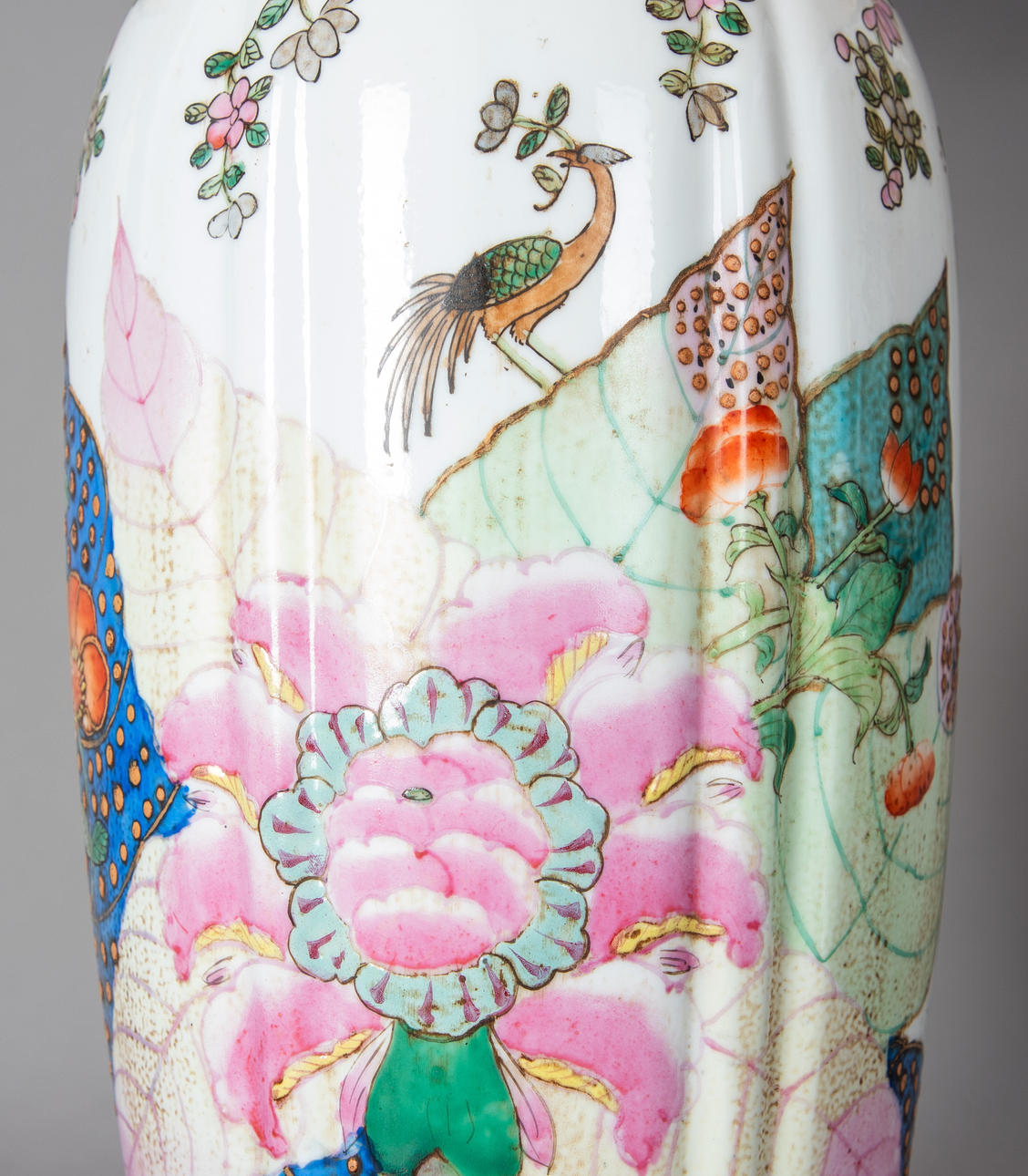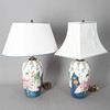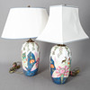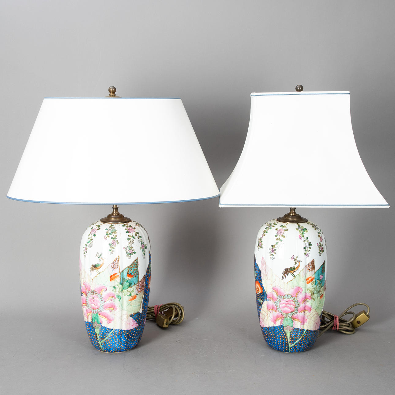 Stengods, emaljerat i färg. Äggformad lampbas, räfflad. Omkretsmässiga lotusblommor Elektrifierad med 2 lågor. H. någonsin. ca 35 cm (vas) /68 cm (med skugga).