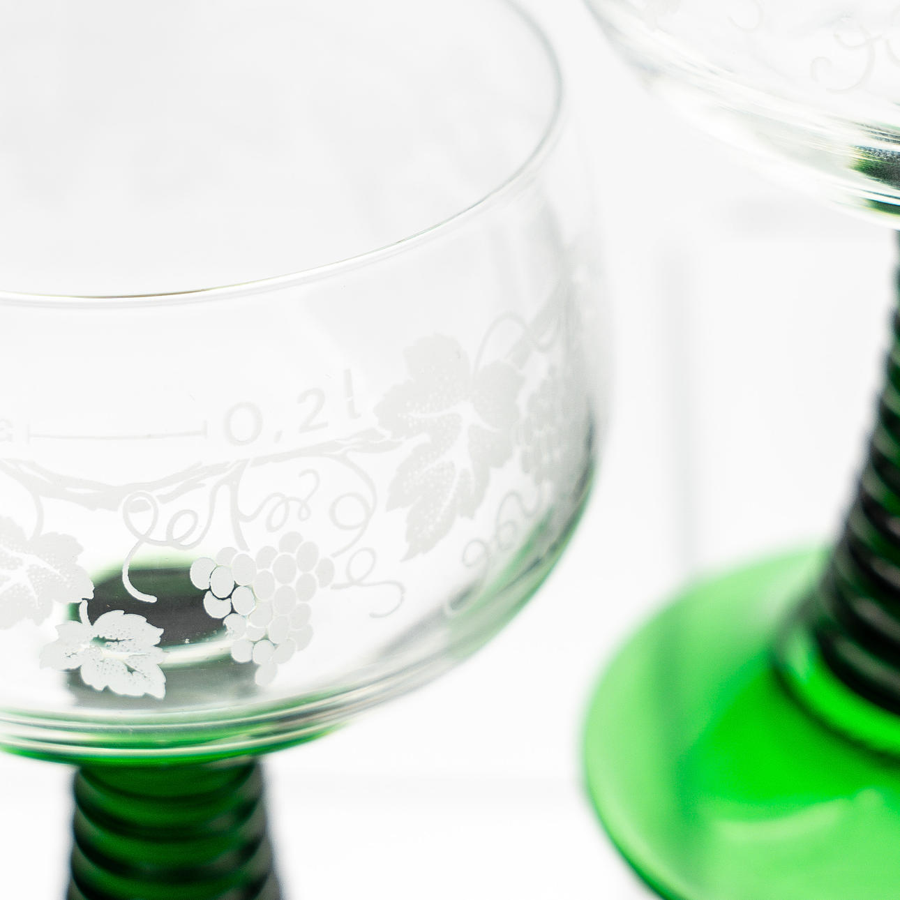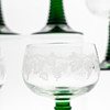 Sex stycken remmare tillverkade under 1900-talets första hälft. Fot och skaft i grönt glas, kuporna med dekor av vindruvsklasar.