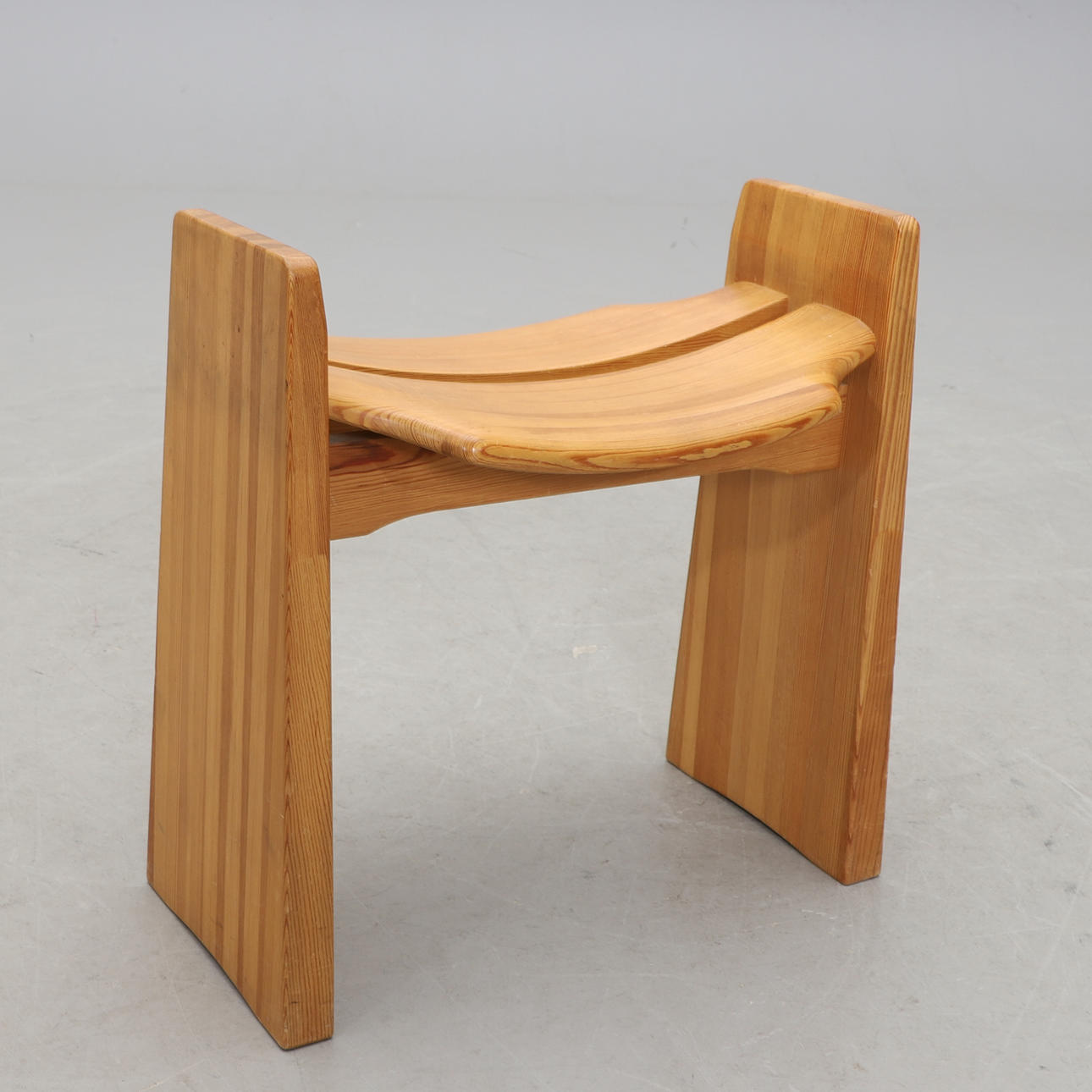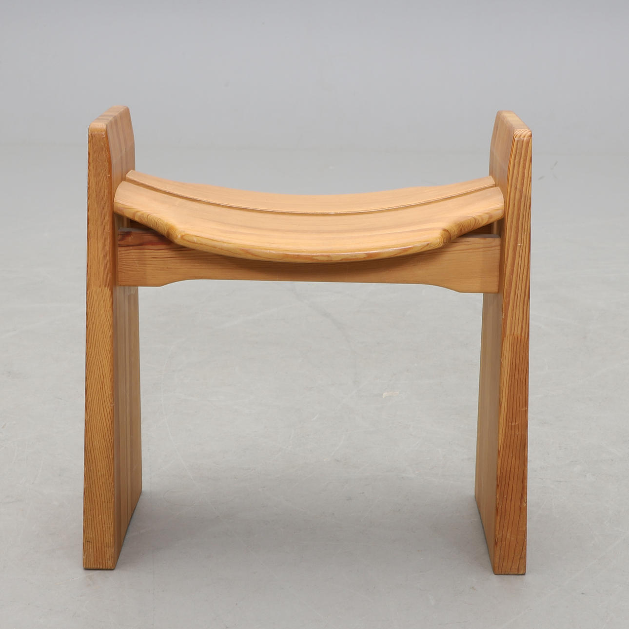 Massiv furu. Skålad sits. Bredd 47, sitthöjd 37 cm.