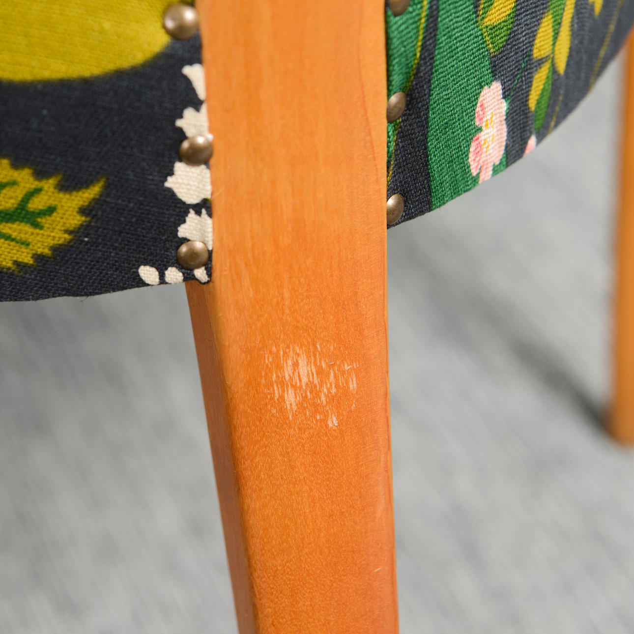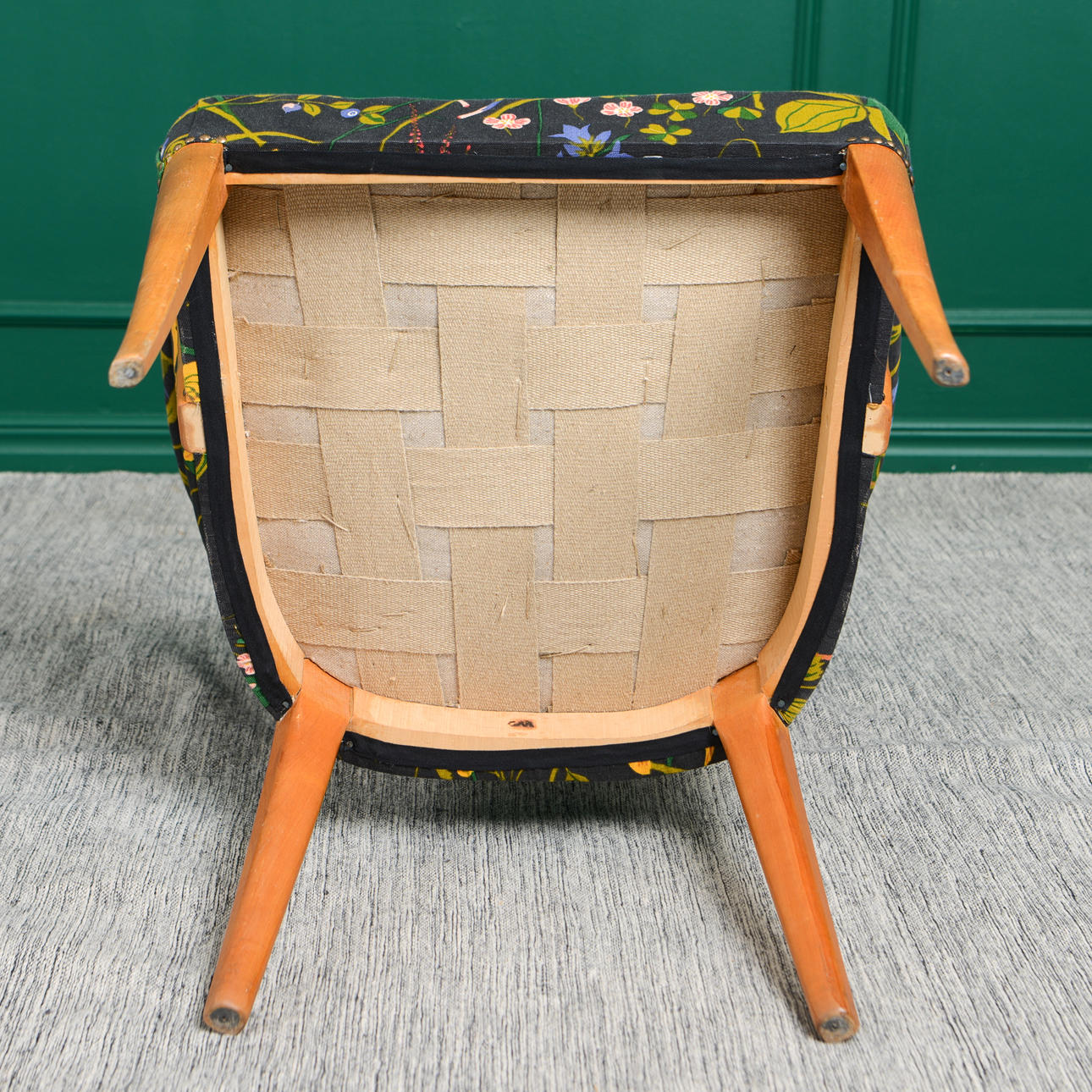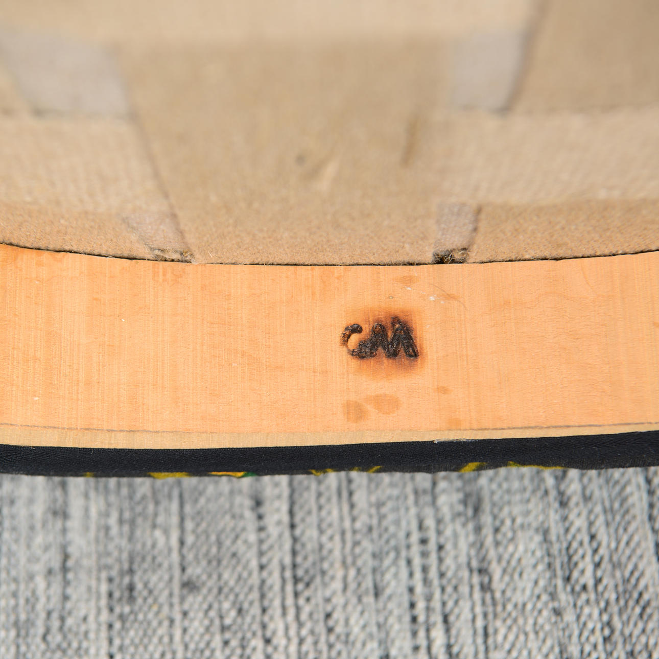 Brännmärkt. Nyligen omklädd i Gocken Jobs linnetyg "Ros & Lilja". Ben i björk.