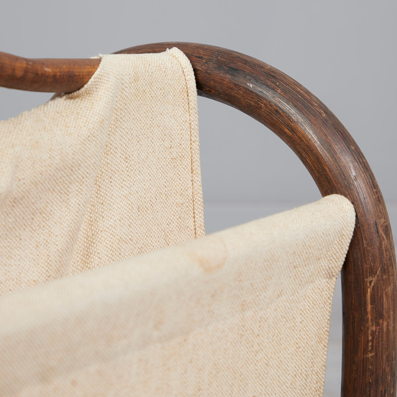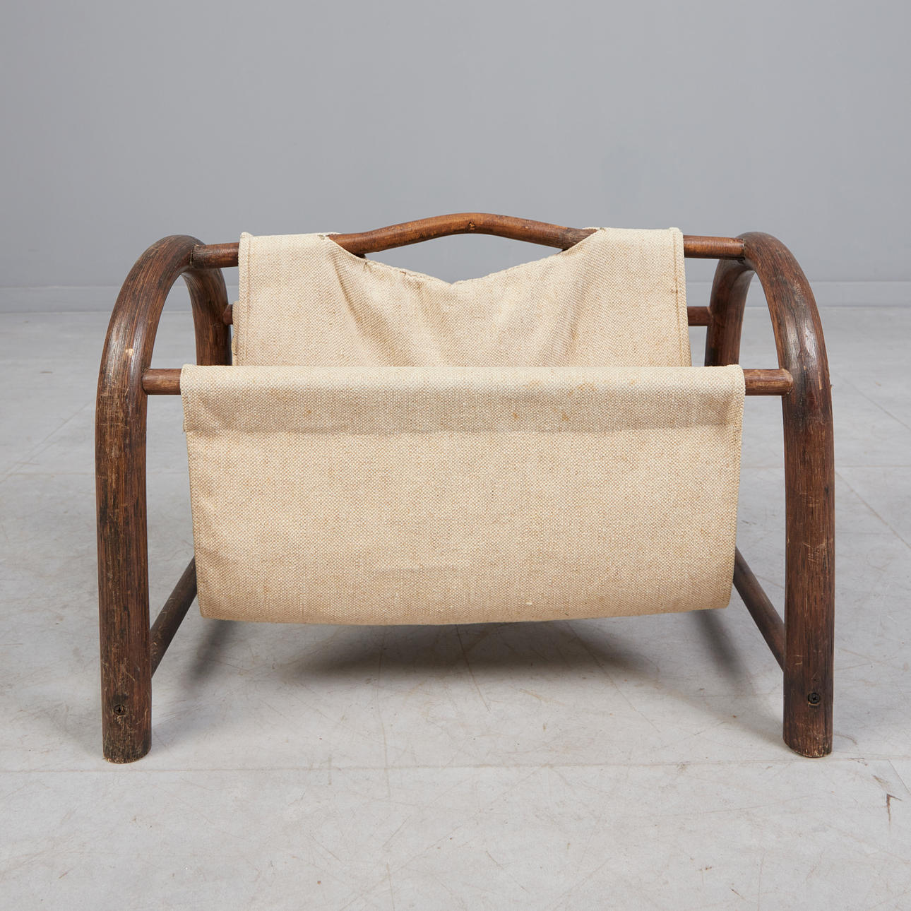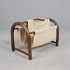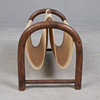 Tidningsställ av mörkbrun glaserad bambu med linneinsats och två fack, h.37.5cm, L.54.5cm, W.32cm.