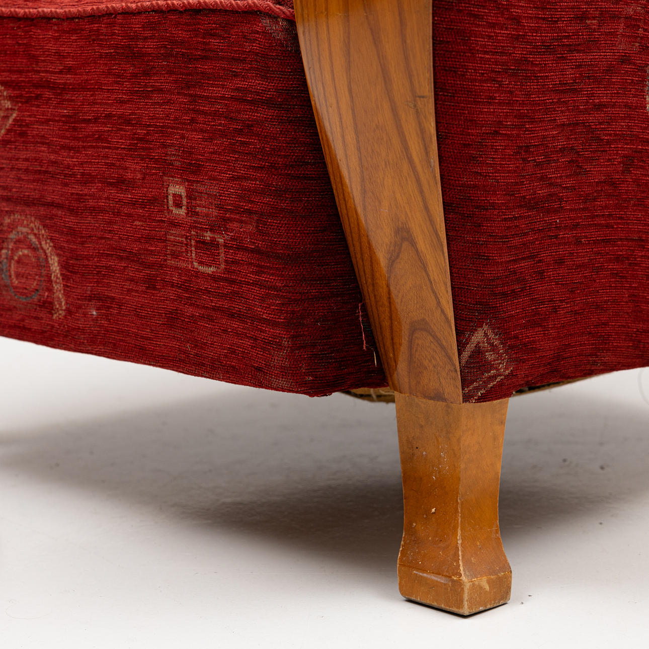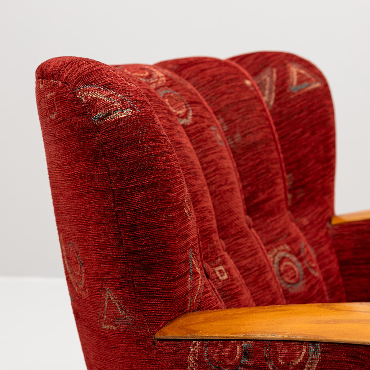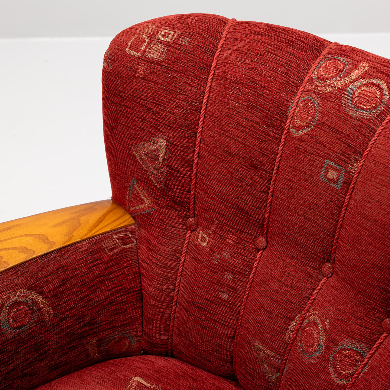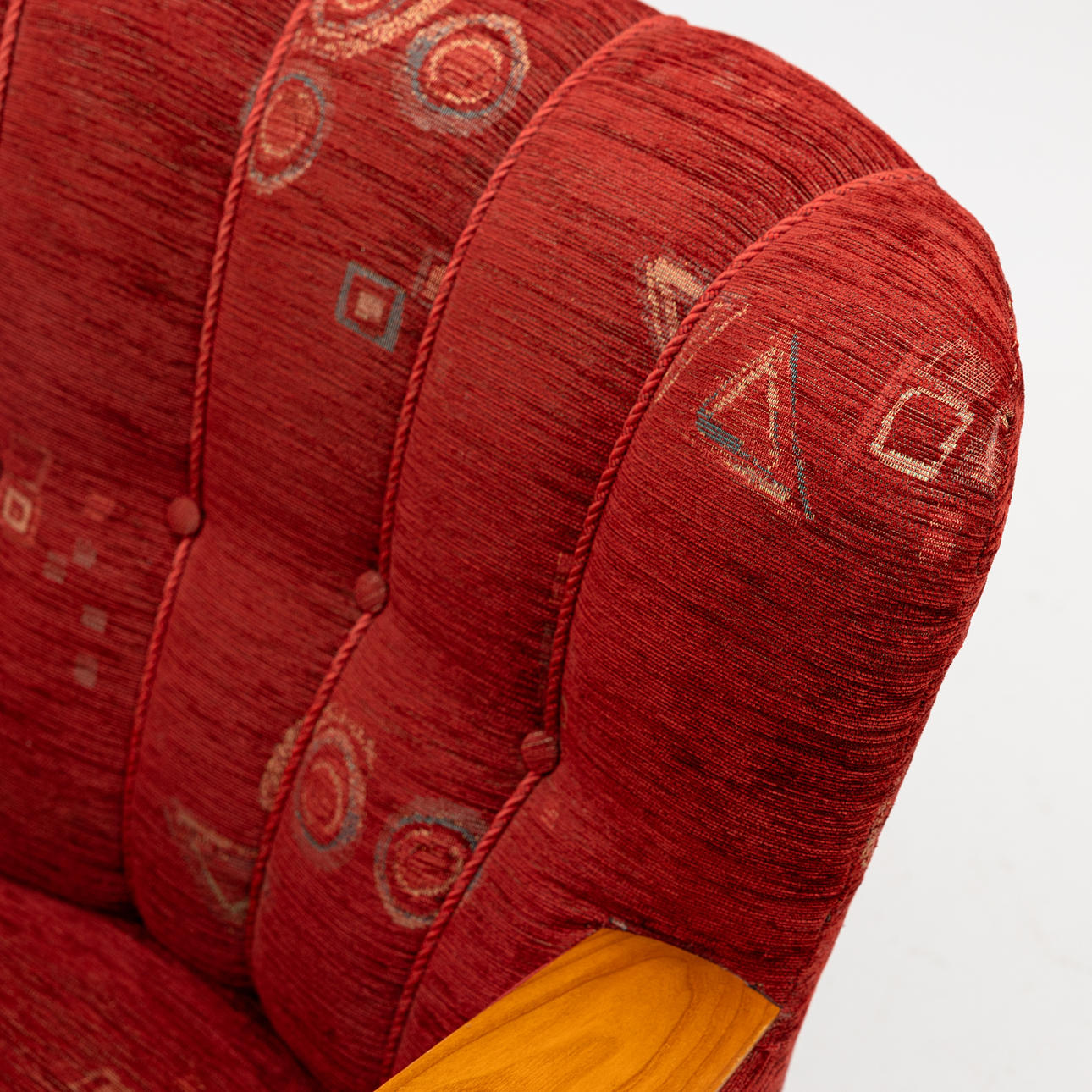 Träklädda armstöd övergående mot front, vinröd mönstrad klädsel. Bredd ca 80cm, tot djup ca 80cm, sitthöjd 39 cm.