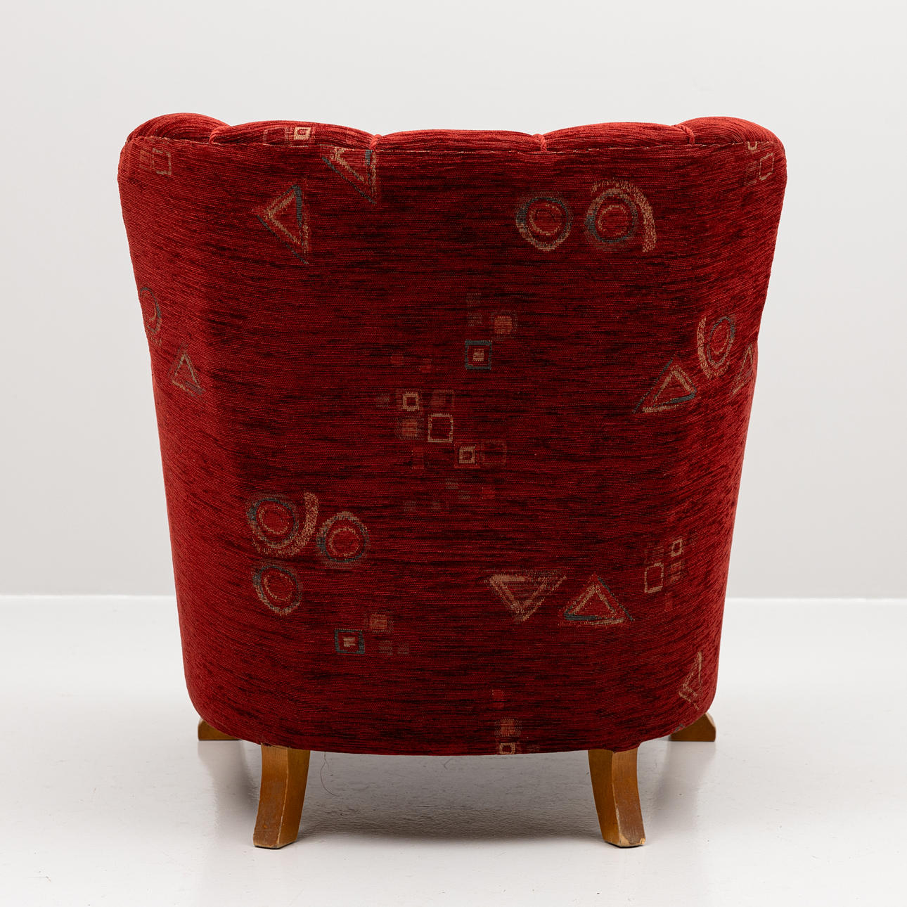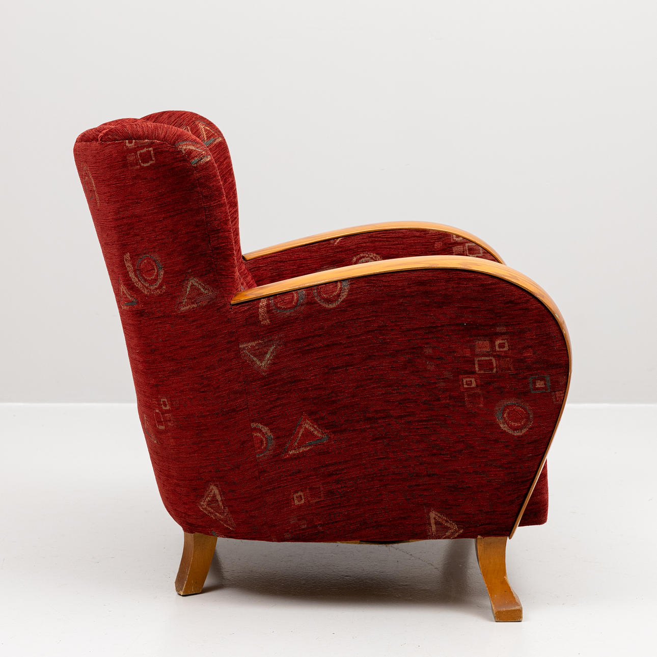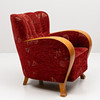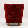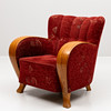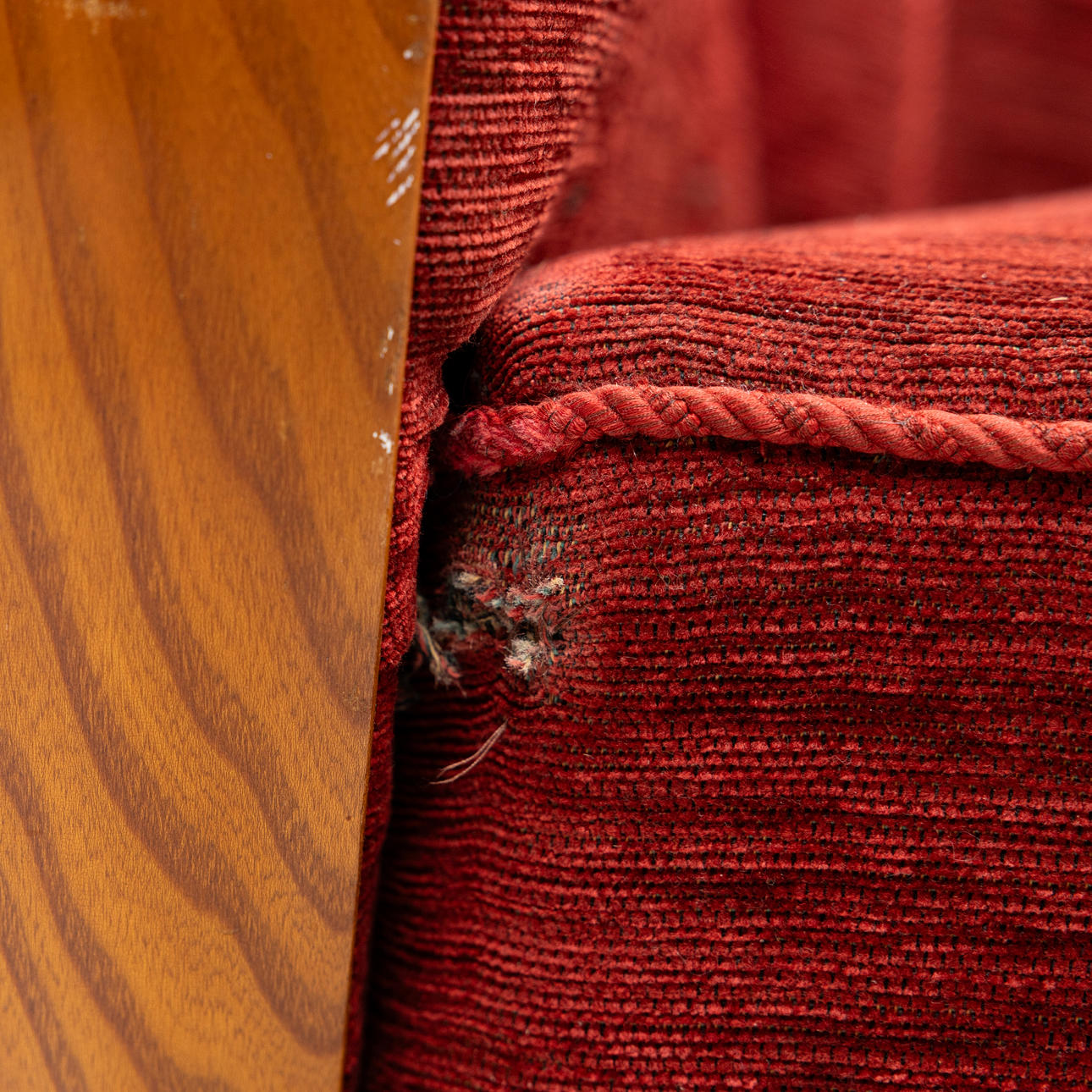 Träklädda armstöd övergående mot front, vinröd mönstrad klädsel. Bredd ca 80cm, tot djup ca 80cm, sitthöjd 39 cm.