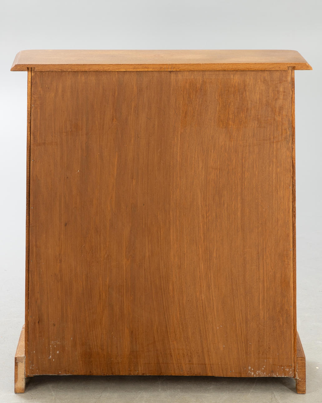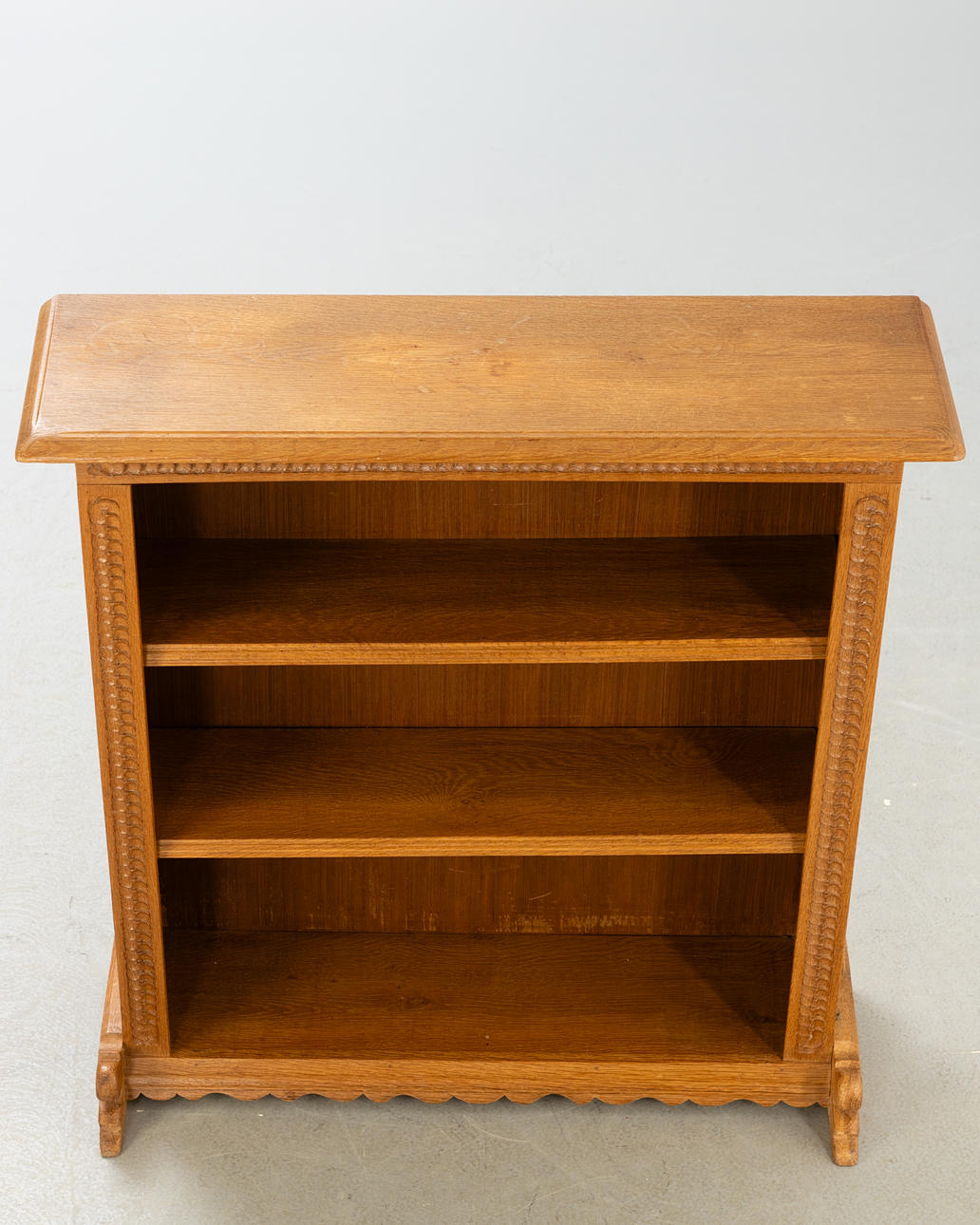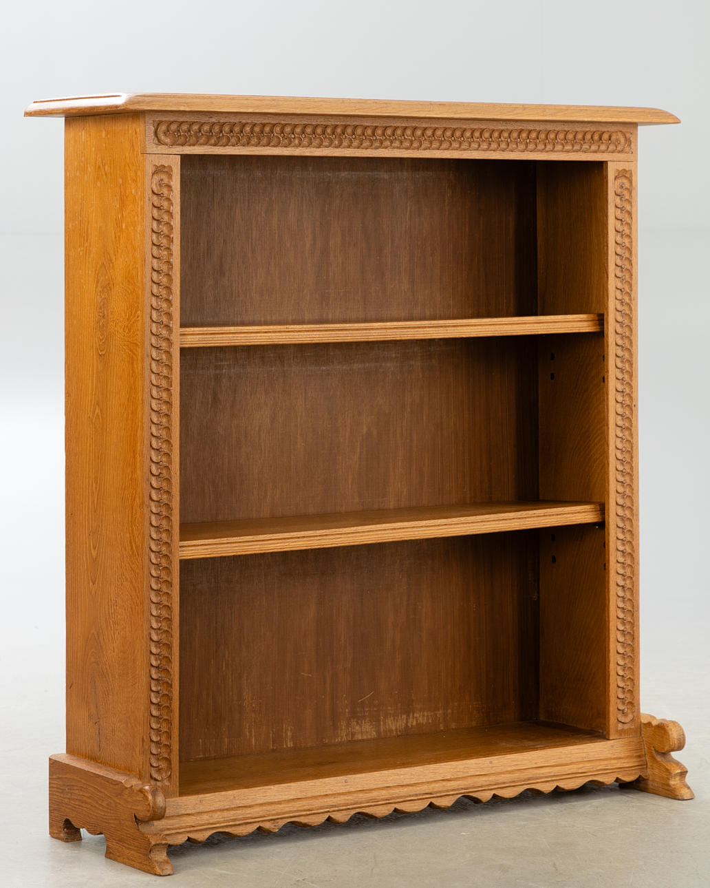 Snidad ek Rektangulär kropp på lockigt skuren ram med löpare. Något utskjutande toppplatta 2 hyllor justerbara i höjd