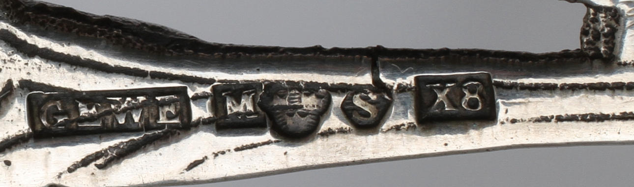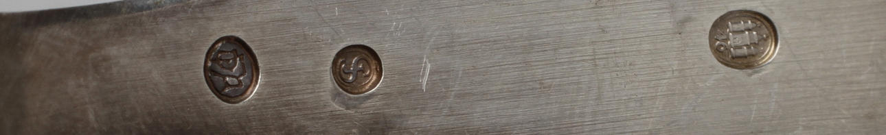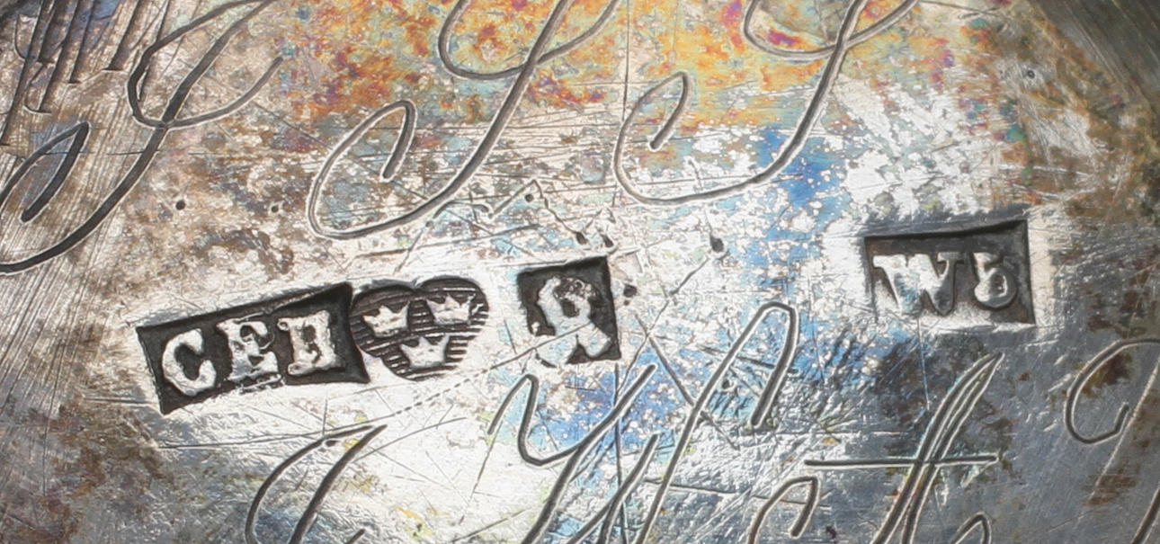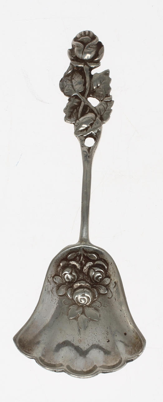 Bland annat bestående av: Gräddkanna, otydliga stämplar dat 1875, höjd ca 14 cm. Kaktång GEWE 1953, 18,5 cm. Tårtspade, GEWE 1948, längd 23 cm.