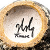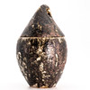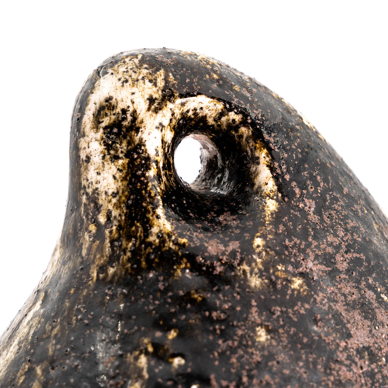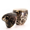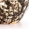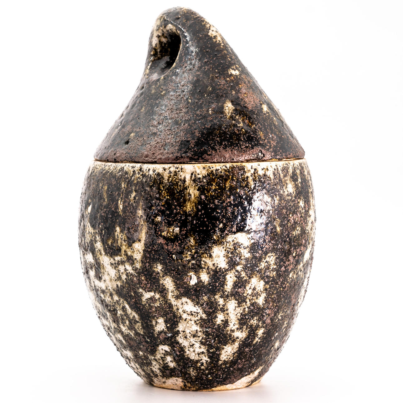 Tvådelad lockskål tillverkad av starkeldfajans i vita, bruna & svarta toner med spräcklig glasyr.