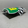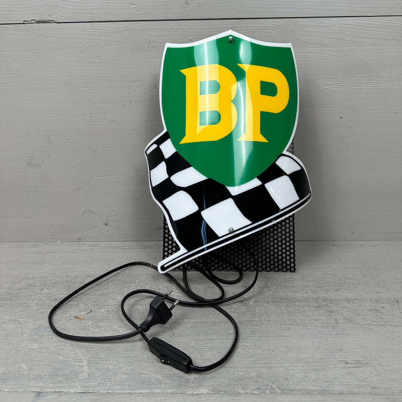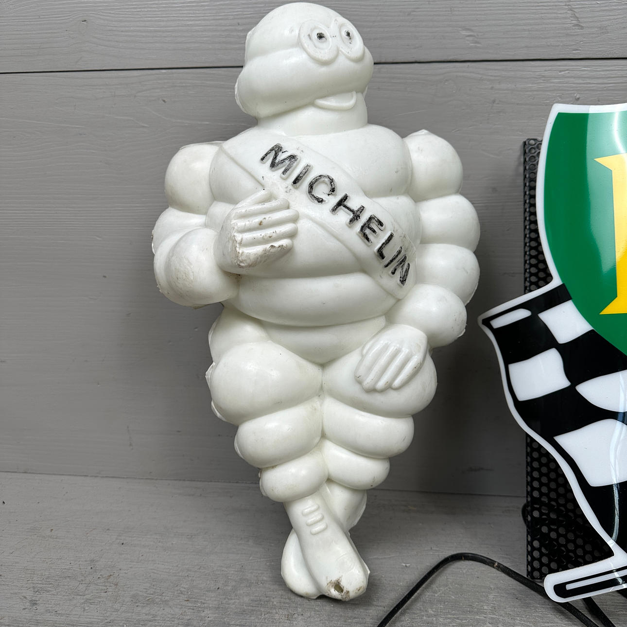 Ljusskylt i plast av märket BP och dekoration av märket Michelin.