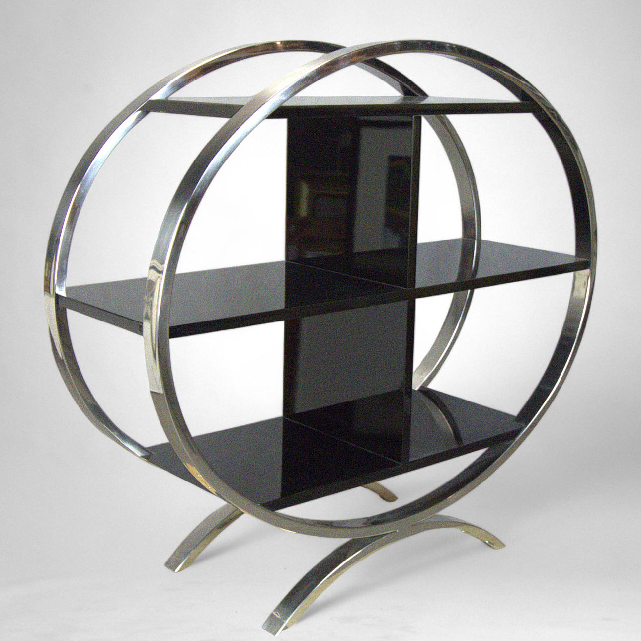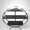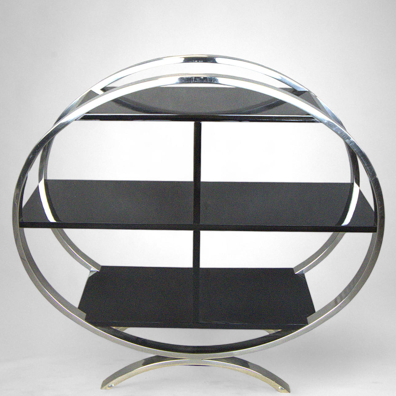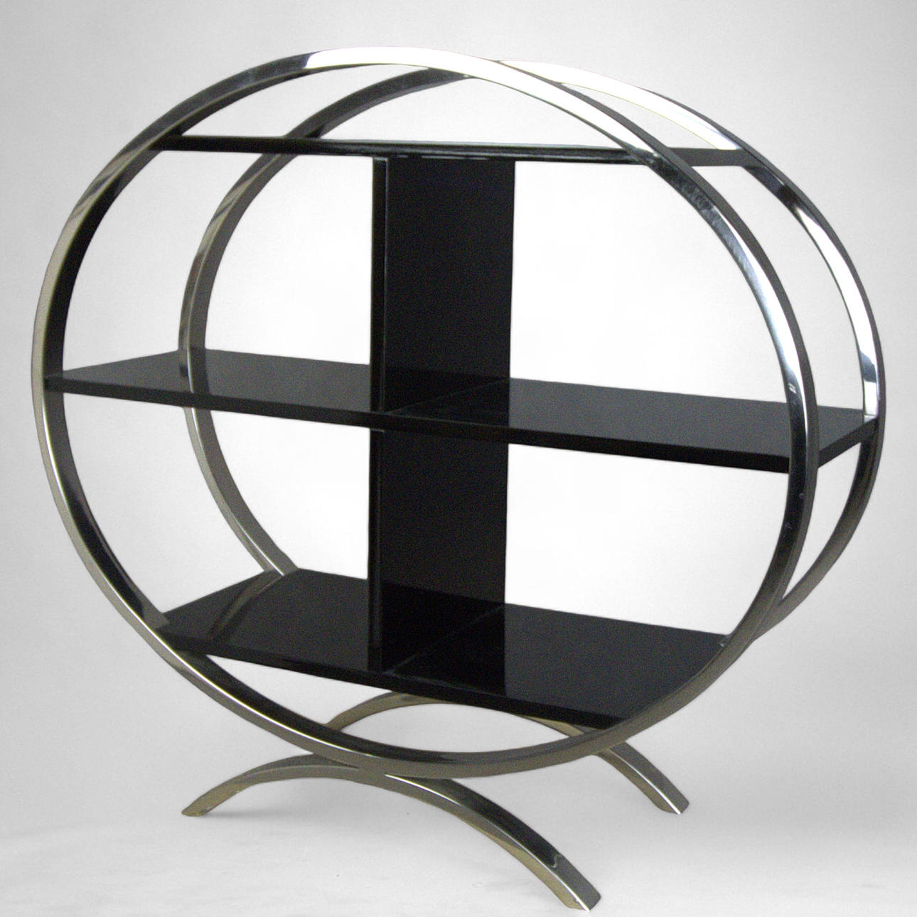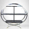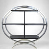 Längd 70 - 100 cm, bredd 34 cm, höjd 95 cm. Tre hyllplan. Två av dem med mittkonsol. Oval form.
