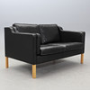 Klädd i svart läder. Lösa rygg och och sittplymer. Längd 142 cm. Sittdjup ca 57 cm. Rygghöjd 75 cm. Djup ca 81 cm.