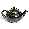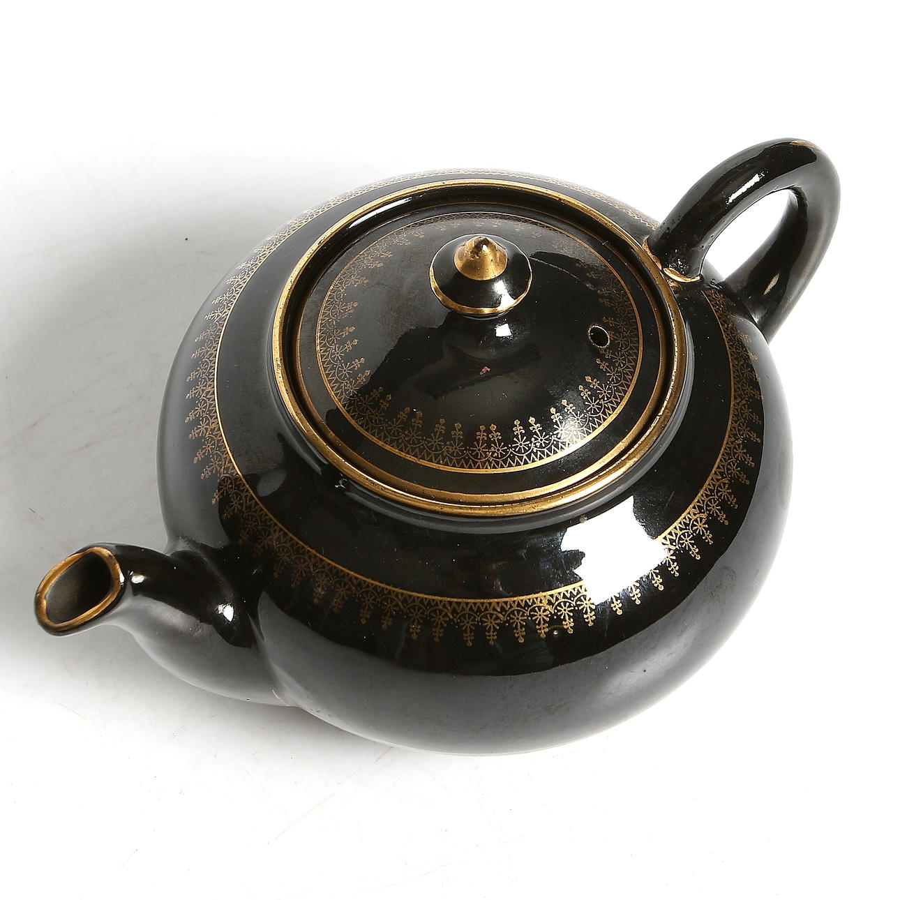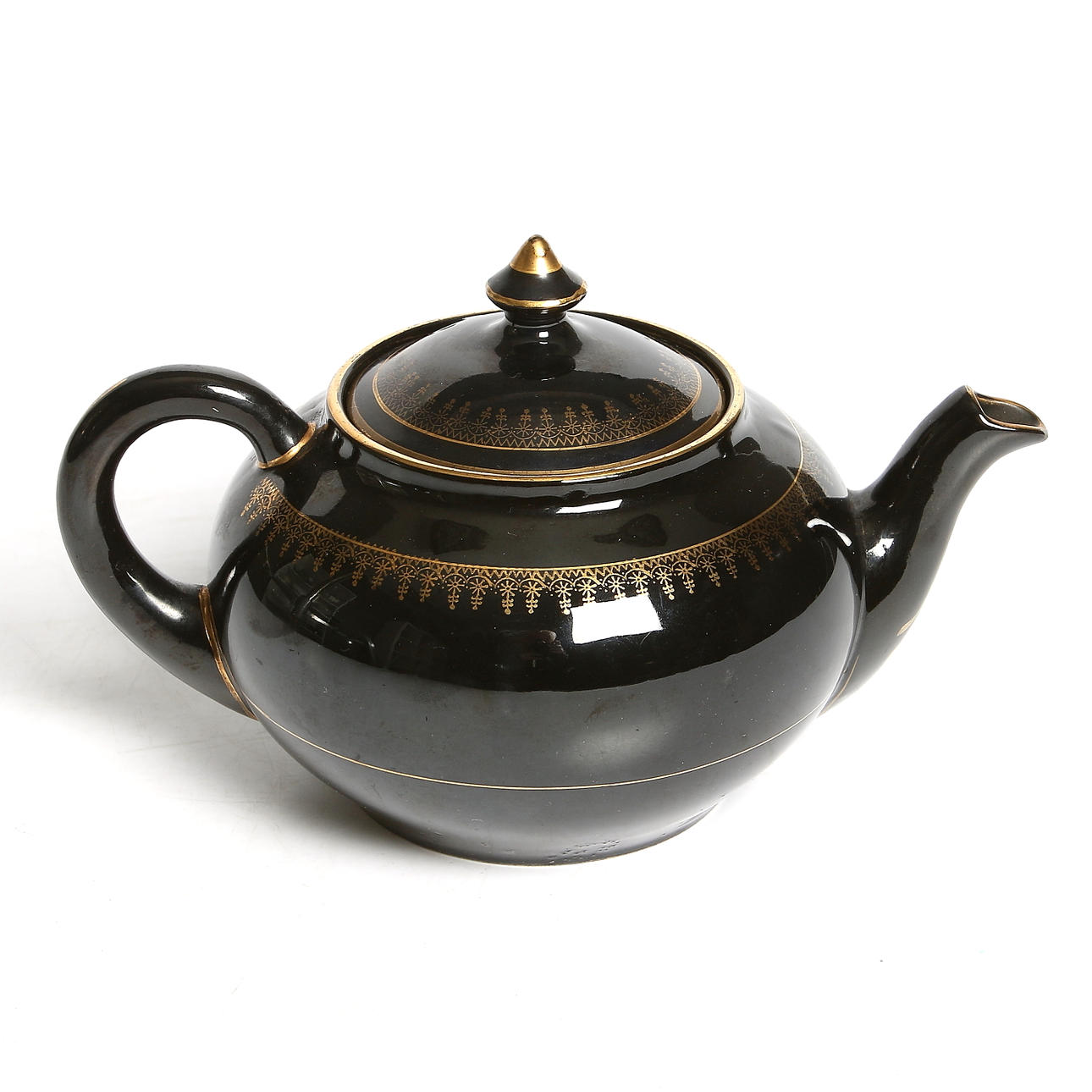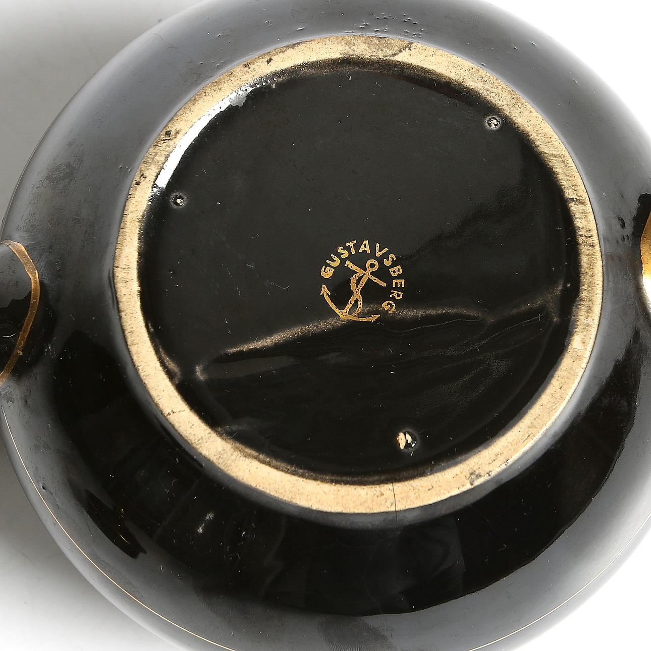 Svart glasyr med gulddekor. Längd 21,5 cm, höjd 13 cm.