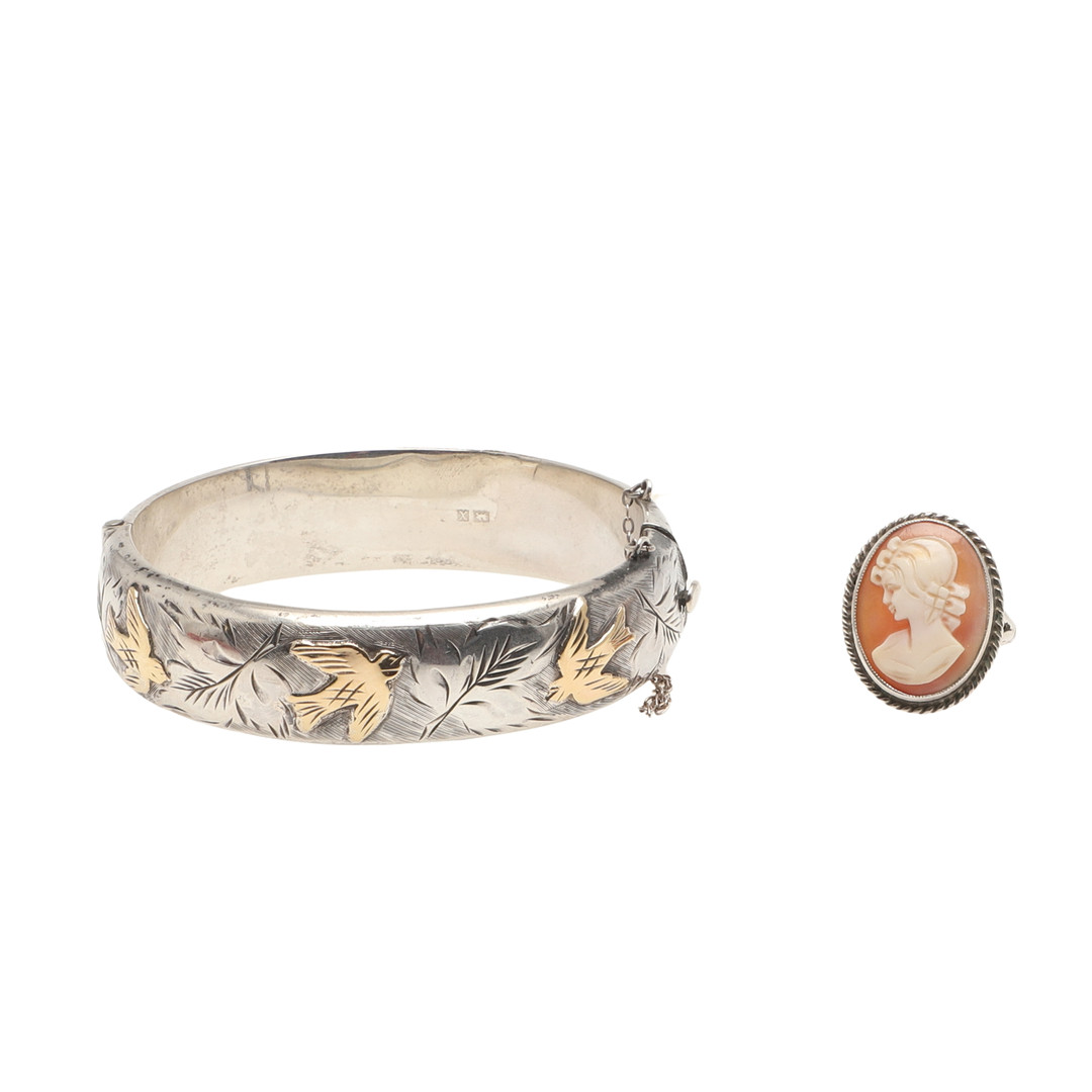 3811983. ARMBAND, SILVER OCH CAMEORING, 1970-TAL.