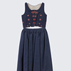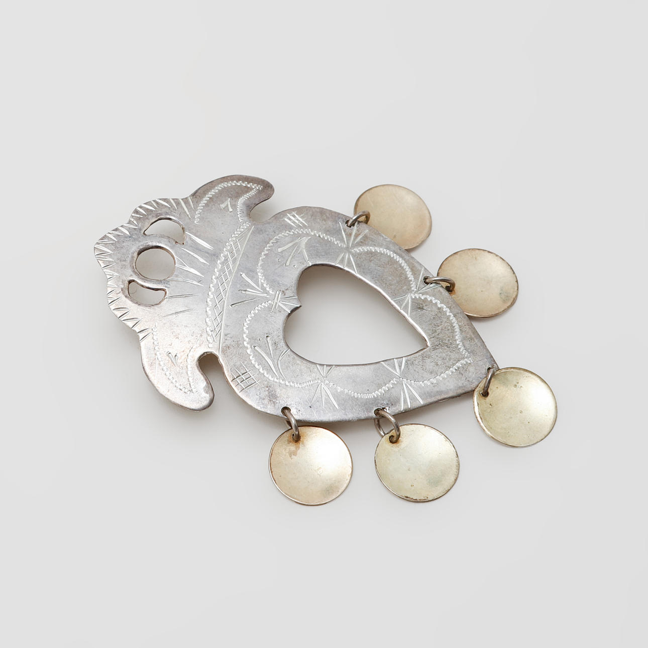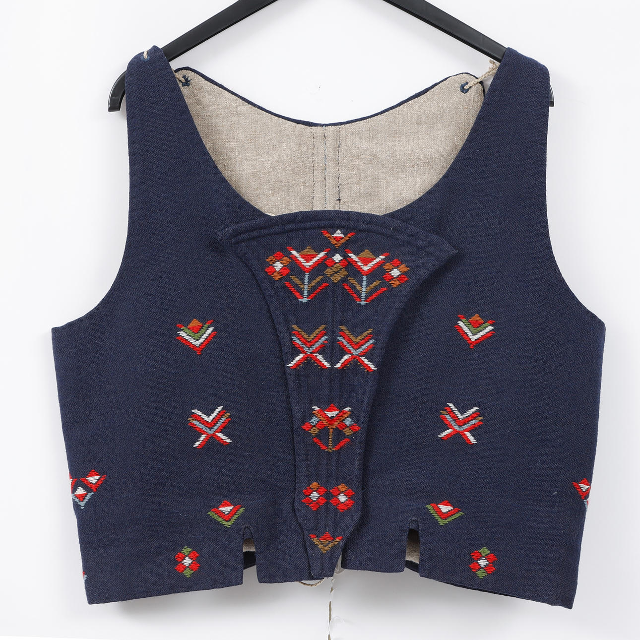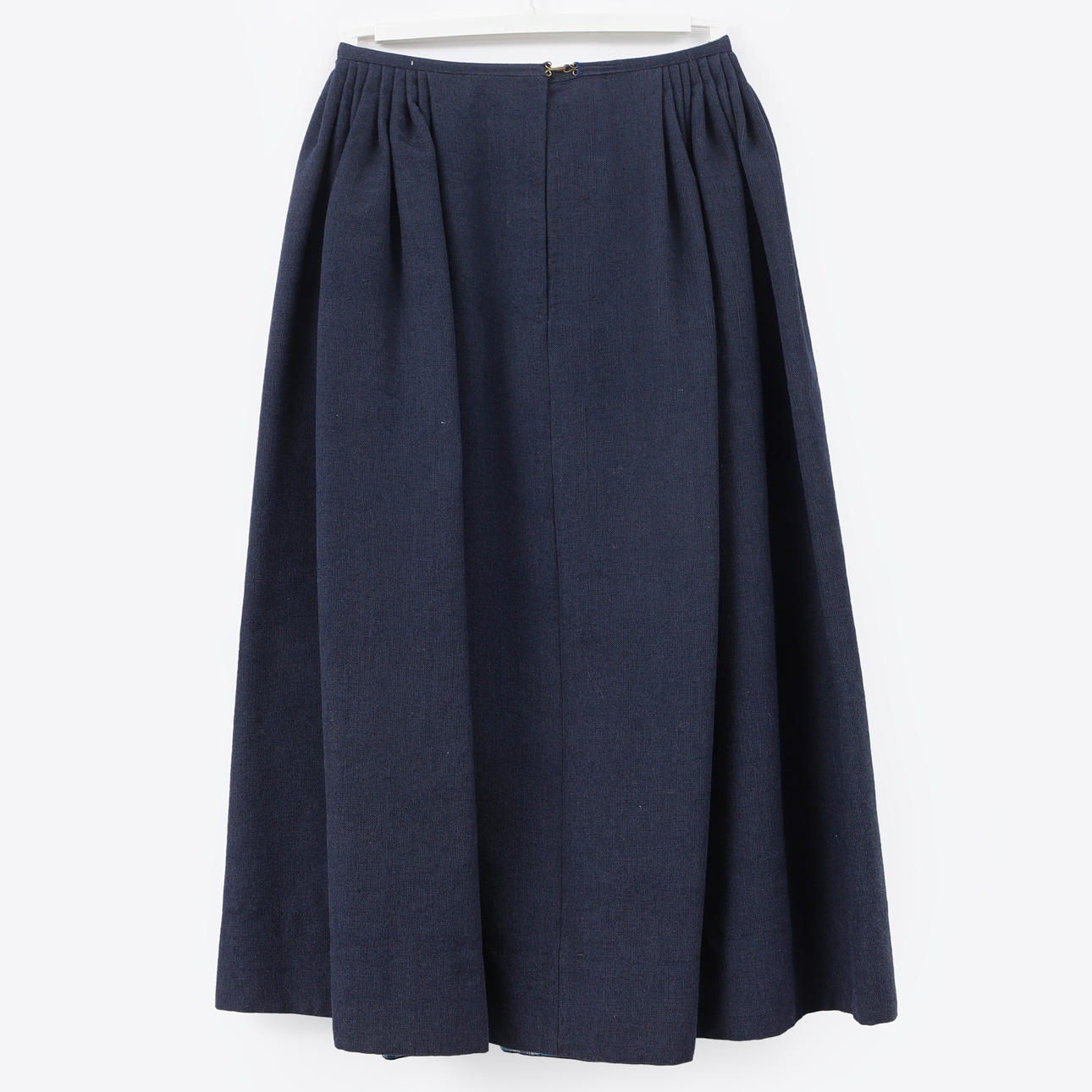 Liv med snörning samt hyska och hake, kjol samt dräktsmycke i silver. Livets rygglängd ca 38 cm, bystvidd ca 101 cm. Kjolens längd ca 91 cm, midjemått ca 74 cm.