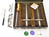 Låda med linser, provglasögon, Apparat med belysning, höjd 28 cm.