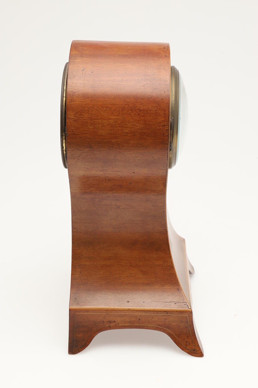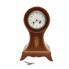 En edwardiansk mahognyballongformad mantelklocka, med en emalj urtavla med svarta siffror, med en pendel och nyckel. 32,5 cm hög.