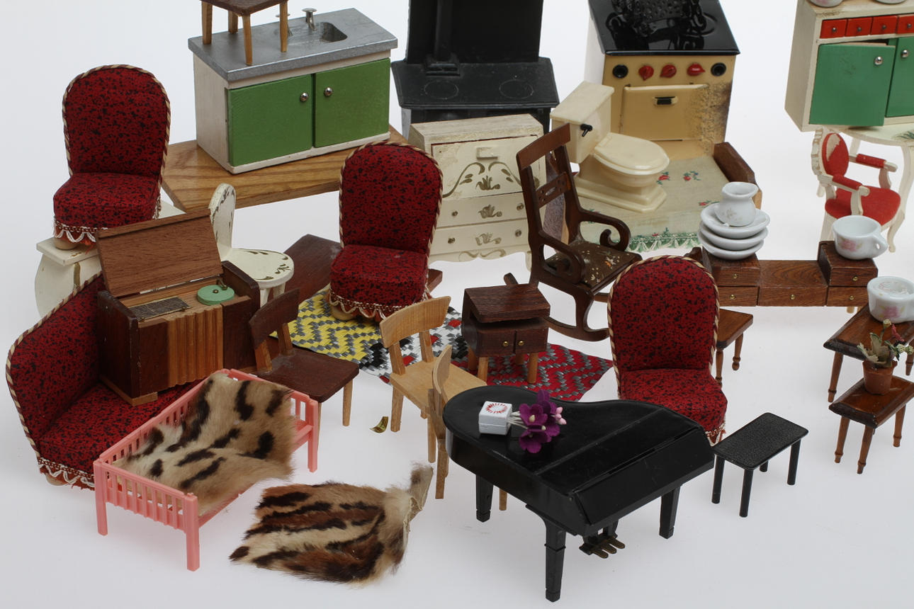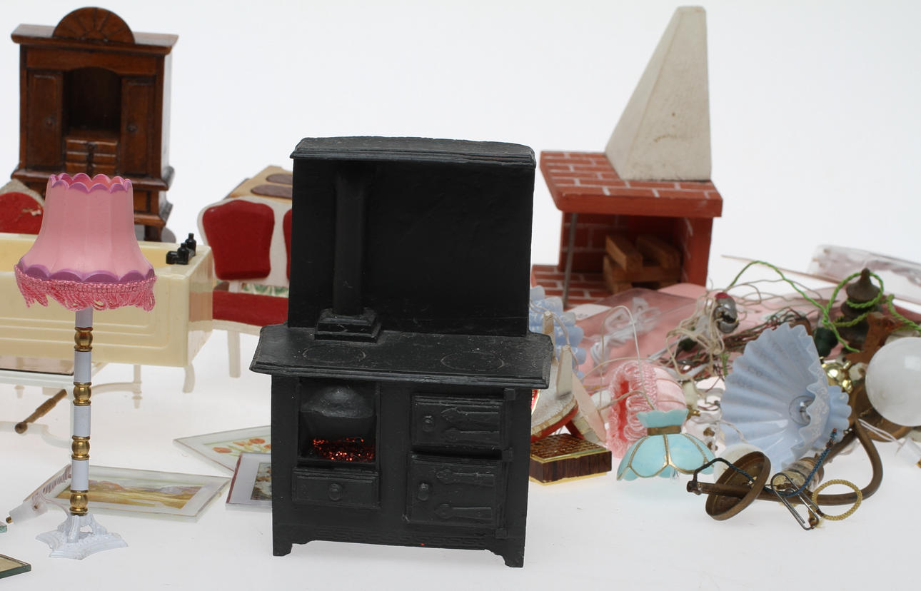 Dockskåpsmöbler bland andra Lerro och Lemeco, stolar, bord, köks- och badrumsutrustning. Vedspis i järn. Tre dockor medföljer.