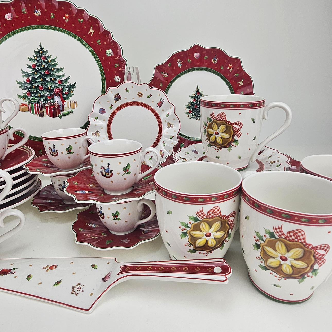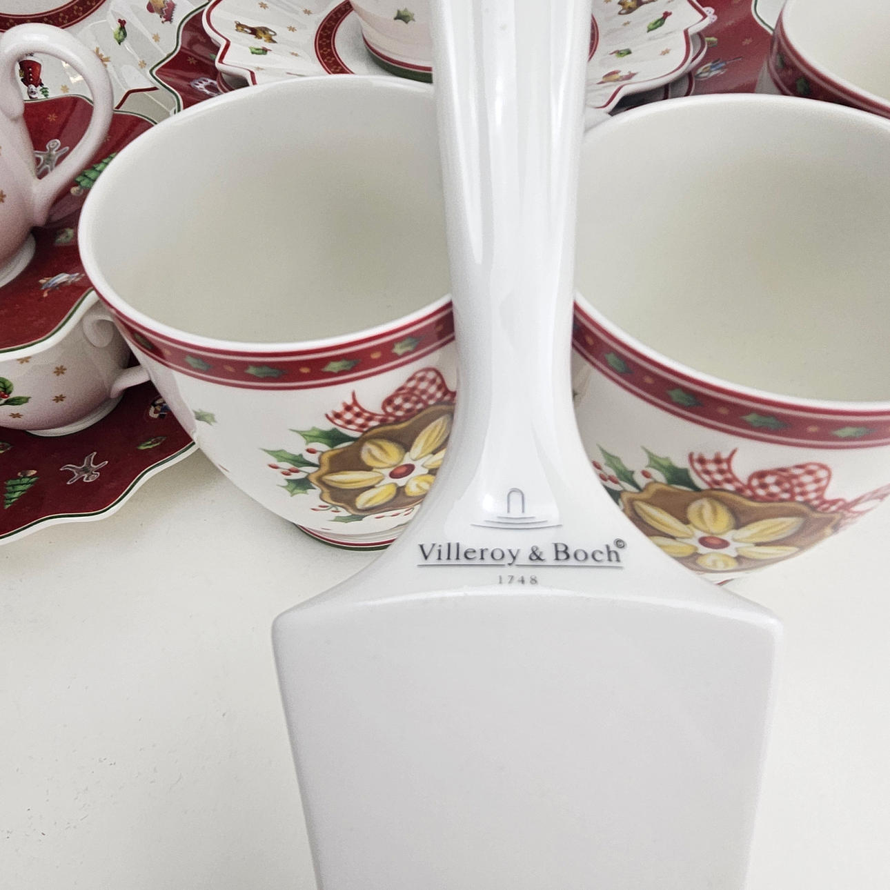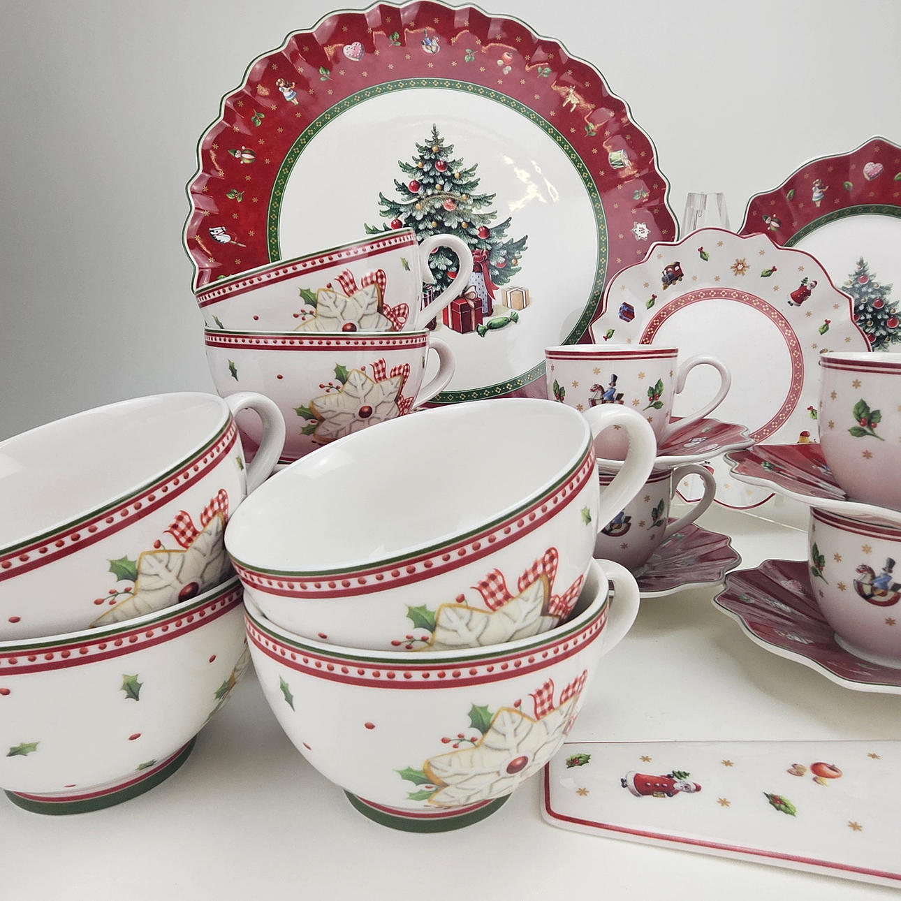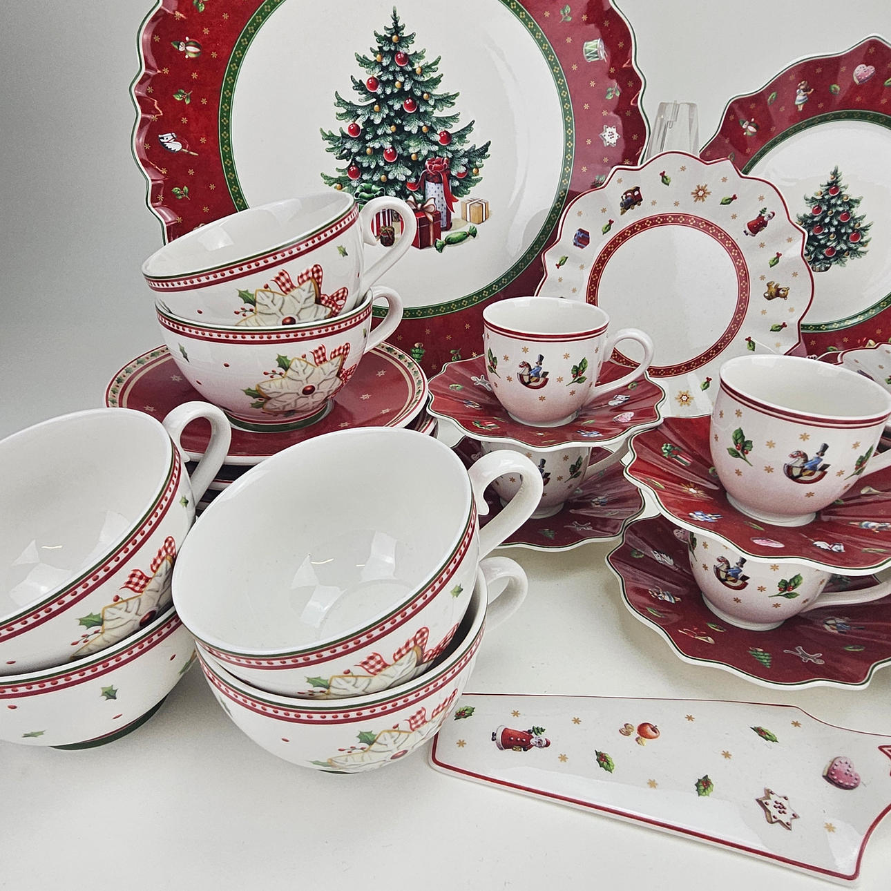 4 chokladmuggar, 4 glöggmuggar med fat, 6 tekoppar med fat, tårtfat, tårtspade, 4 assietter, 4 tallrikar(23 cm).