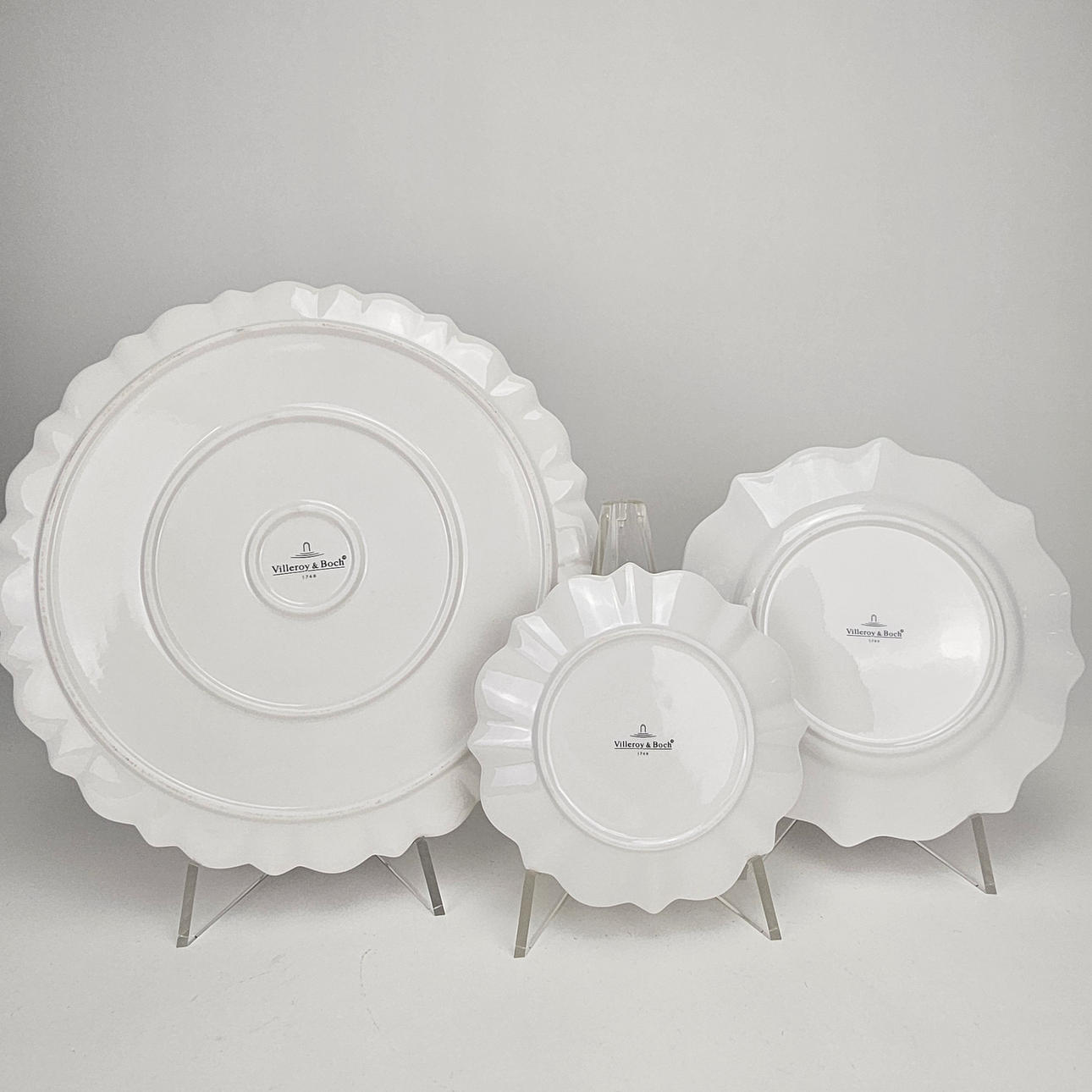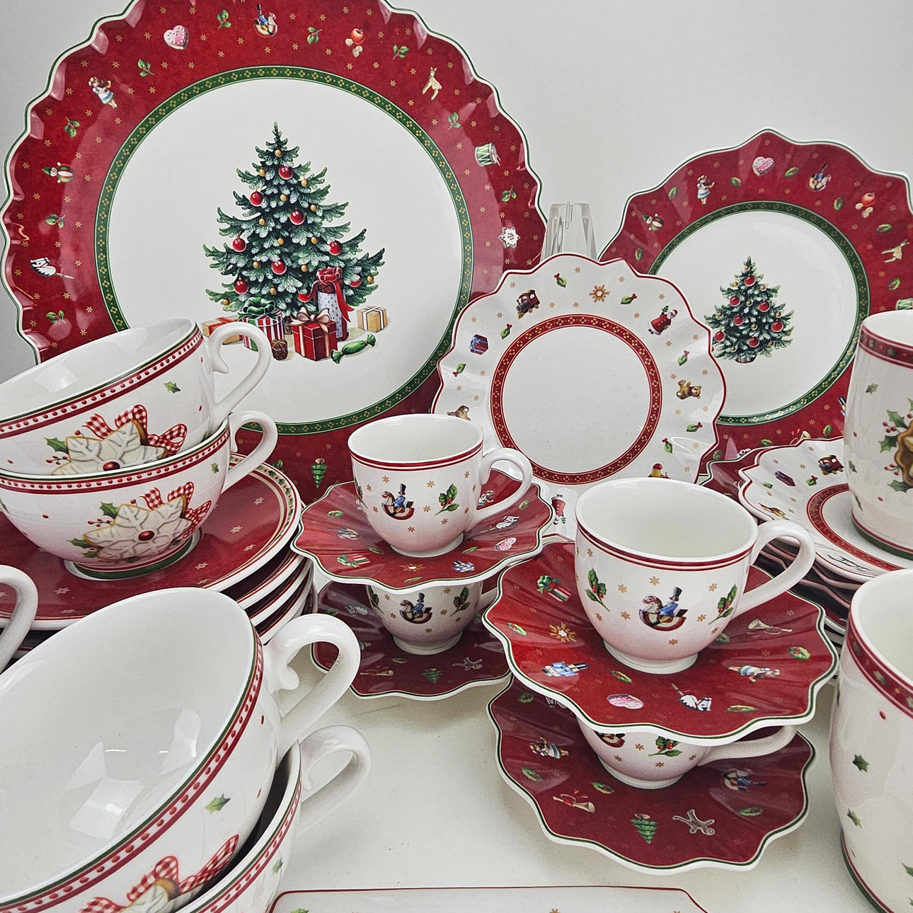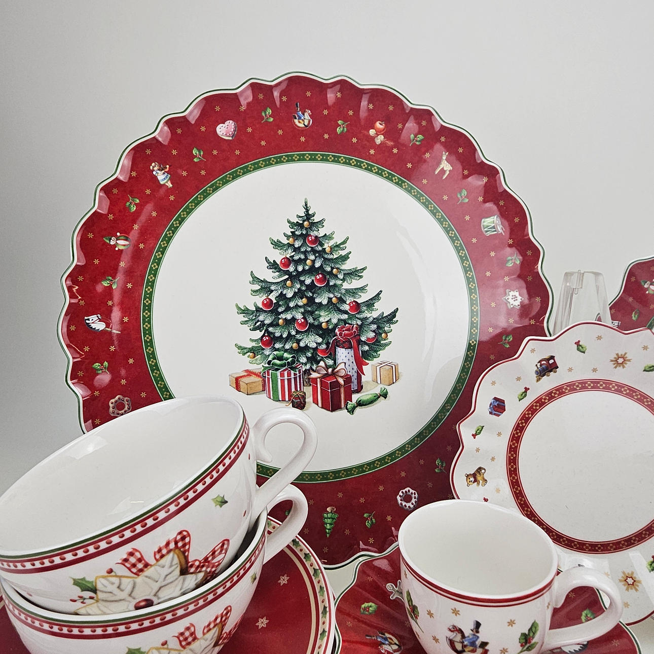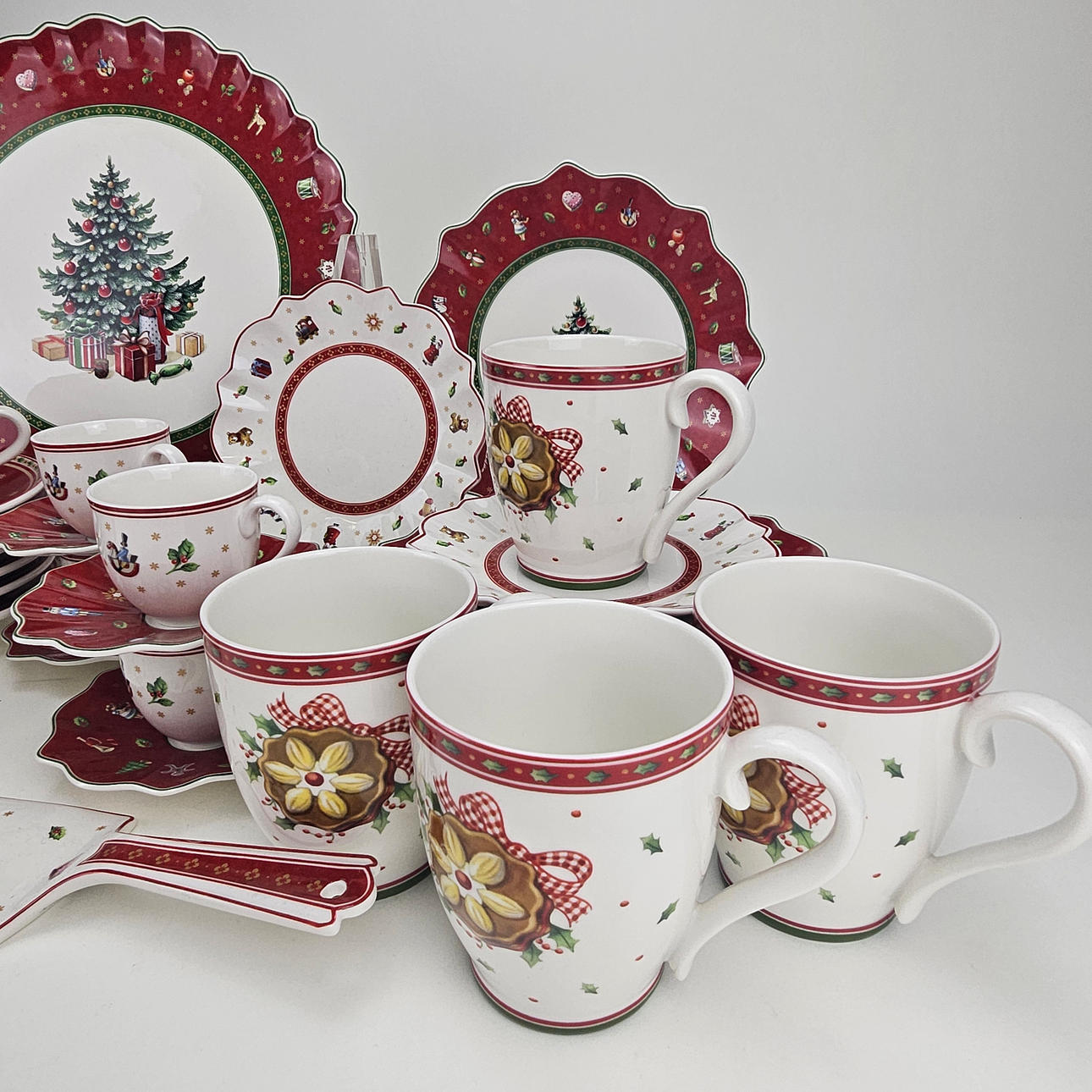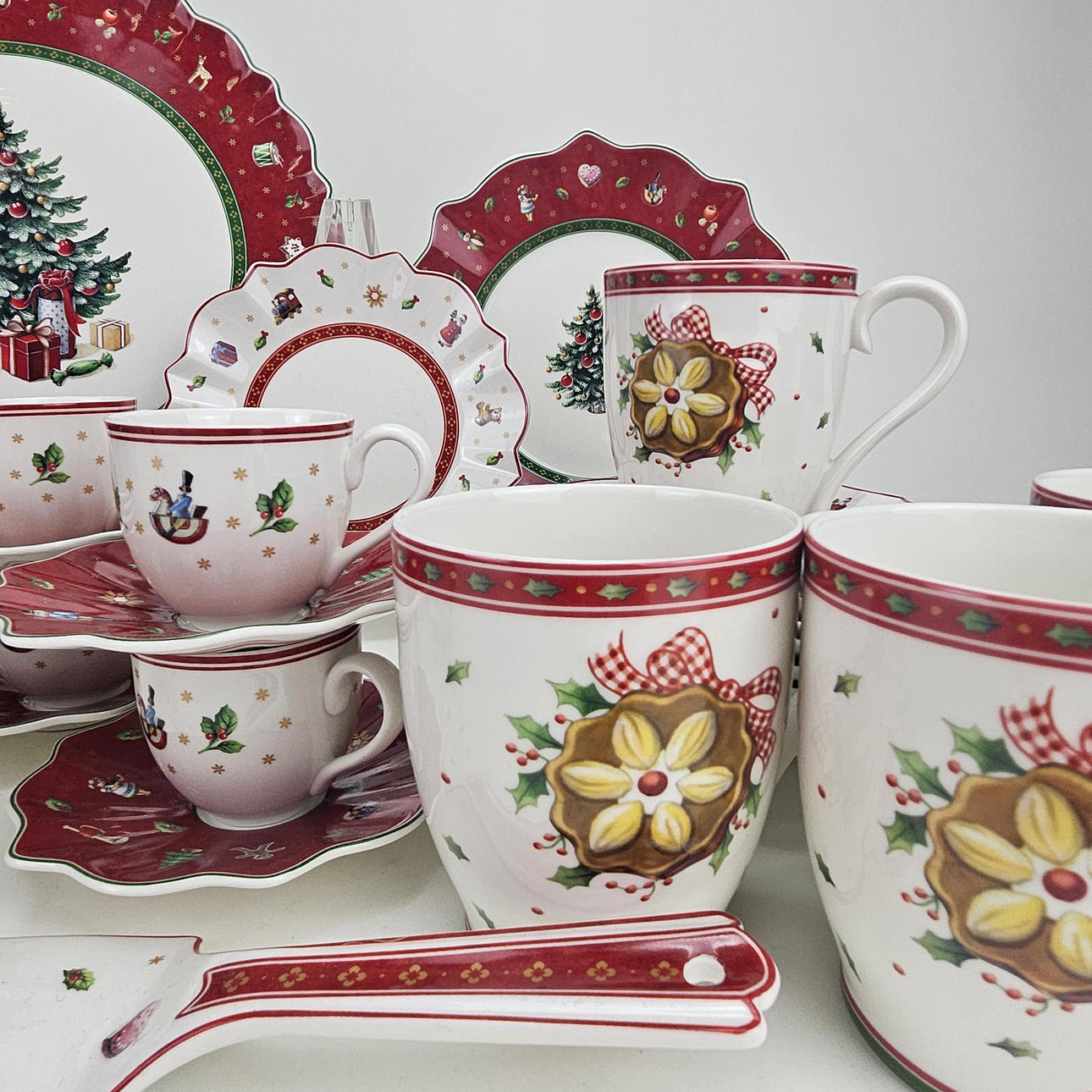 4 chokladmuggar, 4 glöggmuggar med fat, 6 tekoppar med fat, tårtfat, tårtspade, 4 assietter, 4 tallrikar(23 cm).