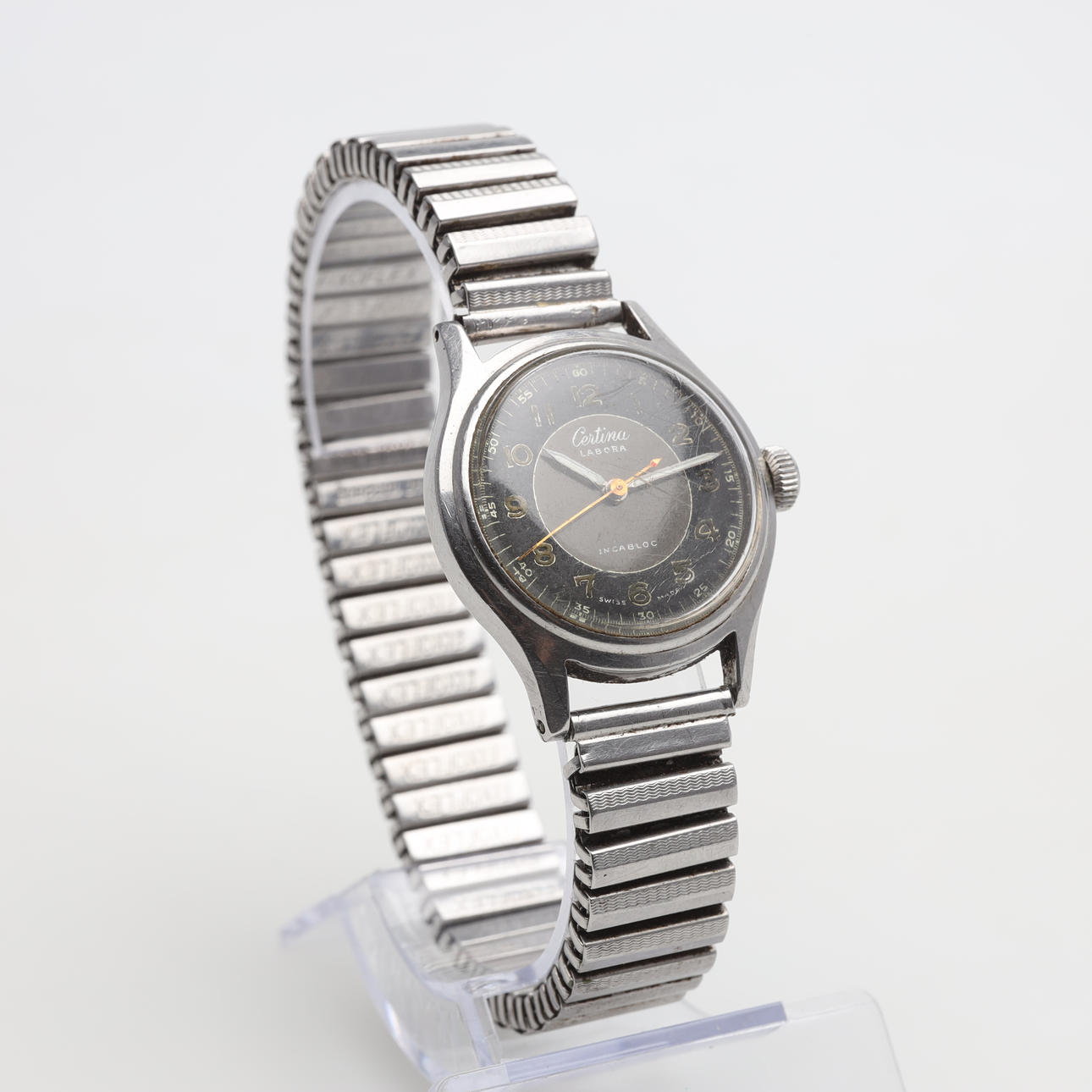 Bruksslitage, sliten urtavla, färgbortfall på siffror, repigt plastglas. Fungerade ej vid katalogiseringstillfället. Ingen funktionsgaranti lämnas.