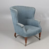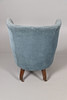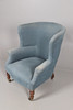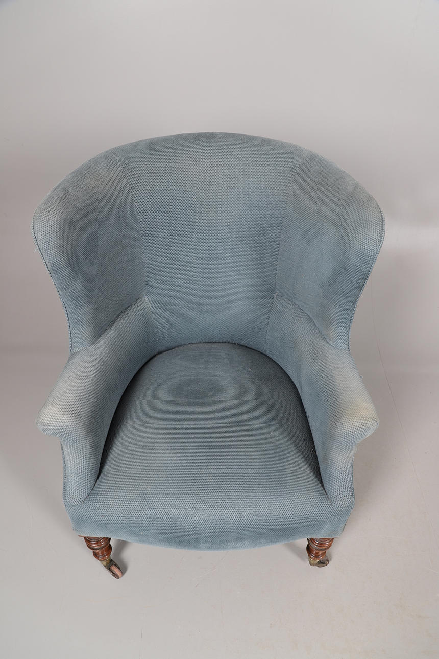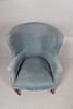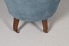 I en blå klädsel, på svängda stöd med mässingshjul. Sitthöjd 38cm.