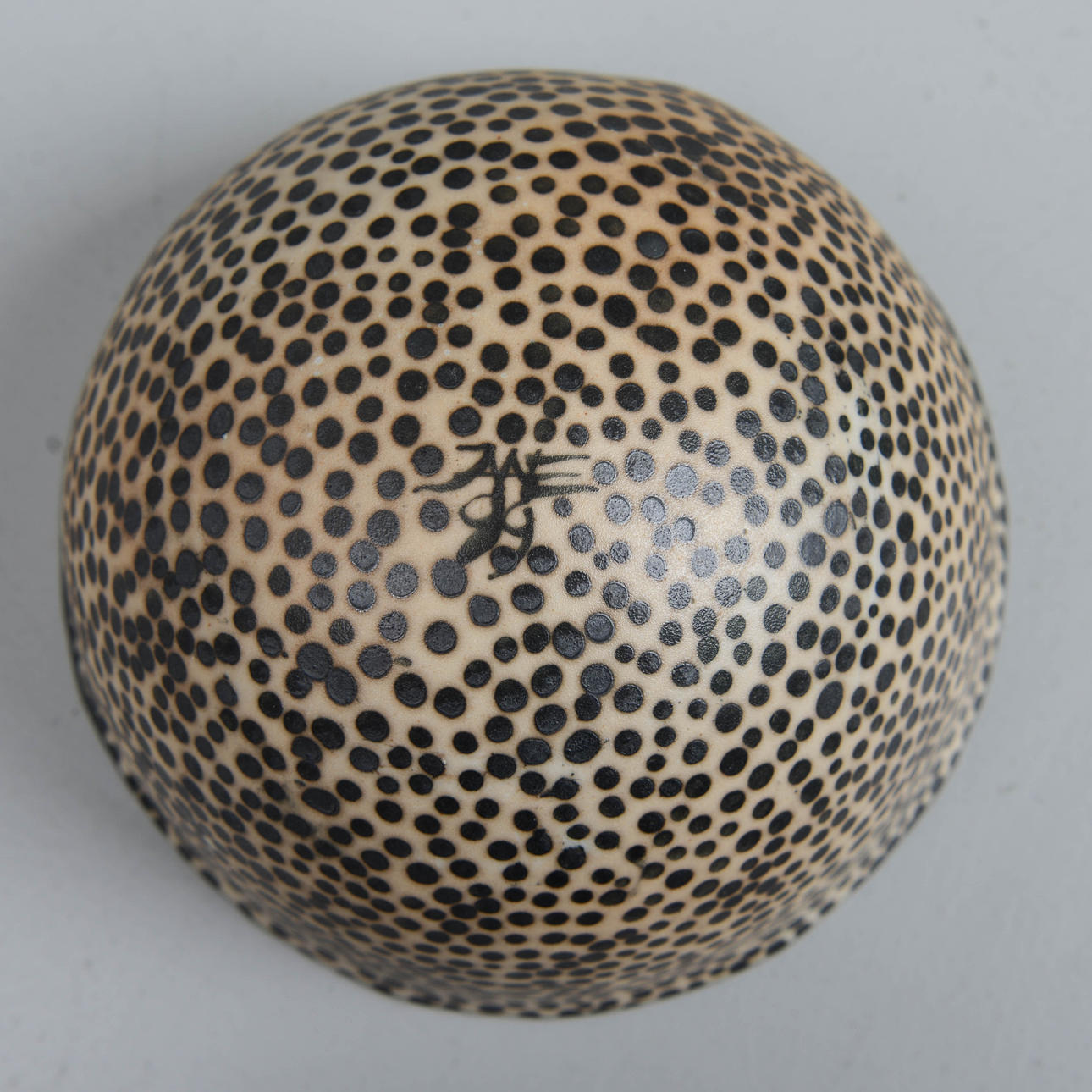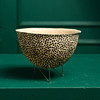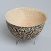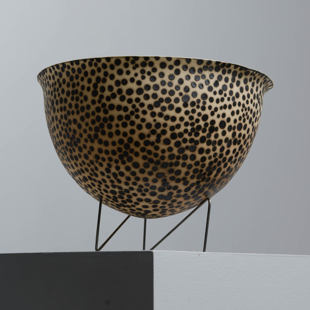 Signerad, daterad 99. Tunt stengods. Ställning i metall. Höjd, inklusive ställning 11 cm. Diameter 15 cm.