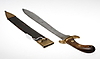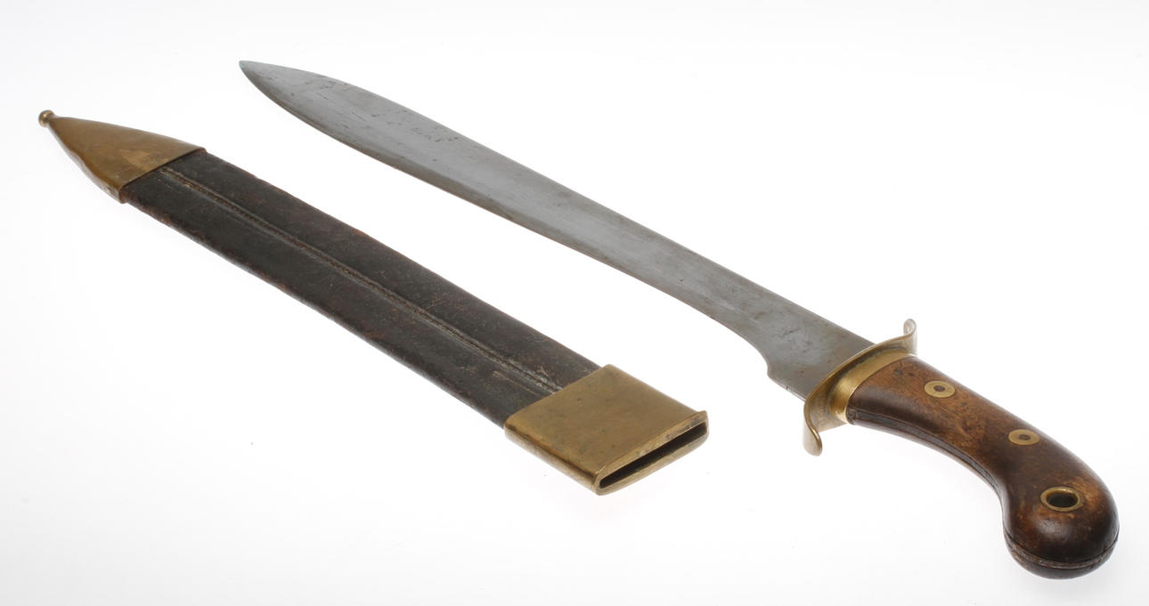 Läderbalja med mässingsbeslag. Längd ca. 58 cm.