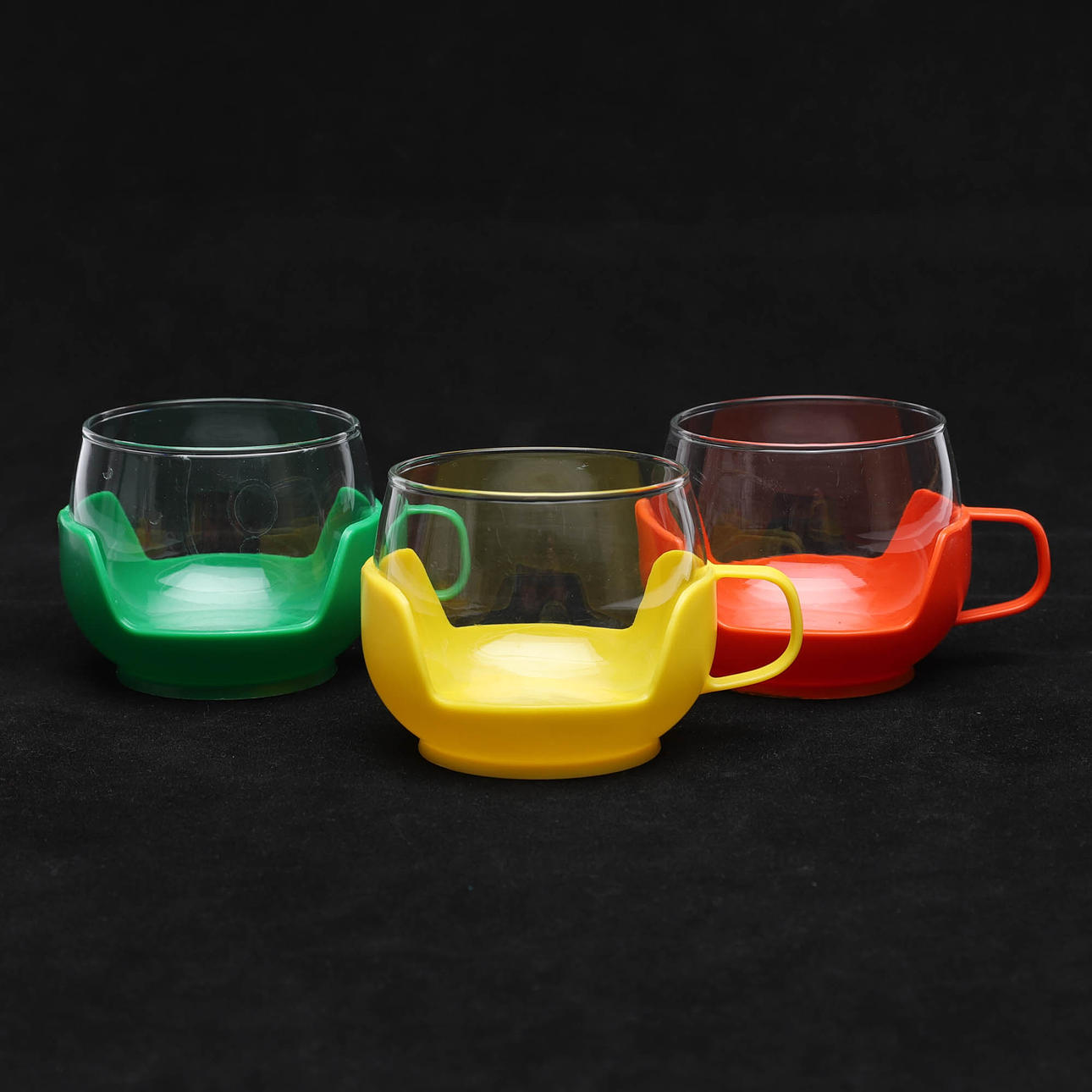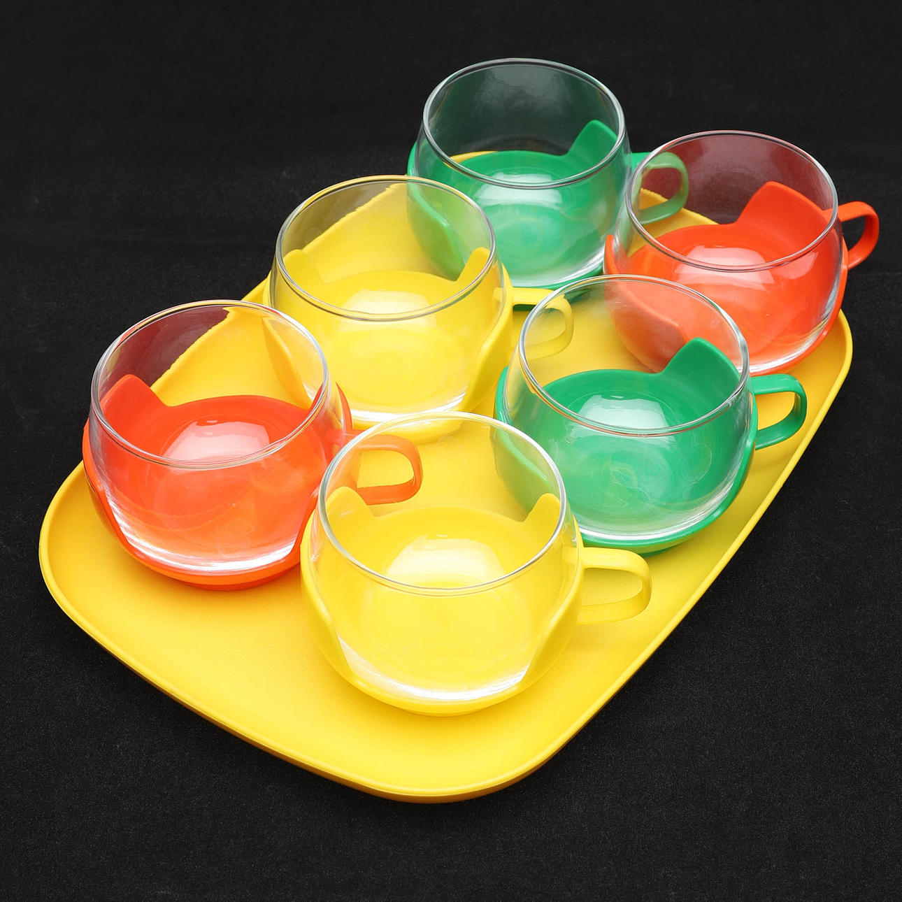 3823700. KAFFEMUGGAR / BRICKA, glas/plast, 1900-talets andra hälft.