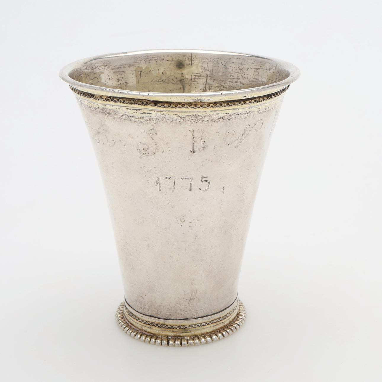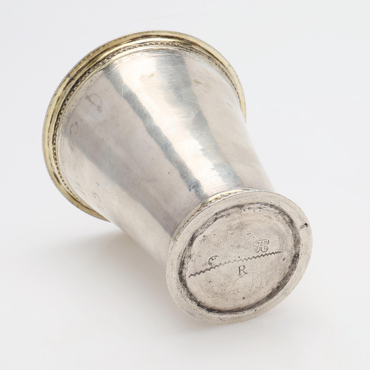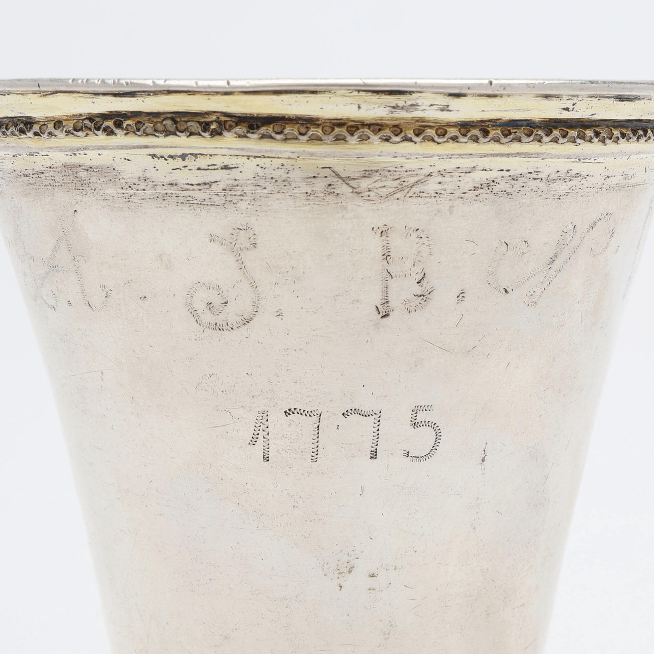 Utvändigt med spår av delvis förgyllning, invändigt förgylld, graverade monogram och datering 1775, höjd 9,5 cm, vikt 106 gram.