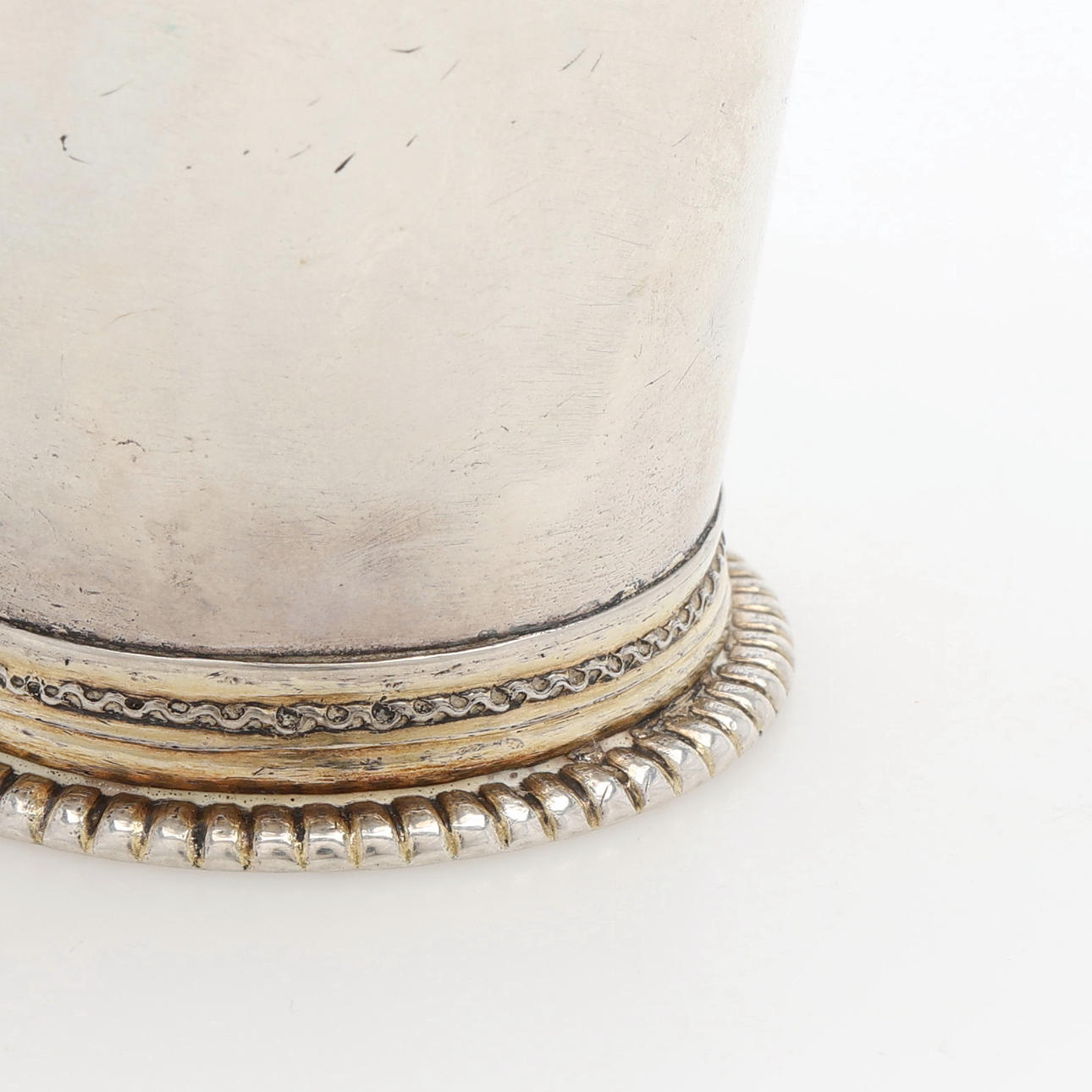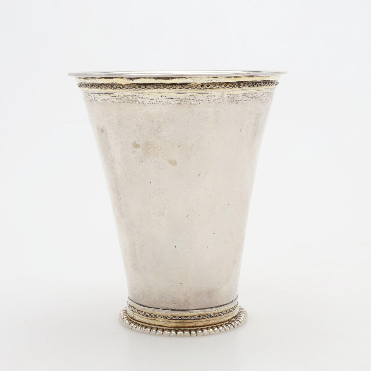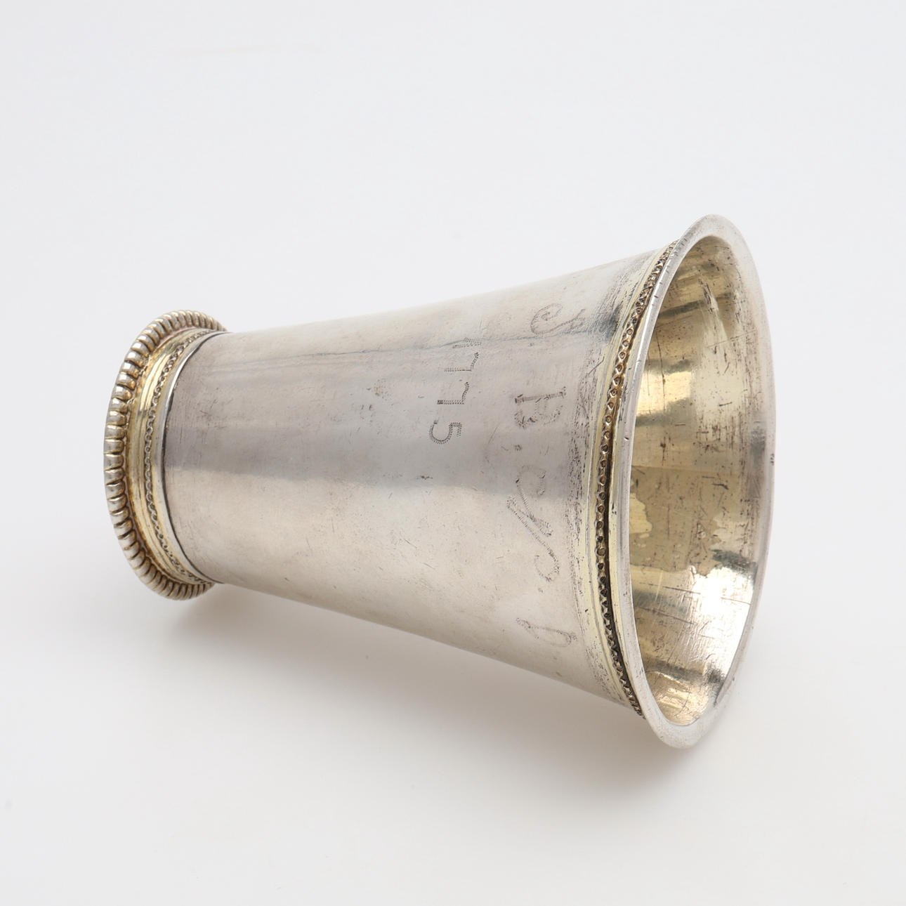 Utvändigt med spår av delvis förgyllning, invändigt förgylld, graverade monogram och datering 1775, höjd 9,5 cm, vikt 106 gram.