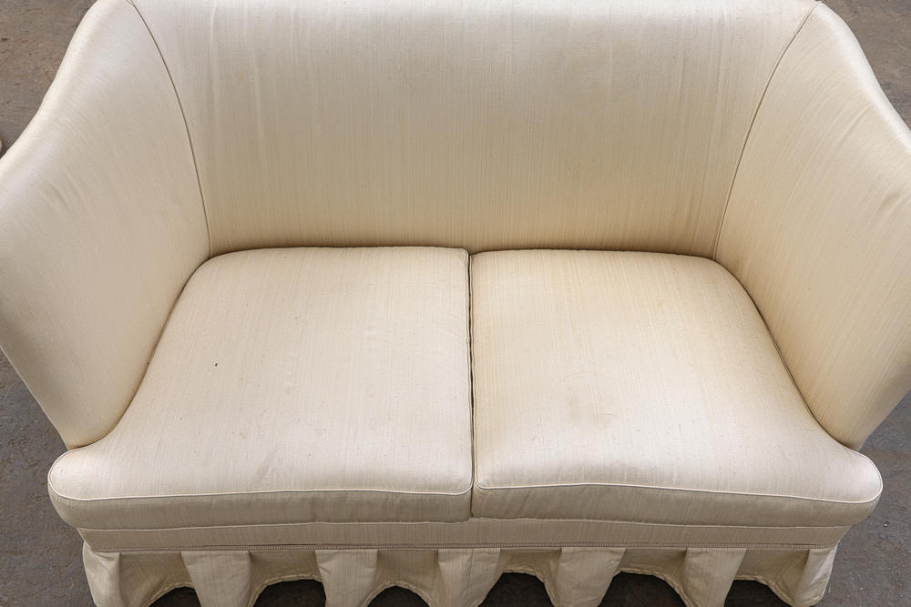 Slitage, fläckar & missfärgningar. Bitvis lösa kantband.